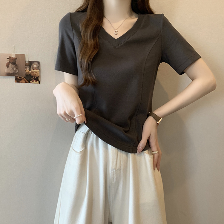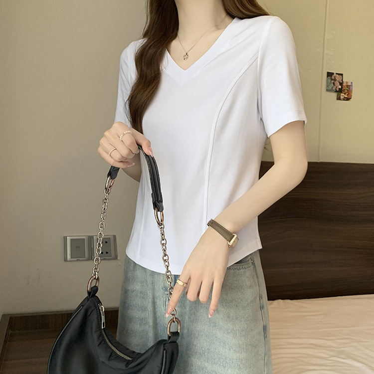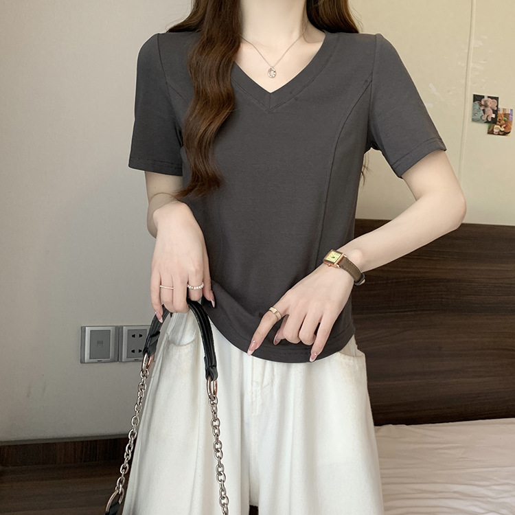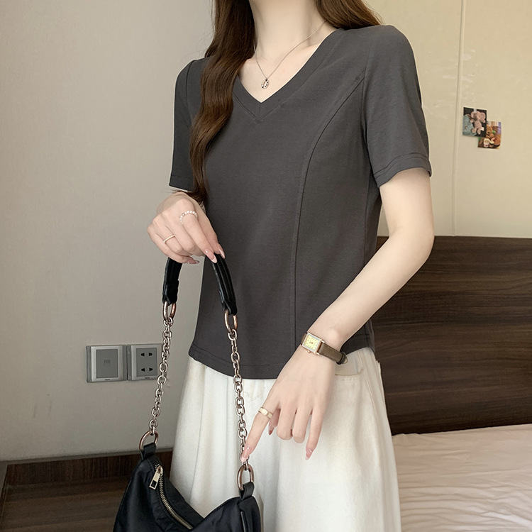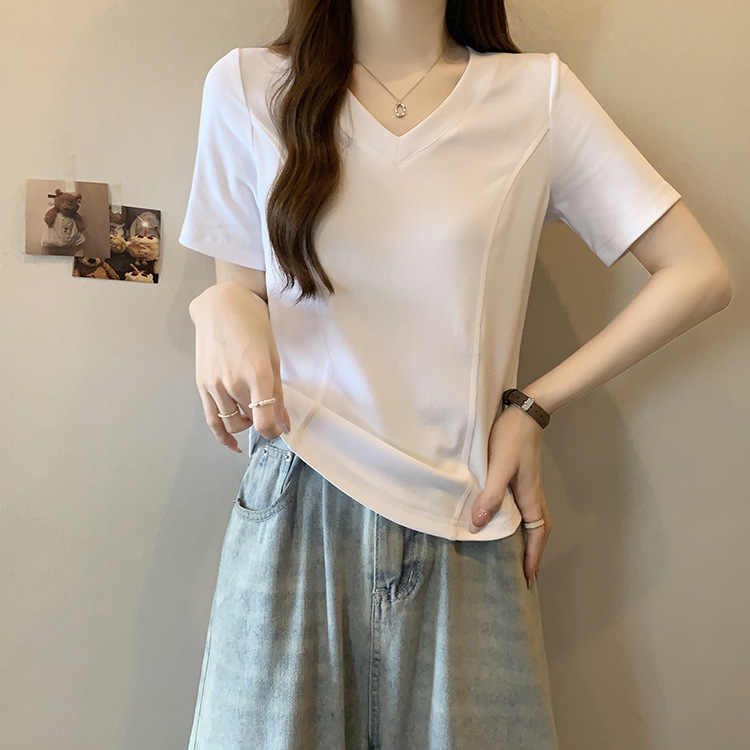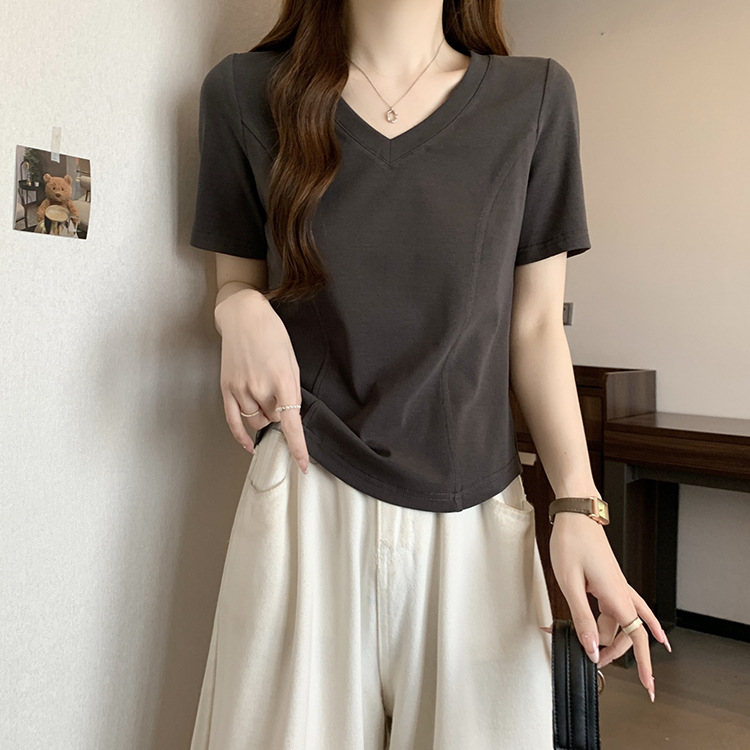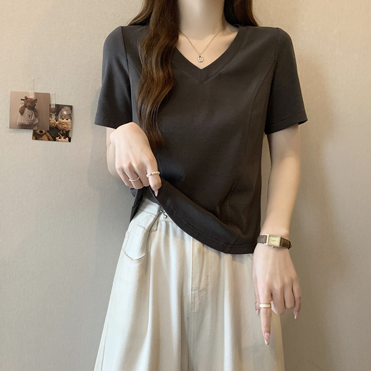 2026 여름 기본 스타일 슬리밍 솔리드 컬러 슬림핏 피쉬본 V넥 어깨라인 불규칙 반팔 티셔츠 여성 신상 상의