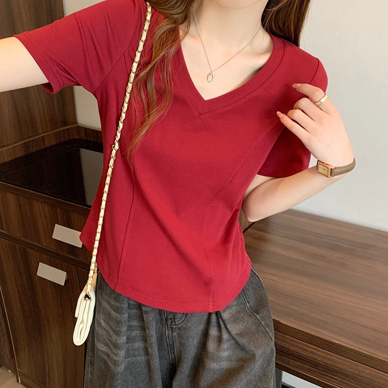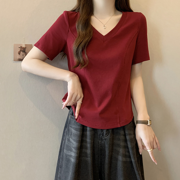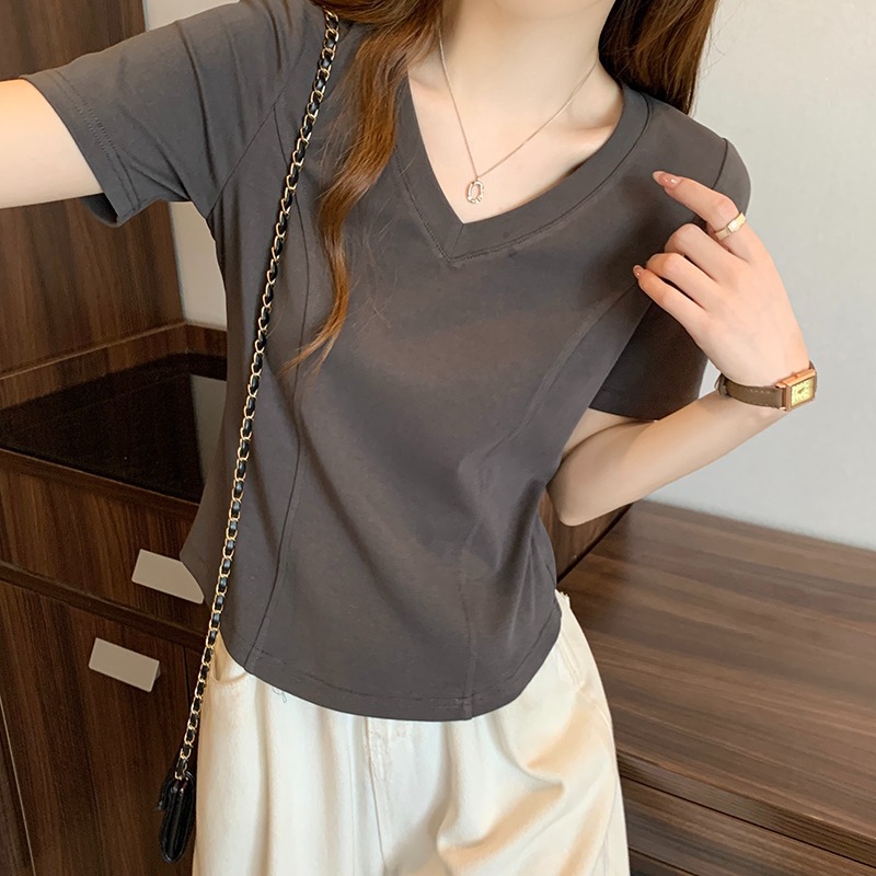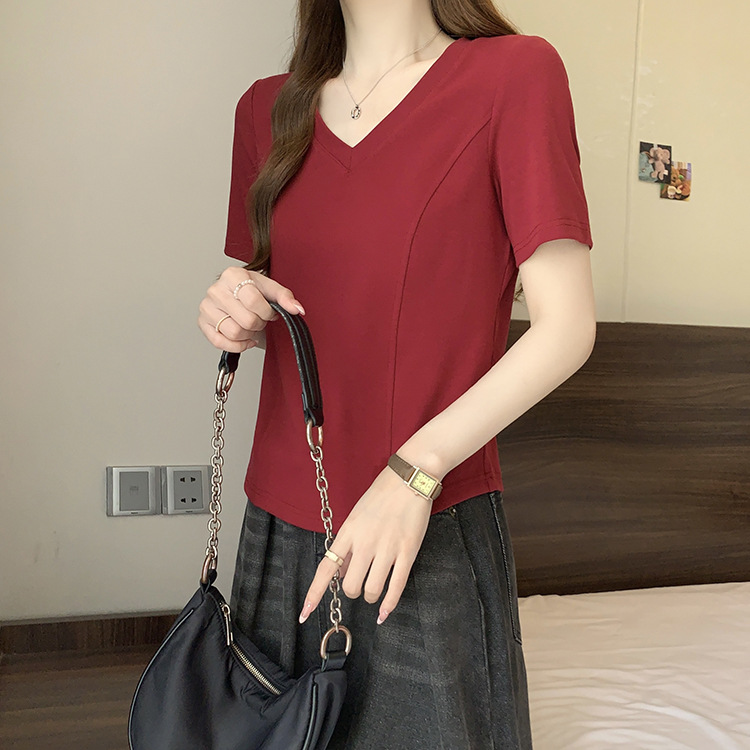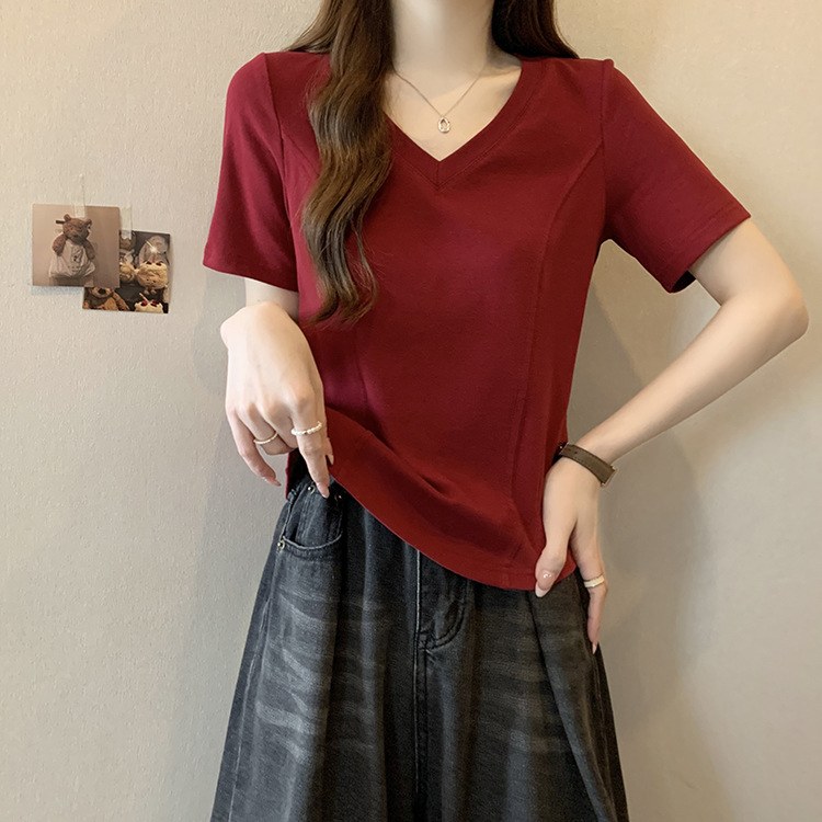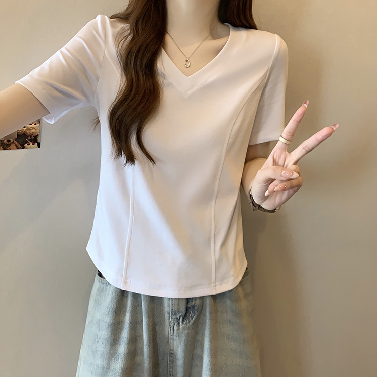 2026 여름 기본 스타일 슬리밍 솔리드 컬러 슬림핏 피쉬본 V넥 어깨라인 불규칙 반팔 티셔츠 여성 신상 상의