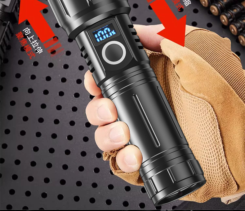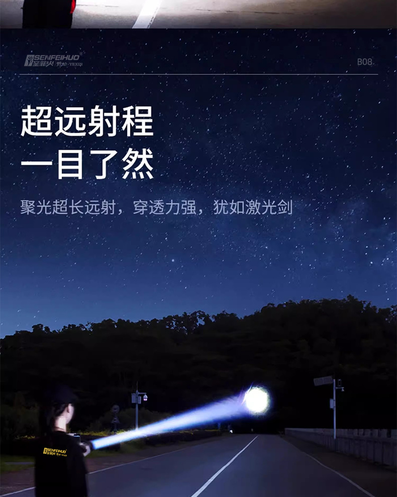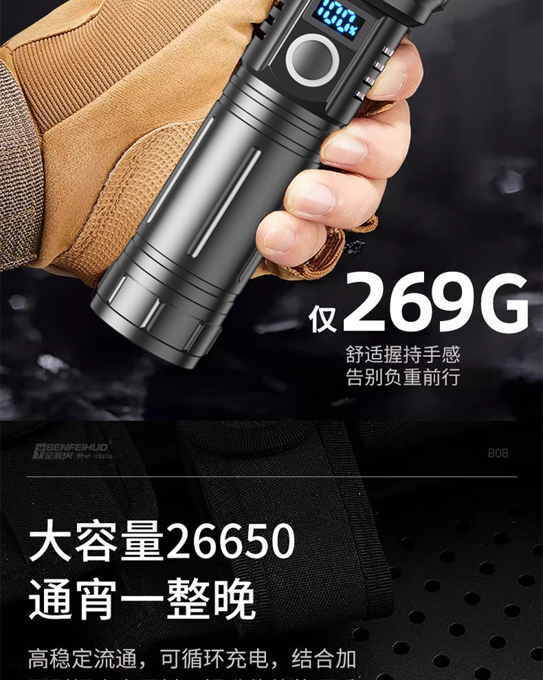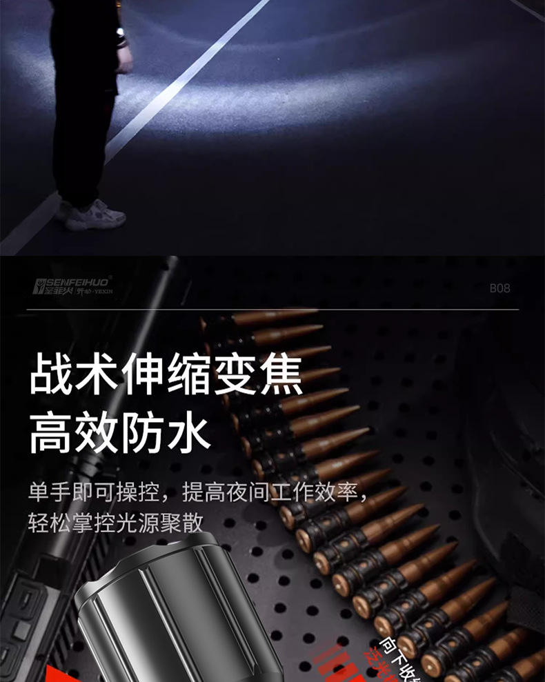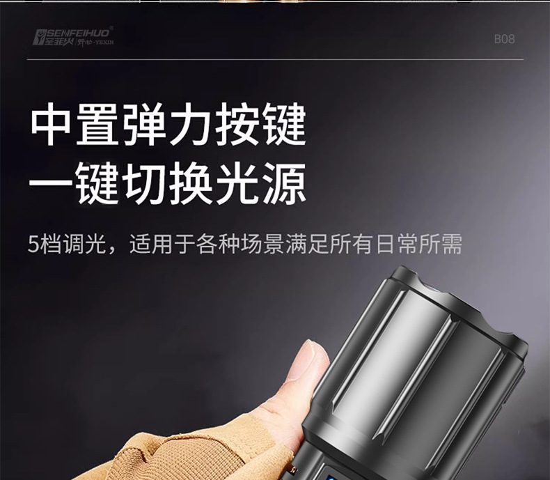 档位:5档,强光-中光-弱光-爆闪-SOS,任意档位长按3秒关闭