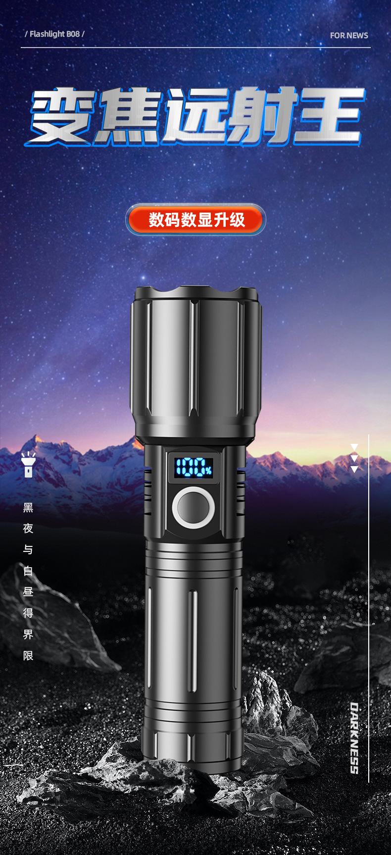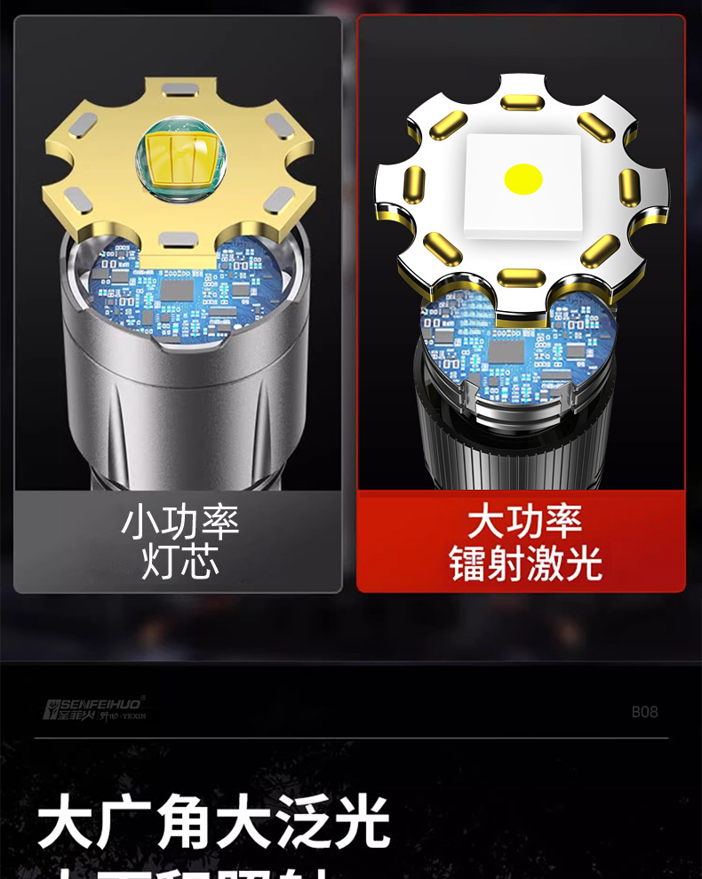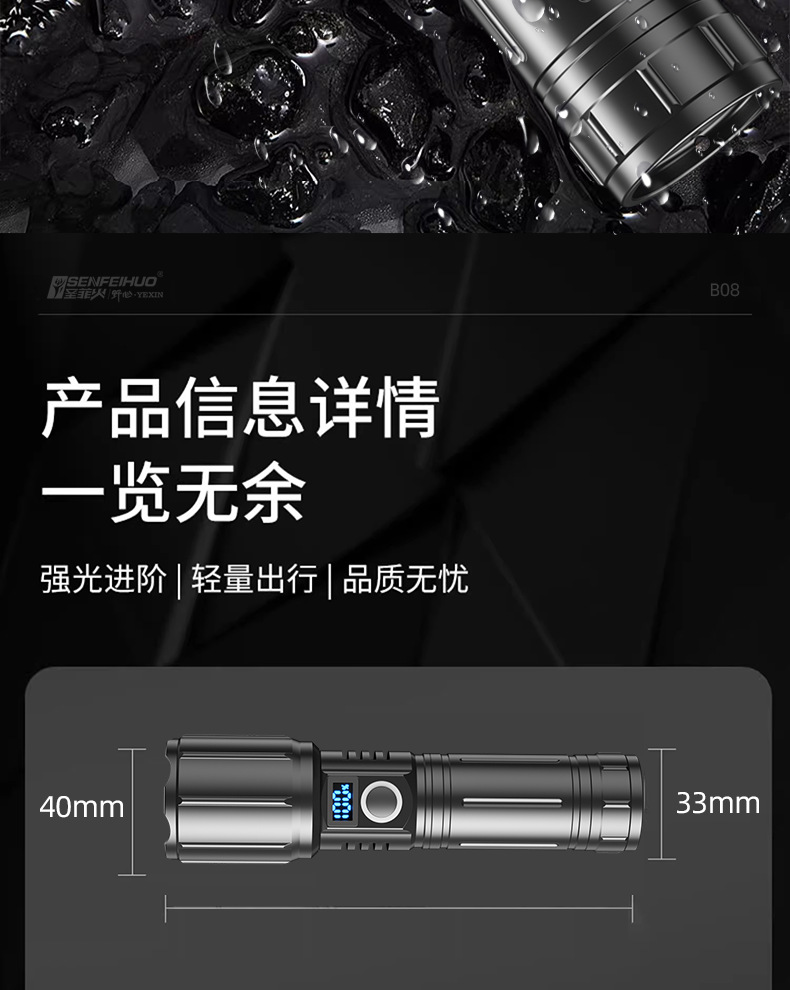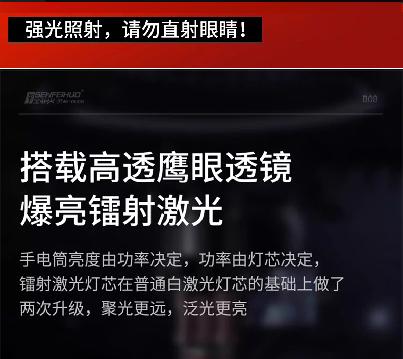档位:5档,强光-中光-弱光-爆闪-SOS,任意档位长按3秒关闭