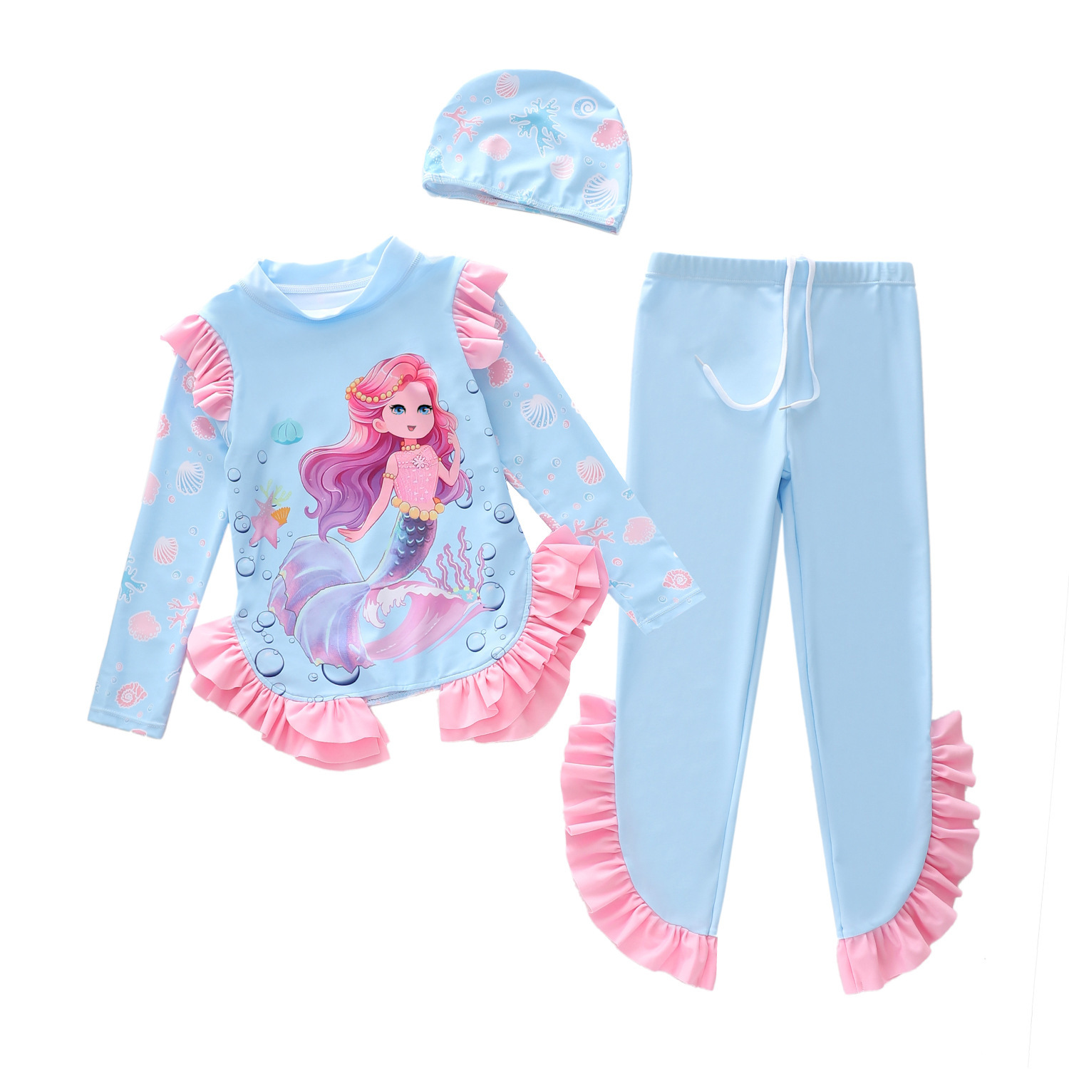 새로운 어린이 수영복 걸스 새로운 러플 수영복 소형, 중형 및 대형 어린이 분할 긴 소매 바지 선스크린 수영복스토어 가기