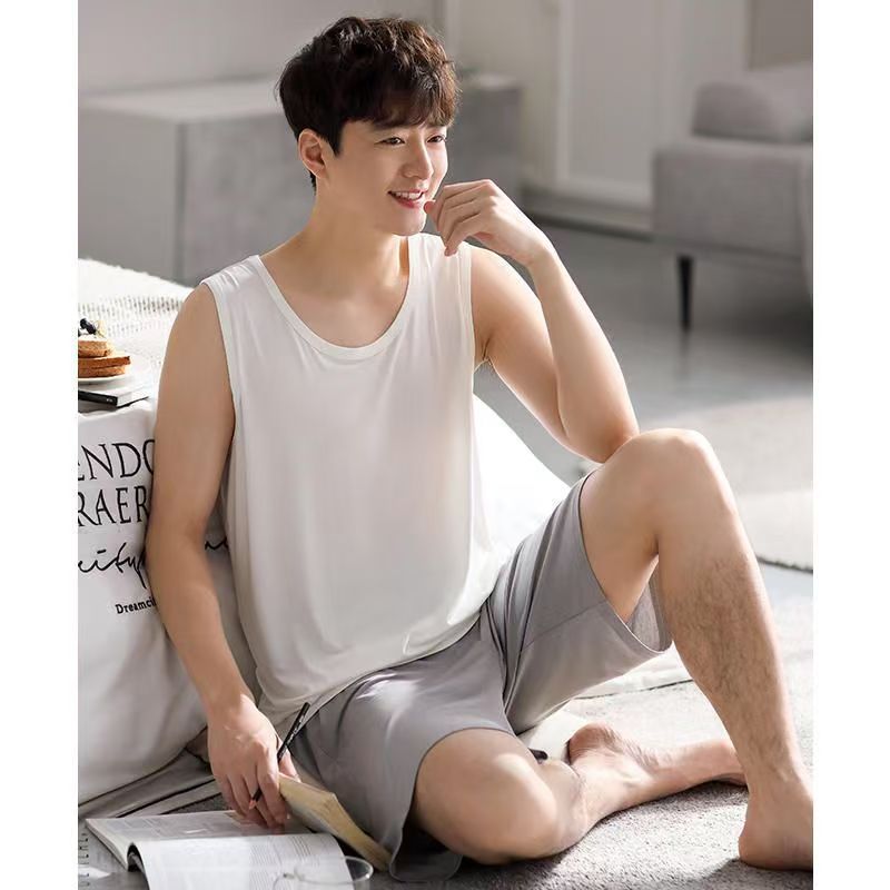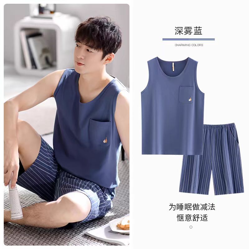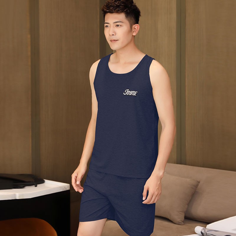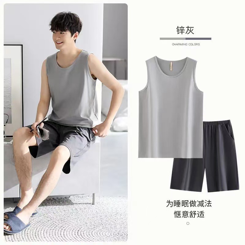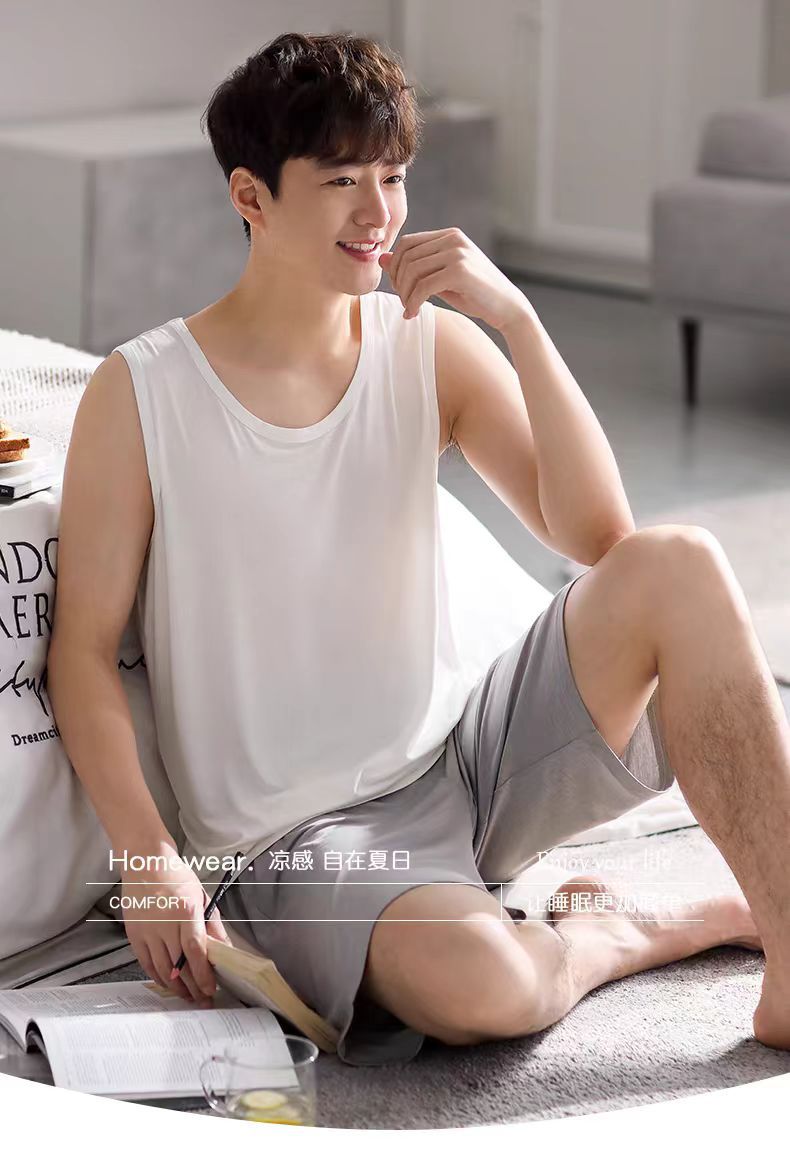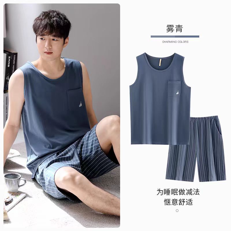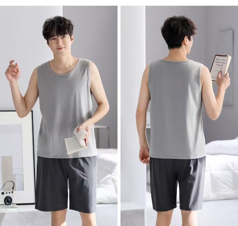 남자 여름 조끼 홈 세트 캐주얼 스포츠 파자마 반바지 면 편안한 청소년 얇은 외부 착용