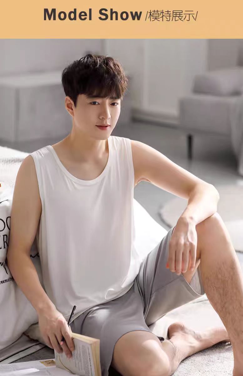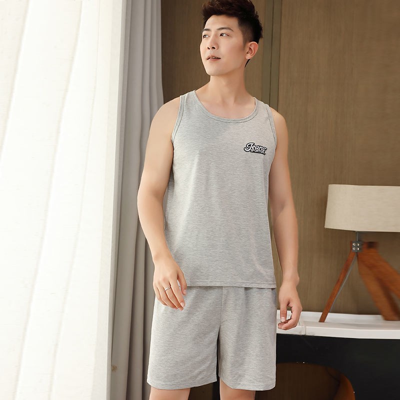 남자 여름 조끼 홈 세트 캐주얼 스포츠 파자마 반바지 면 편안한 청소년 얇은 외부 착용스토어 가기