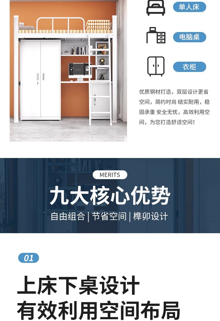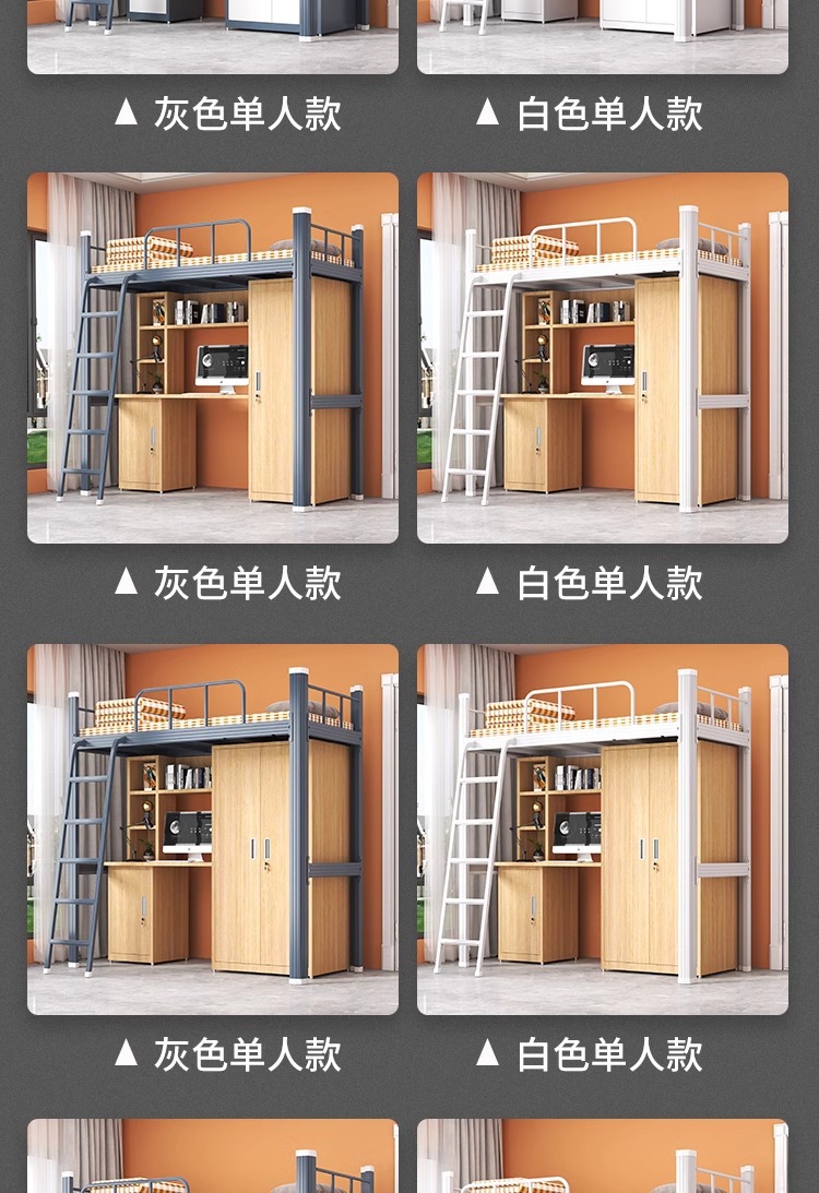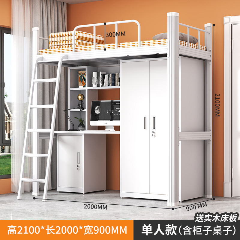 • 순백색 고급 싱글 침대 (철제 옷장 + 원목 침대판 + 데스크탑 + 책장 + 테이블 밑 수납장)