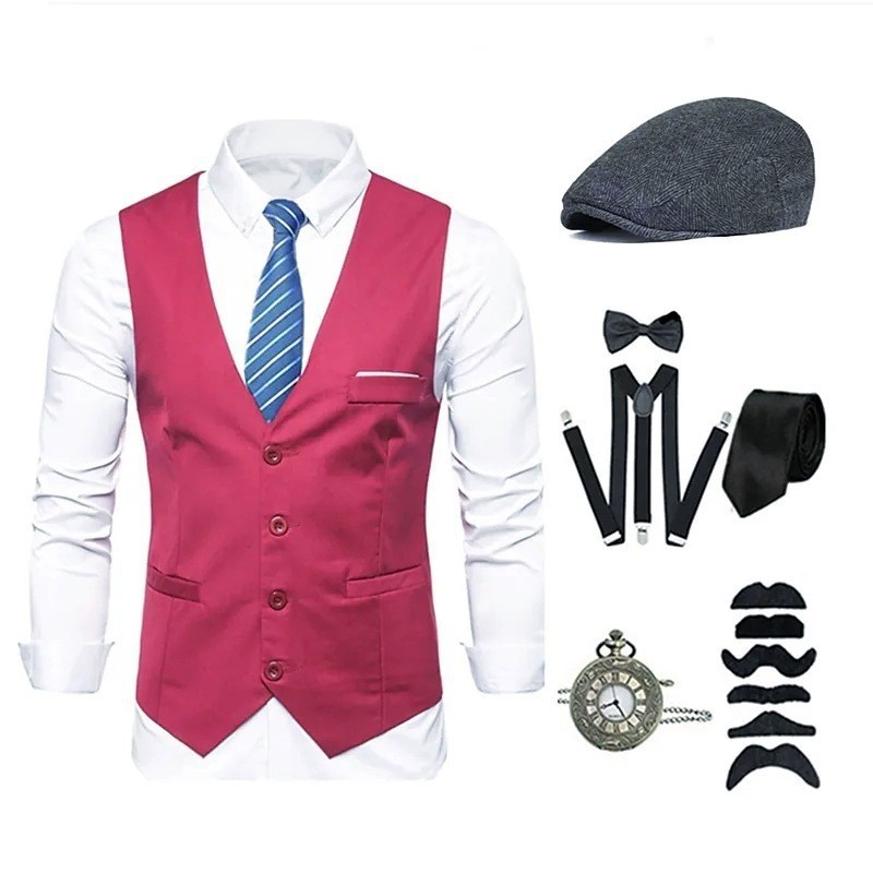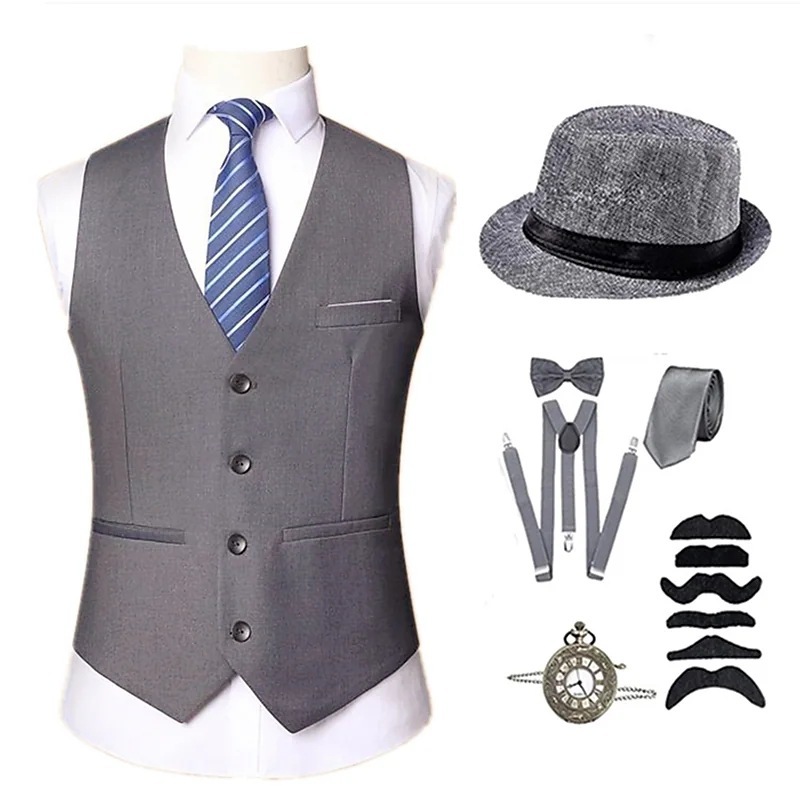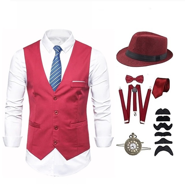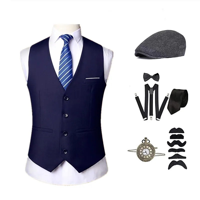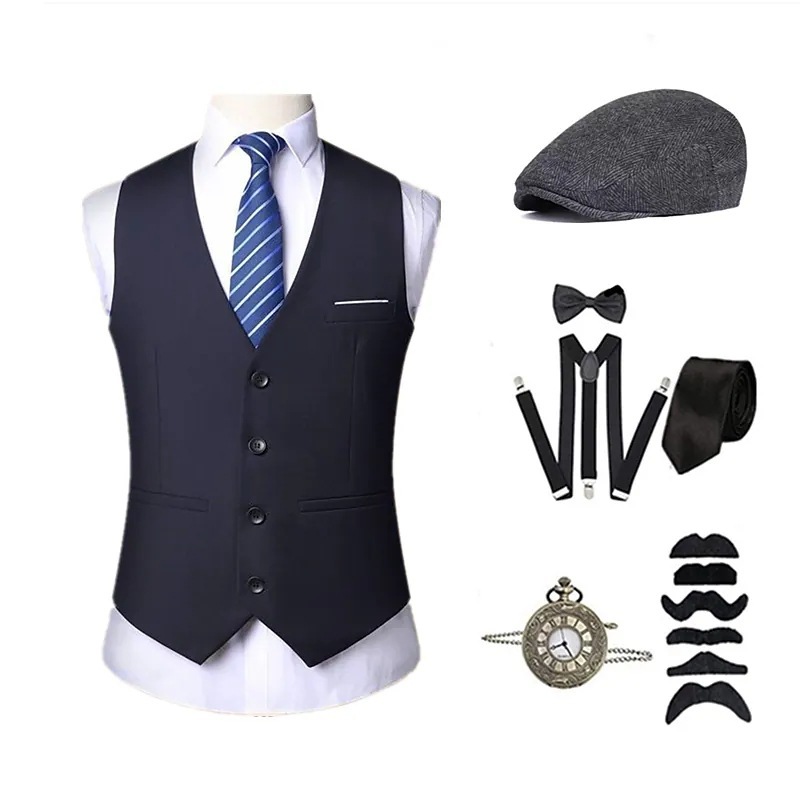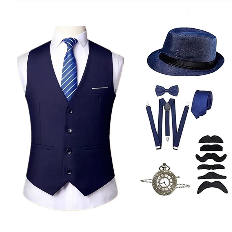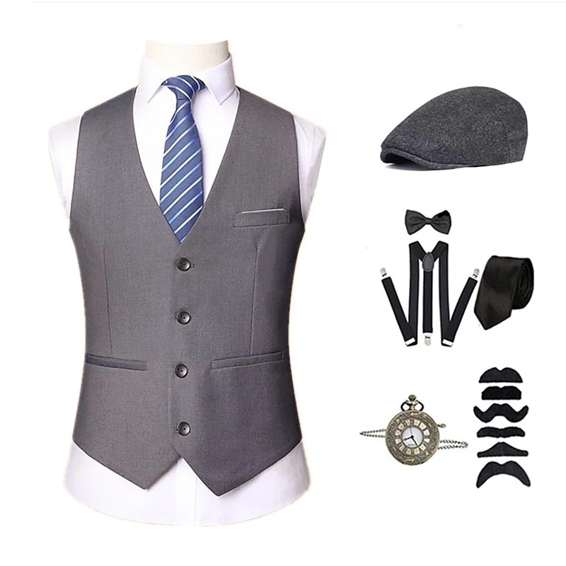 1920S 빈티지 개츠비 디너 원피스 성인 공 남자 조끼 모자 포켓 시계 타이 세트