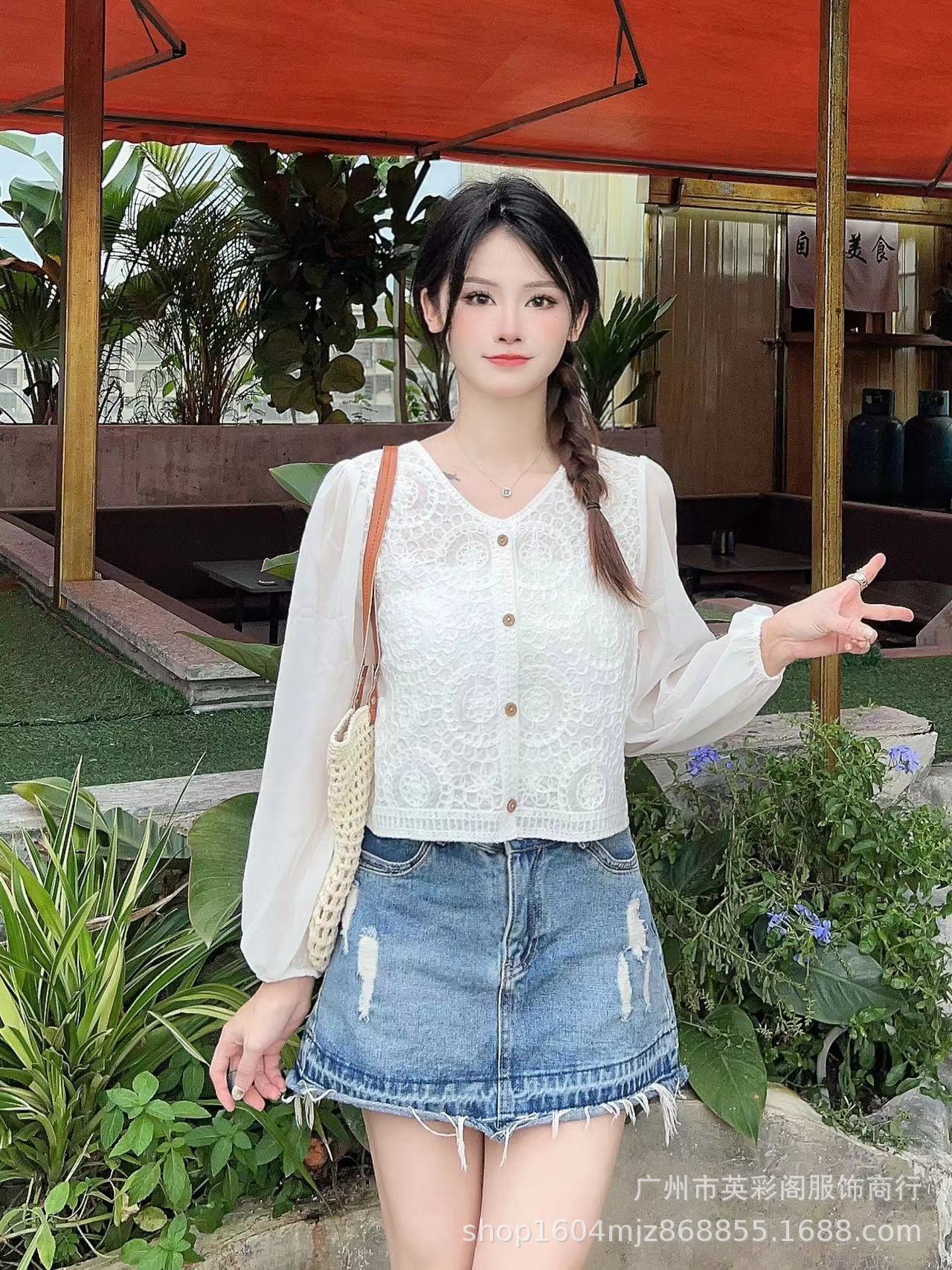 이른 가을 새로운 한국 크로 셰 V 넥 쉬폰 셔츠 여성 디자인 틈새 달콤한 올매치 느슨한 짧은 셔츠스토어 가기