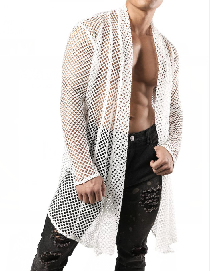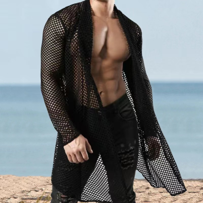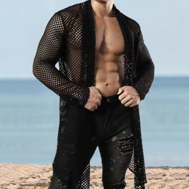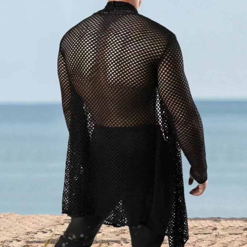 대외 무역 의류 섹시한 남성 플러스 사이즈 목도리 할로우 중장 카디건 메시 관점 긴팔 셔츠 톱 남성스토어 가기