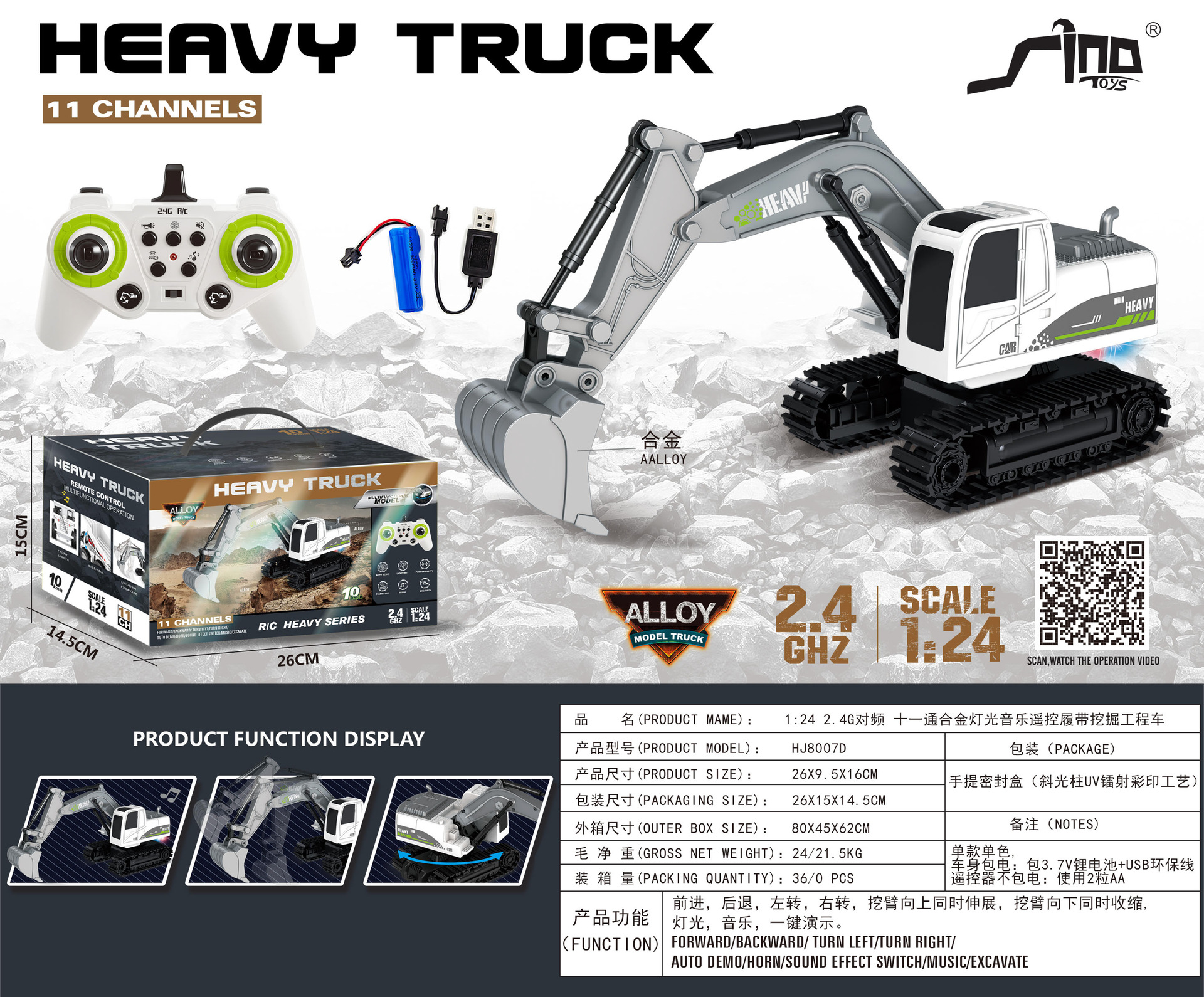 HJ8007D 1:24 2.4G 十一通合金灯光音乐遥控履带挖掘工程车 (挖斗合金)