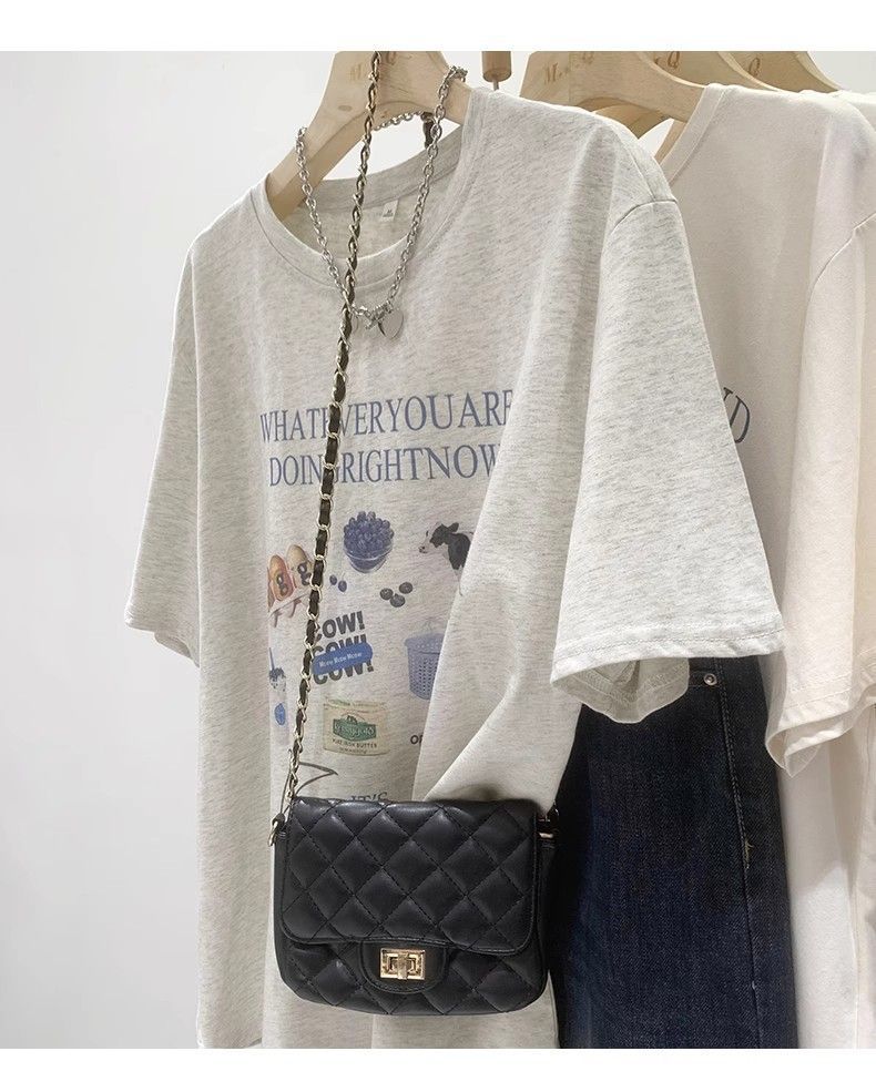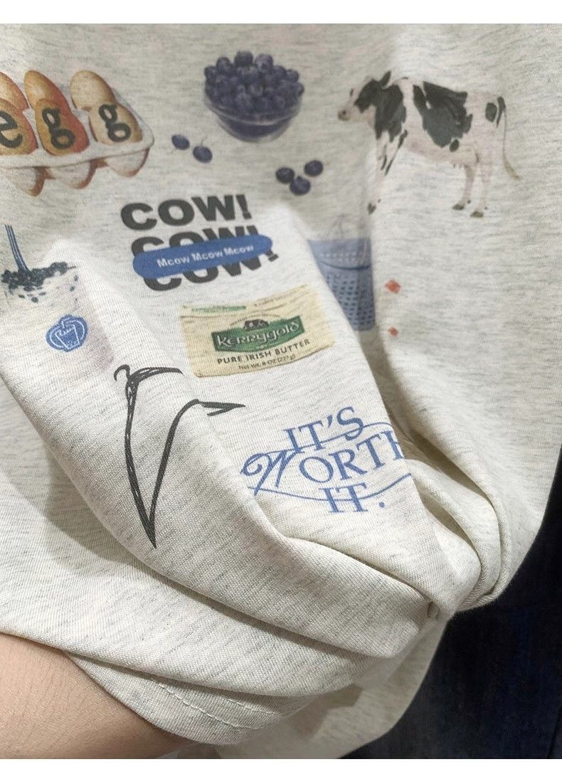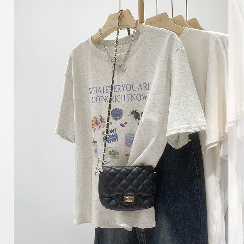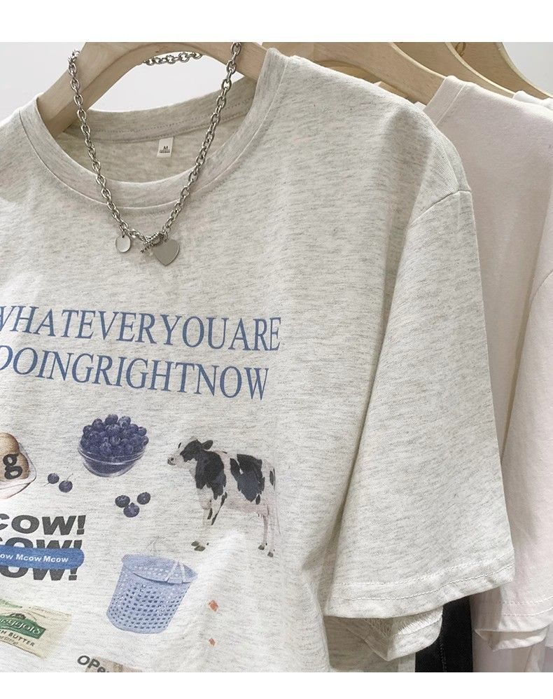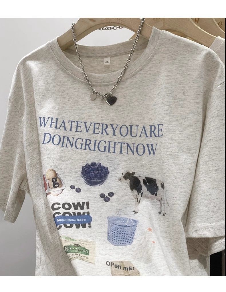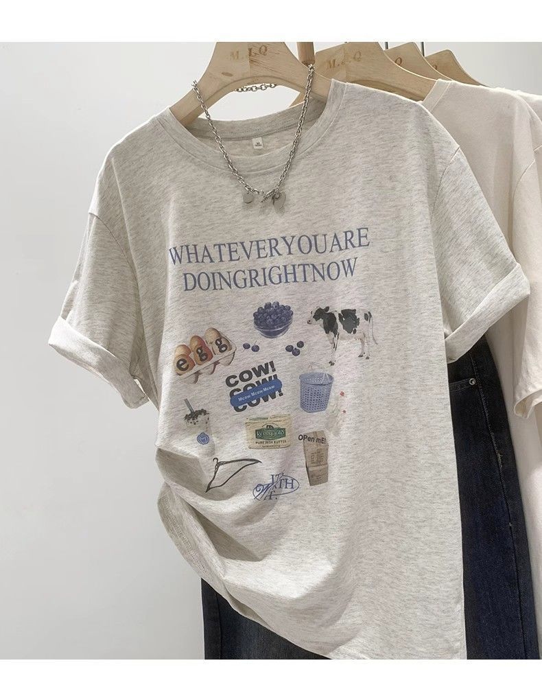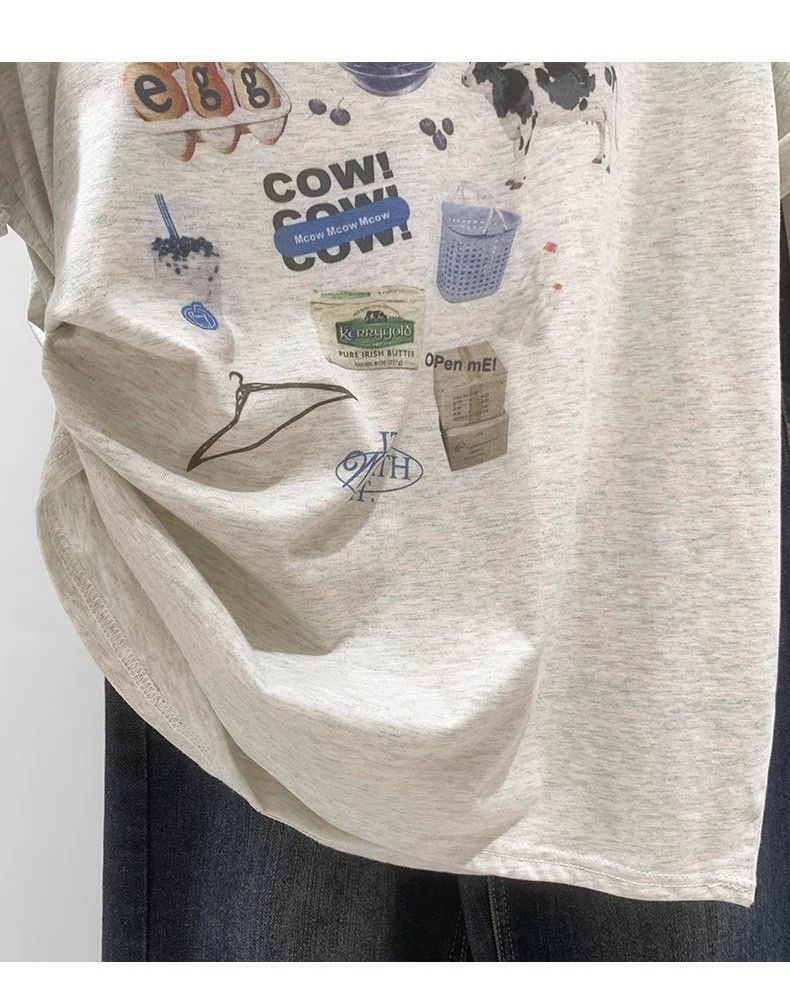 초극세사 모달 심플 한국 스타일 신상 만화 프린트 티셔츠 여성 여름 2026 루즈핏 반팔 상의 트렌디