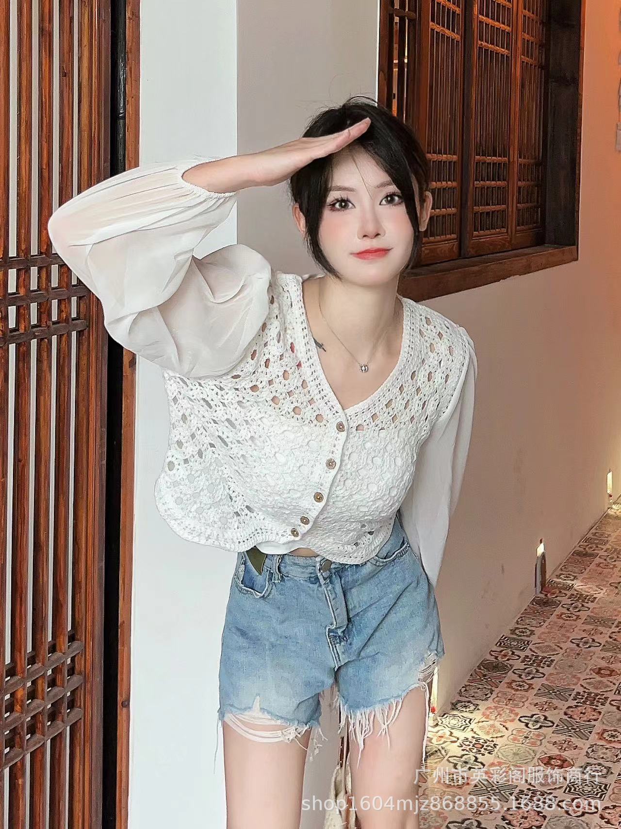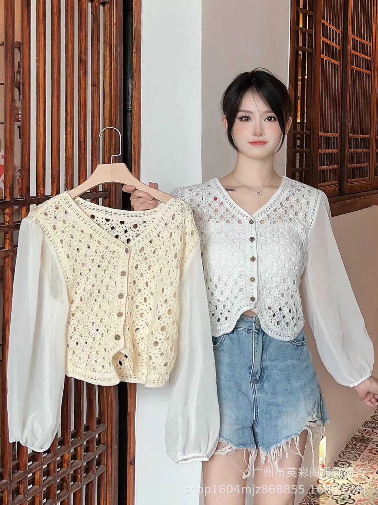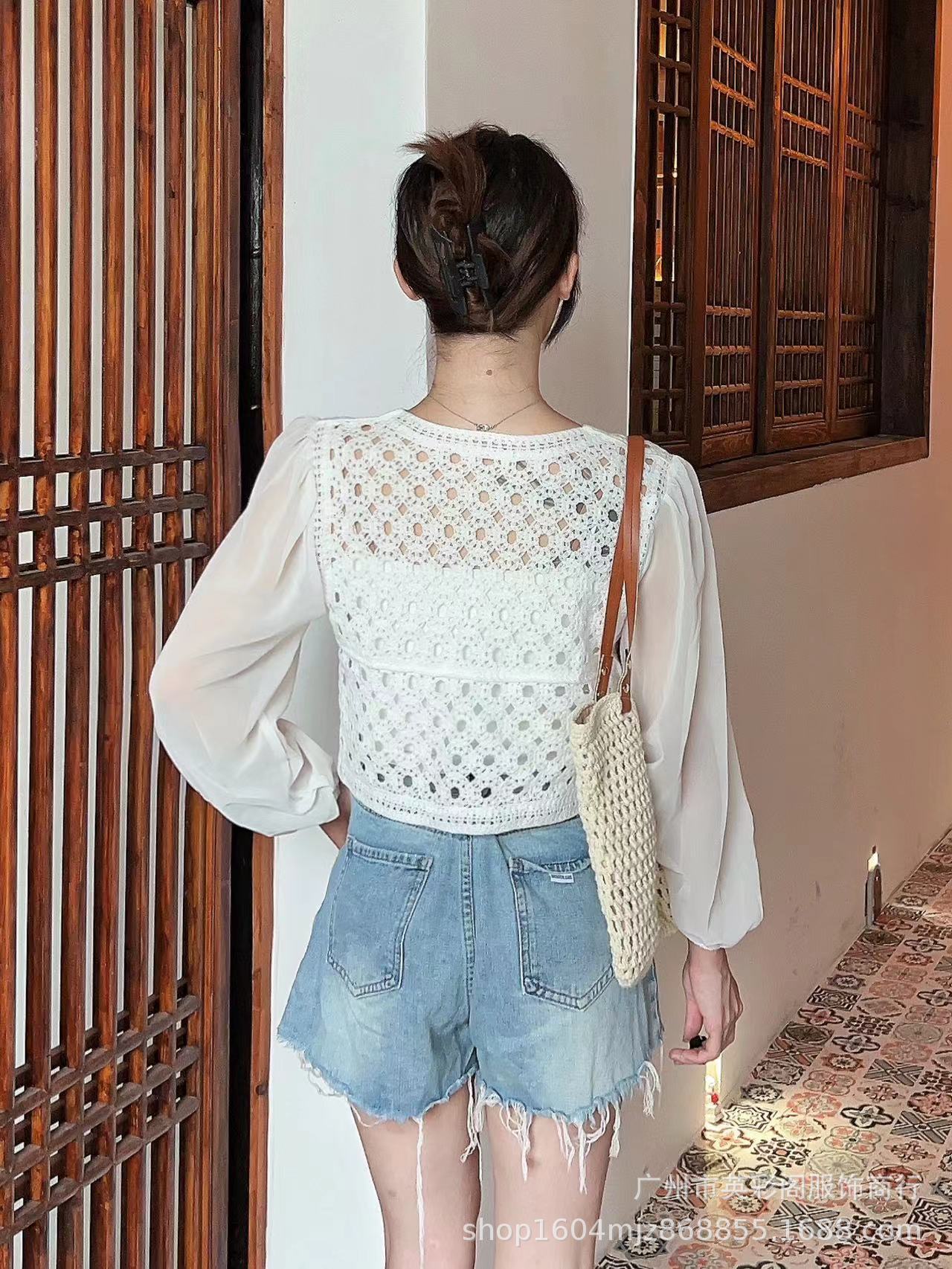 슈퍼 페어리 프렌치 할로우 크로 셰 뜨개질 긴 소매 셔츠 여성용 달콤한 느슨한 V 넥 퍼프 슬리브 쉬폰 탑 봄