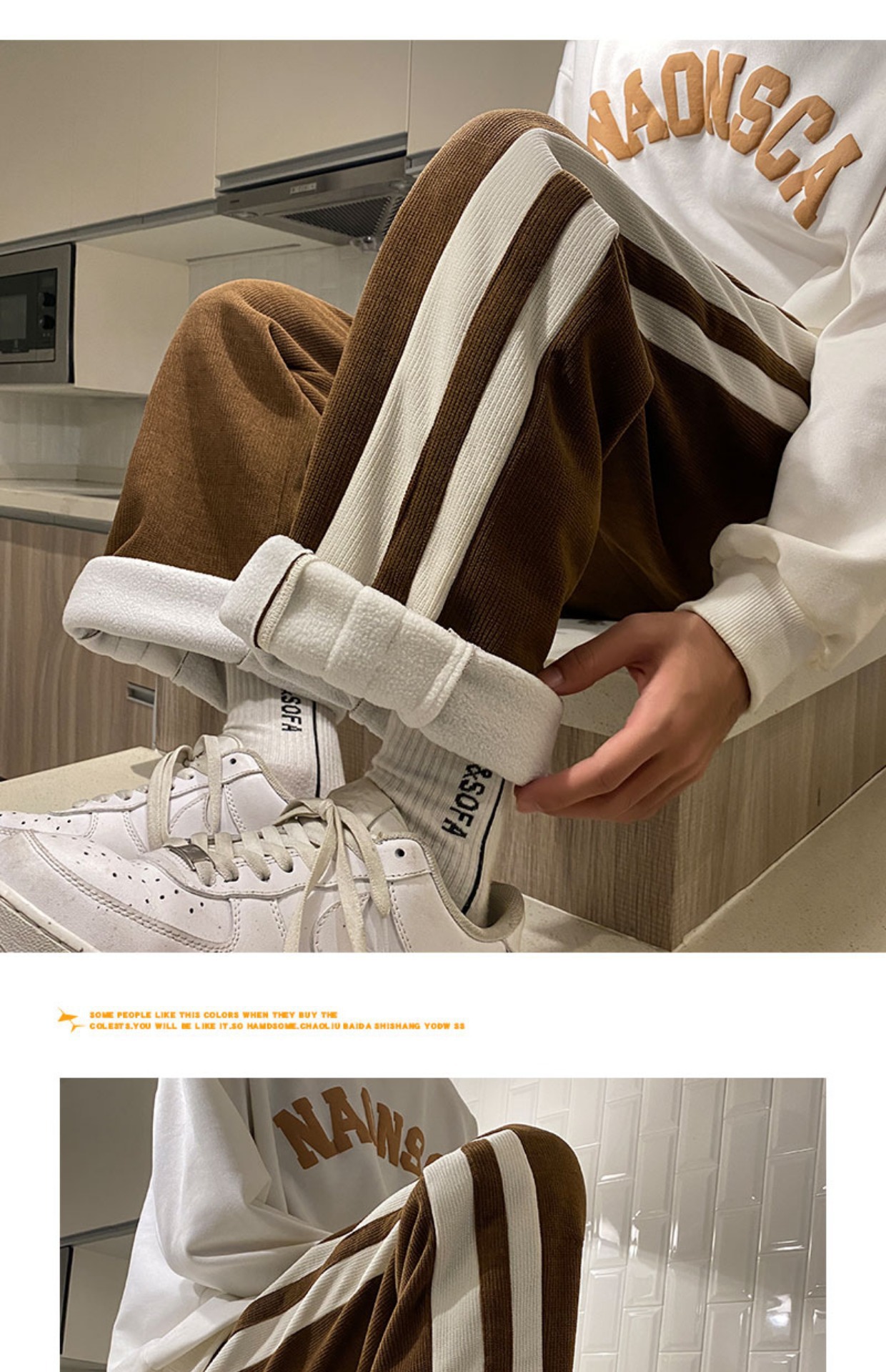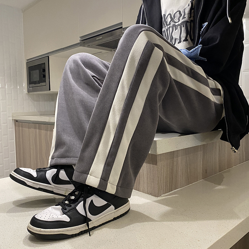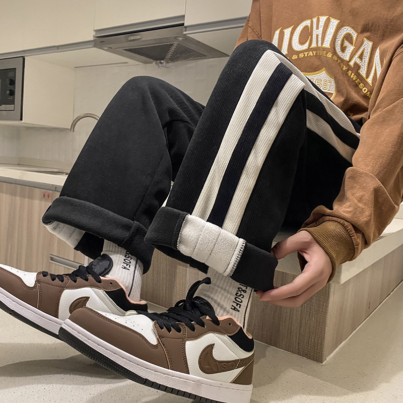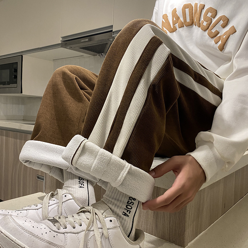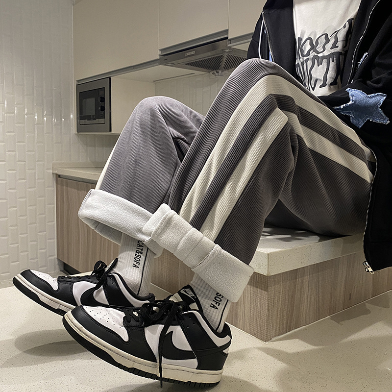 기모 코듀로이 바지 남자 느슨한 스트레이트 가을 겨울 홍콩 스타일 유행 줄무늬 스포츠 바지 남자 캐주얼 바지