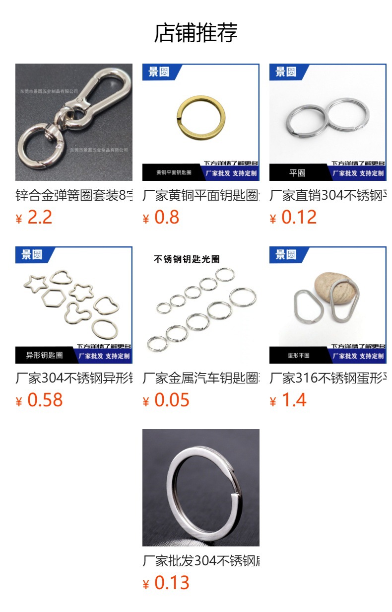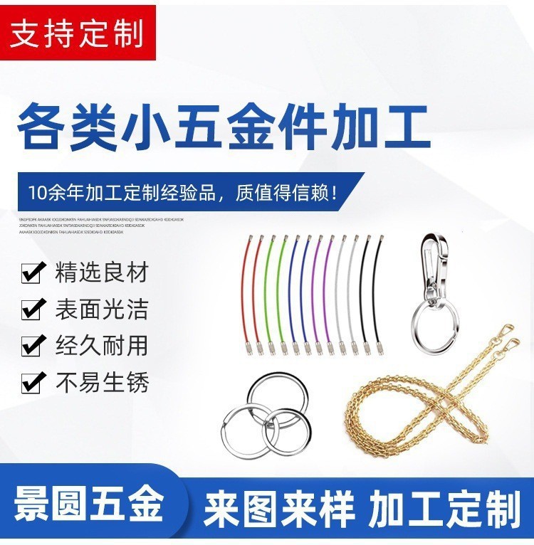 东莞市景圆五金饰品有限公司,是一家生产、销售为一体的专业厂商,专业生产各种珠链、狗扣、钥匙圈、手机绳、线扣、D扣、龙虾扣、朱旦扣、登山扣、弹簧圈、异形钥匙圈、卡圈、不锈钢链条等五金配件,适用于服饰、手袋、箱包、玩具、鞋、电子、印刷、灯饰等行业。