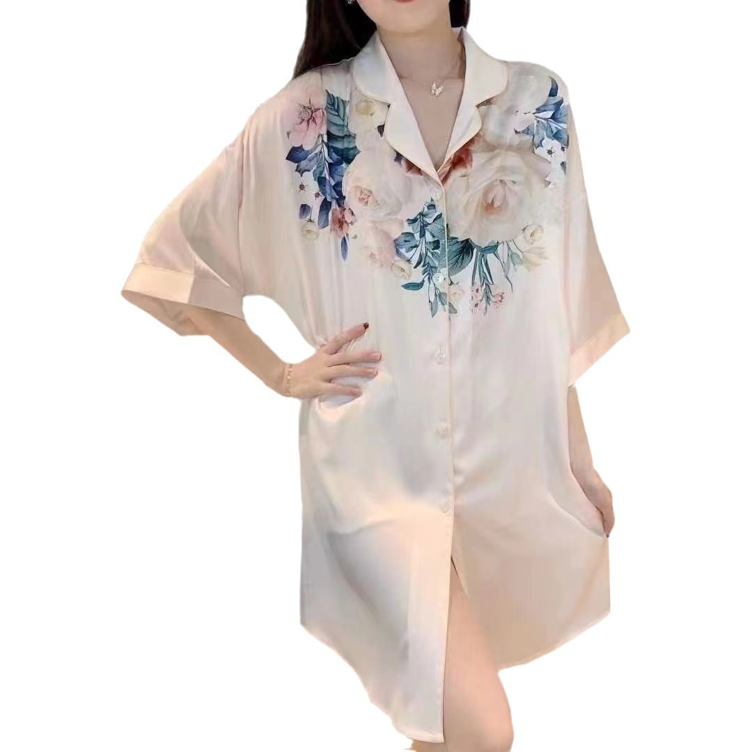 인기 인터넷 연예인 얼음 실크 잠옷 여성의 새로운 반팔 고급 꽃 대형 셔츠 드레스 홈웨어 다목적 정장