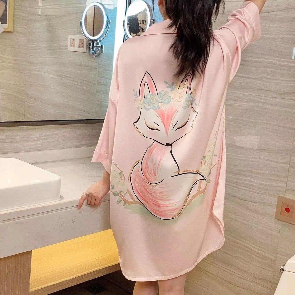 인기 인터넷 연예인 얼음 실크 잠옷 여성의 새로운 반팔 고급 꽃 대형 셔츠 드레스 홈웨어 다목적 정장스토어 가기