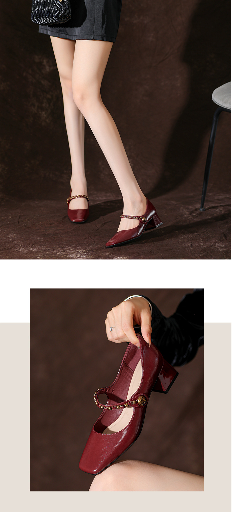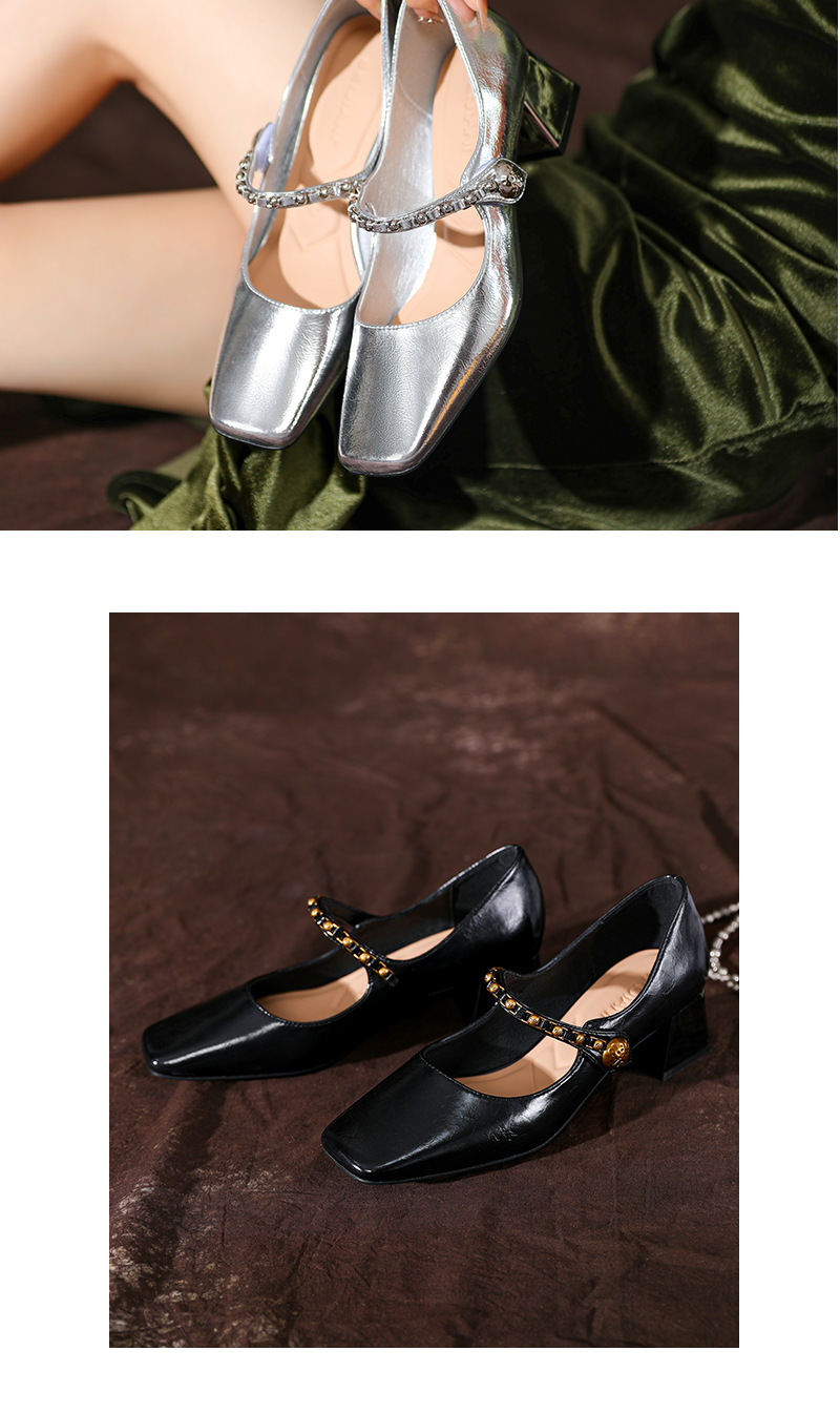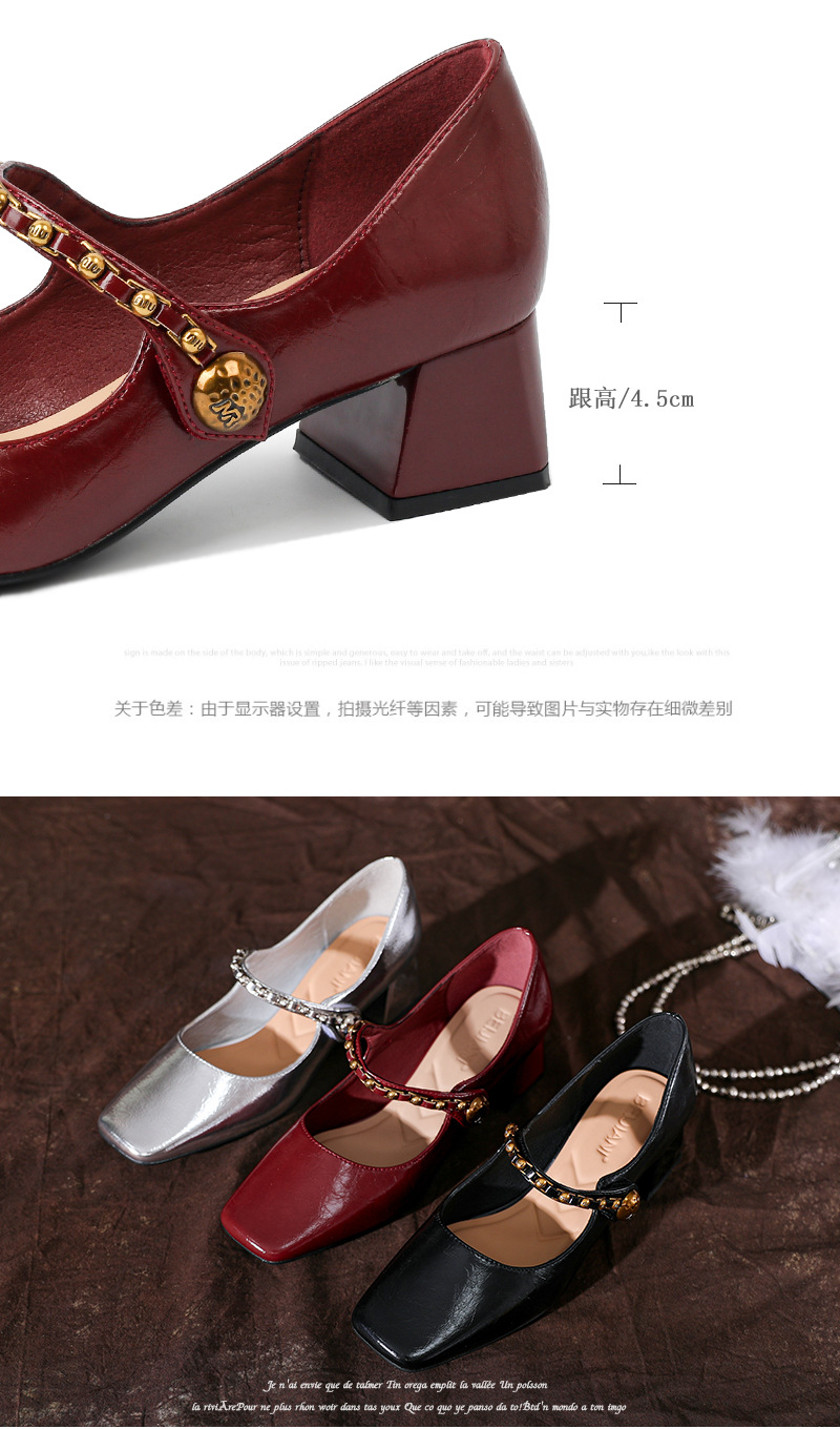 332-56 양가죽 두꺼운 뒤꿈치 Mary Jane 작은 가죽 신발 여성 스퀘어 헤드 프랑스 복고풍 단일 신발 부드러운 가죽 체인 실버 조커스토어 가기