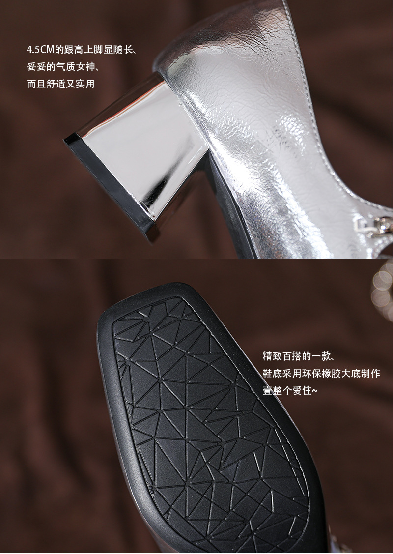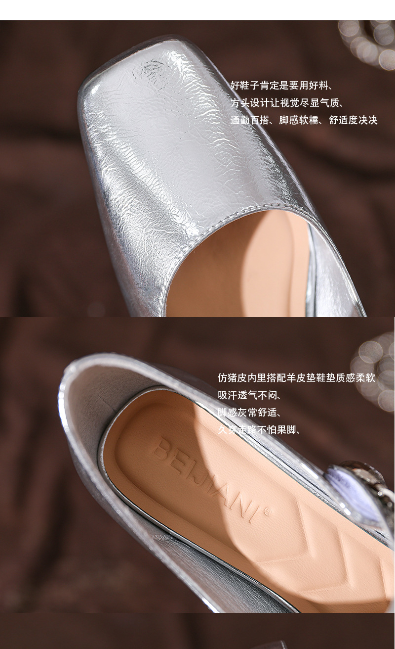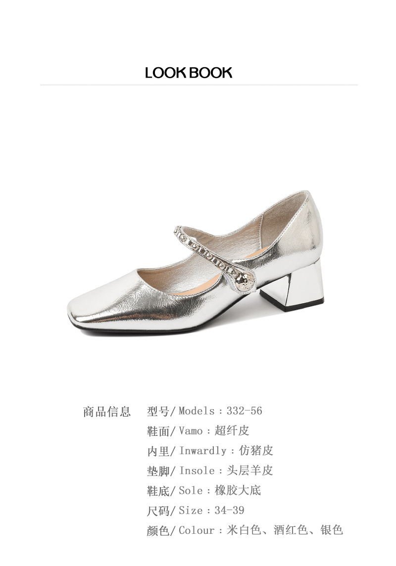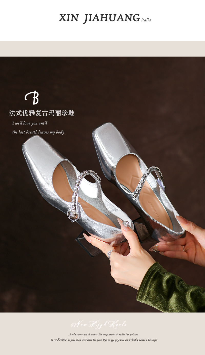 332-56 양가죽 두꺼운 뒤꿈치 Mary Jane 작은 가죽 신발 여성 스퀘어 헤드 프랑스 복고풍 단일 신발 부드러운 가죽 체인 실버 조커