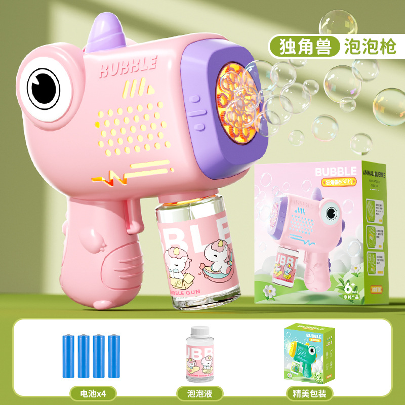 새로운 자동 전기 거품 기계 다공성 빛 유니콘 공룡 만화 거품 총 어린이 장난감 선물