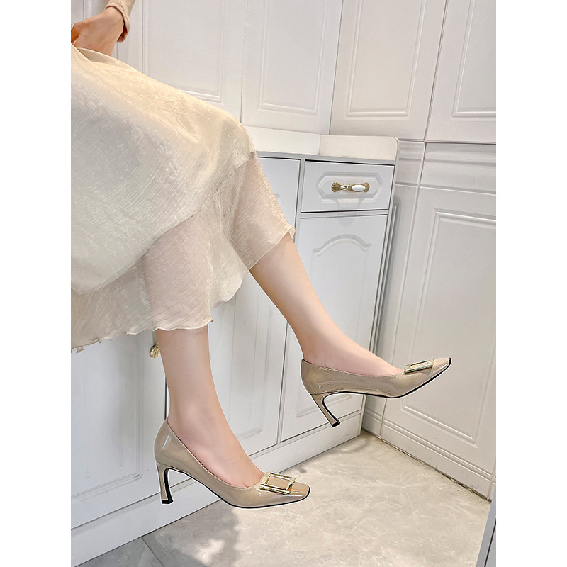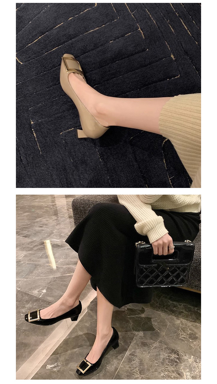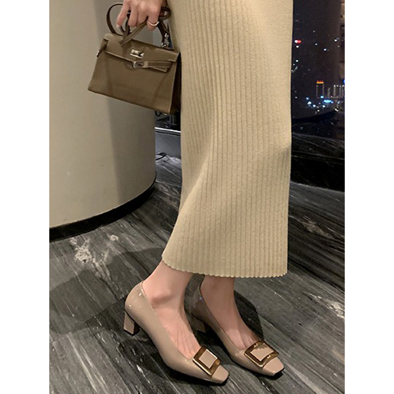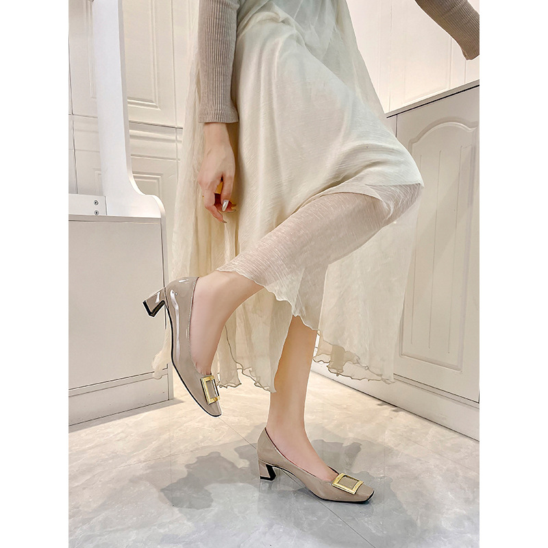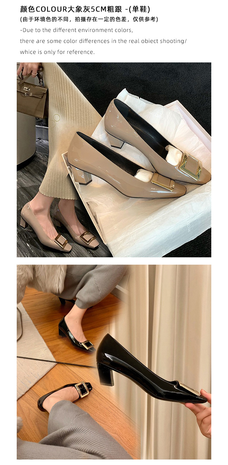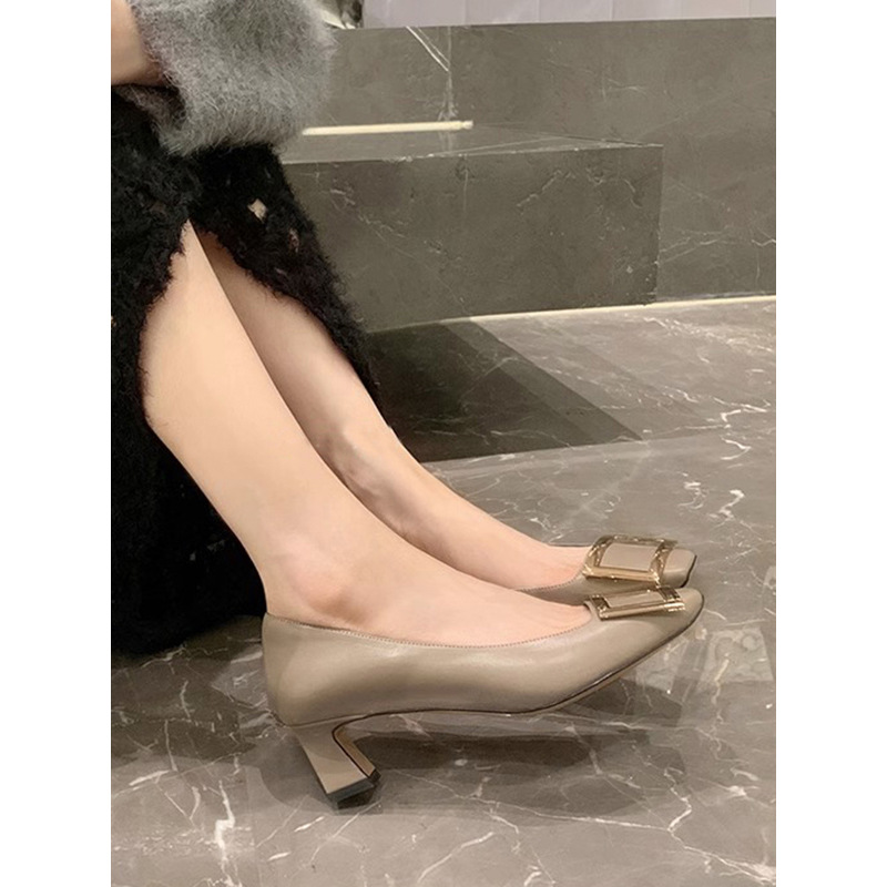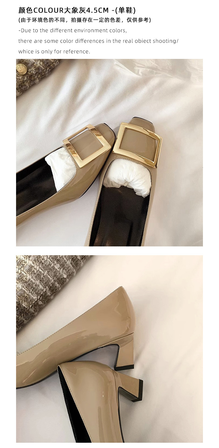 여성용 R 스퀘어 버클 슈즈, 청키 힐, 스퀘어 토 하이힐, 슬림 힐, 프렌치 스타일, 아름답고 고급스러운 코끼리 그레이 커뮤터 플랫 슈즈스토어 가기