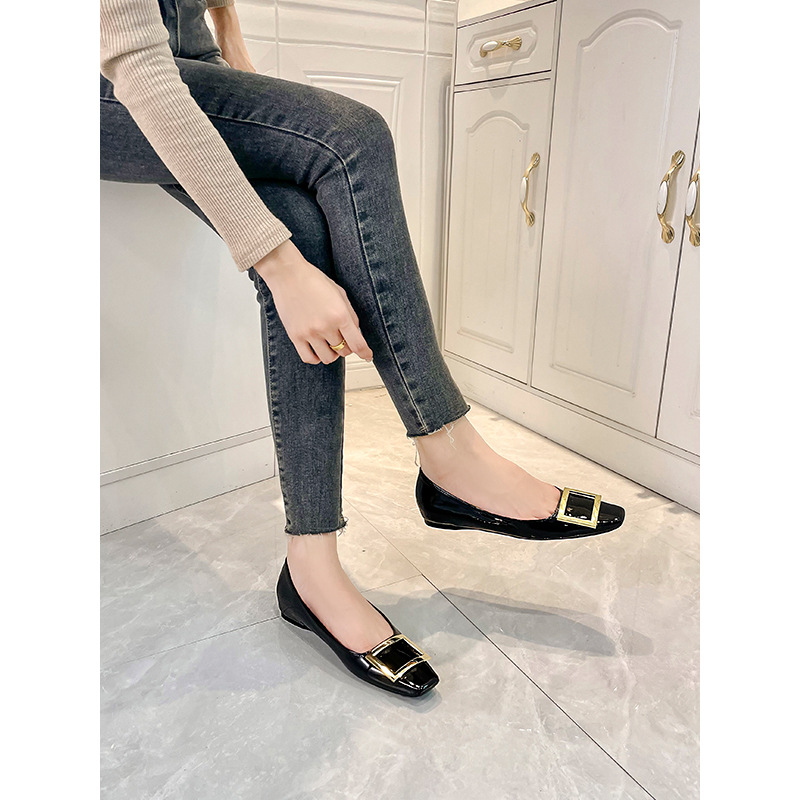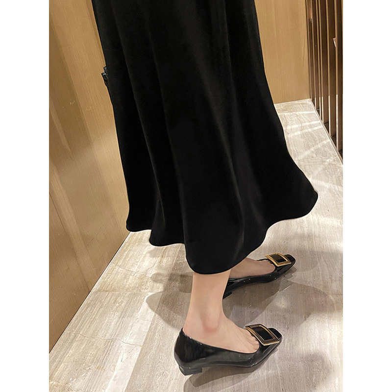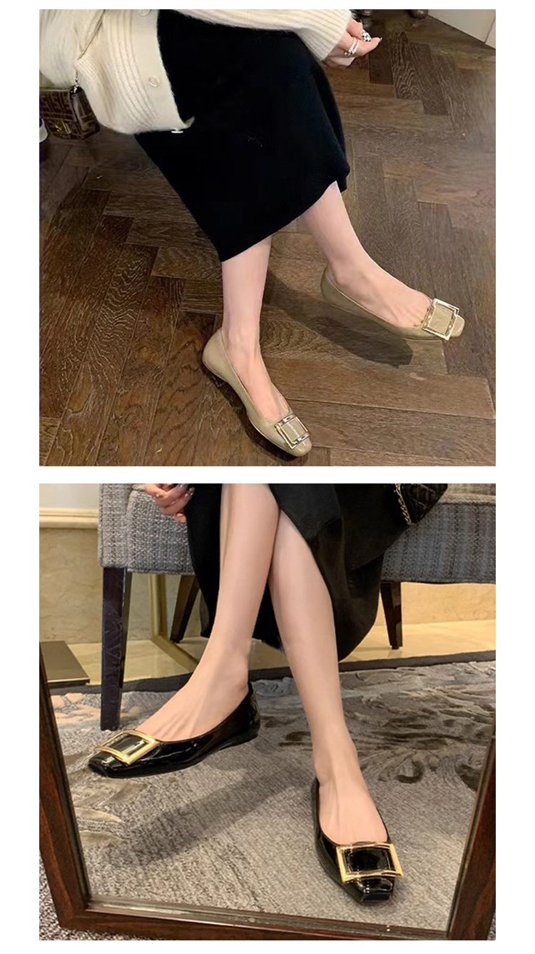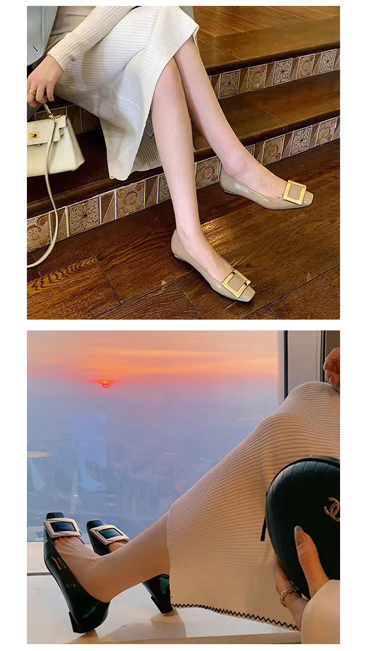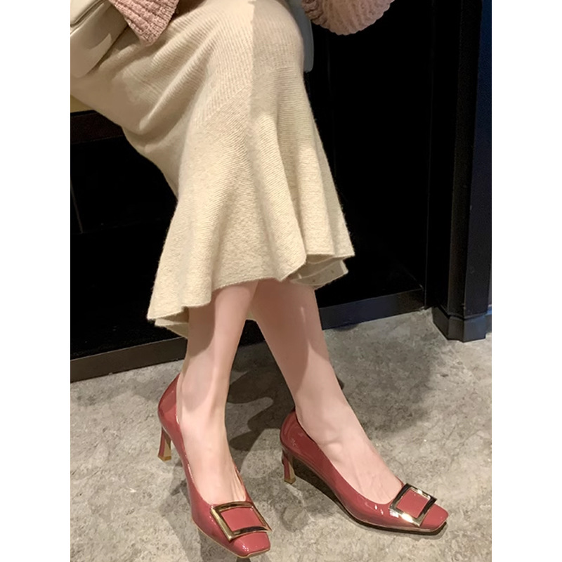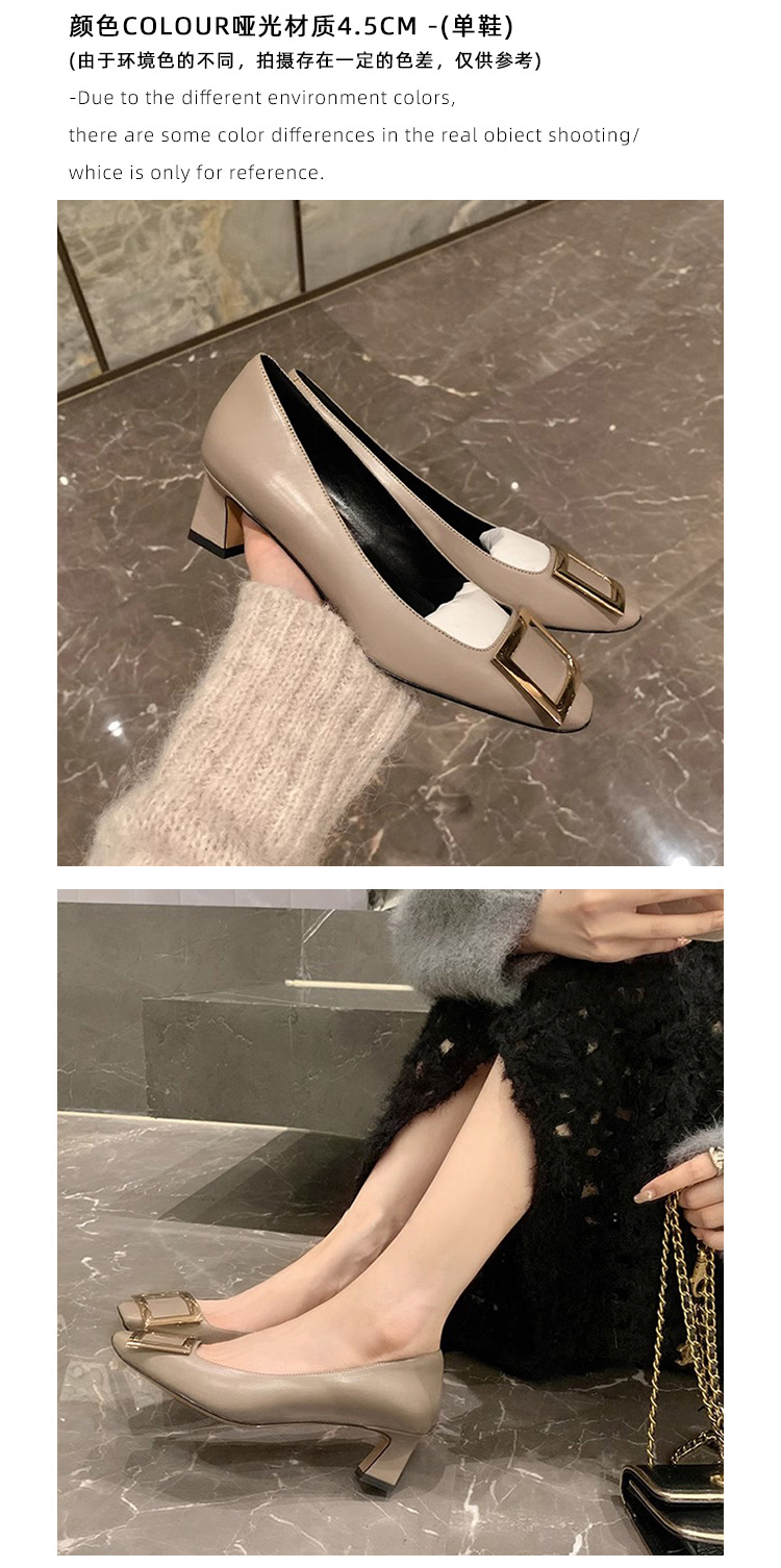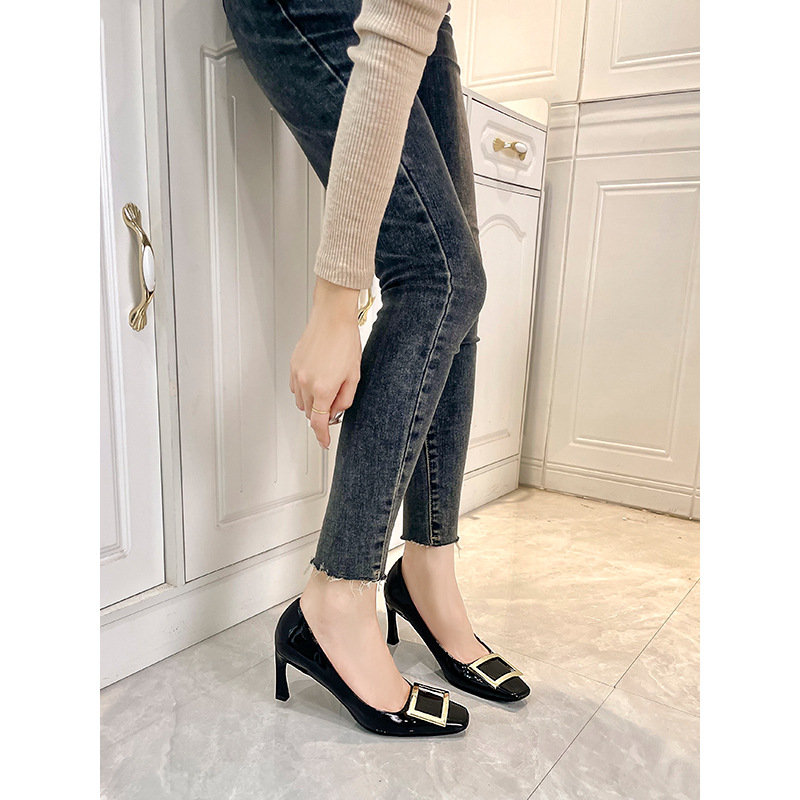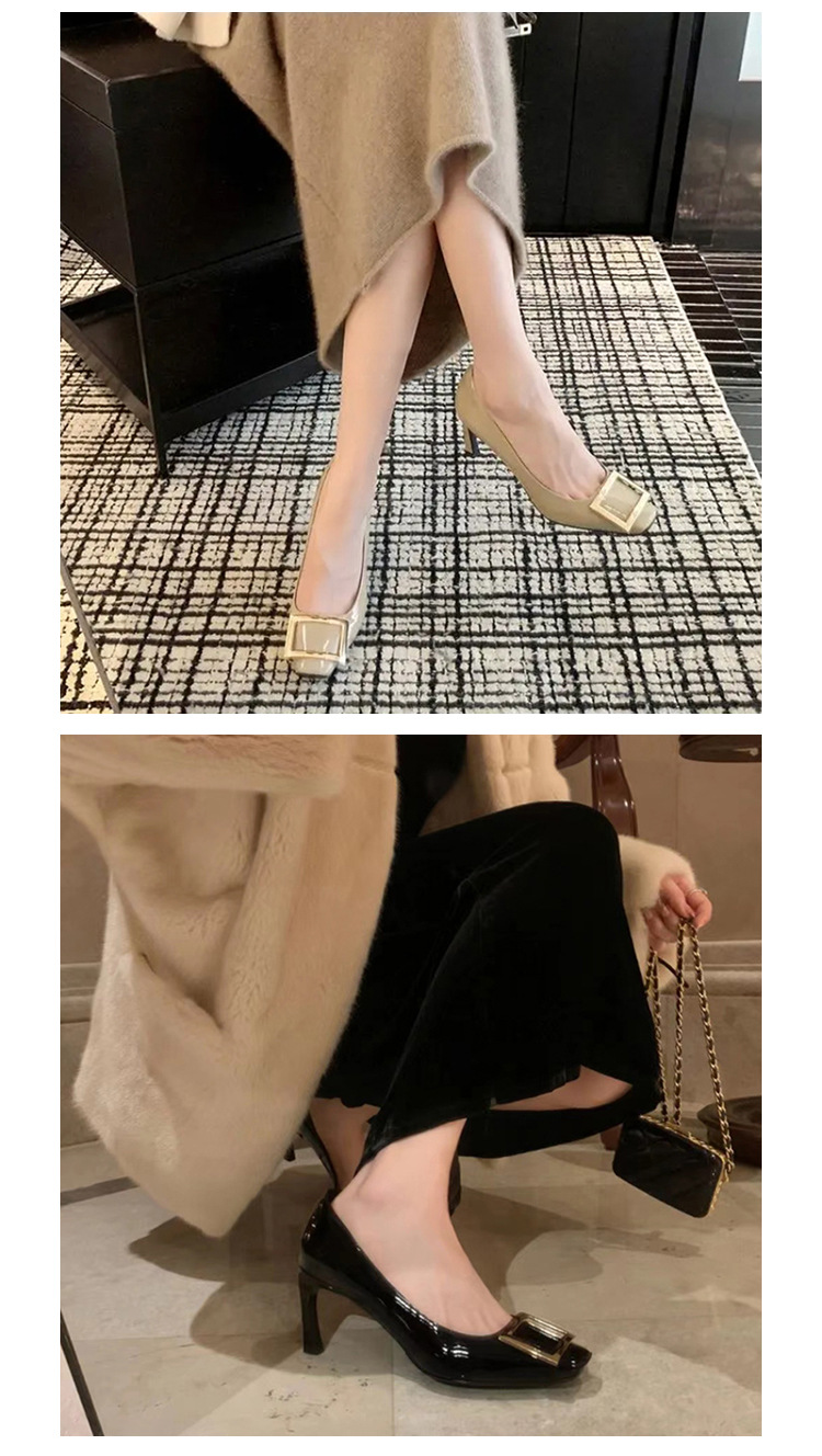 여성용 R 스퀘어 버클 슈즈, 청키 힐, 스퀘어 토 하이힐, 슬림 힐, 프렌치 스타일, 아름답고 고급스러운 코끼리 그레이 커뮤터 플랫 슈즈스토어 가기