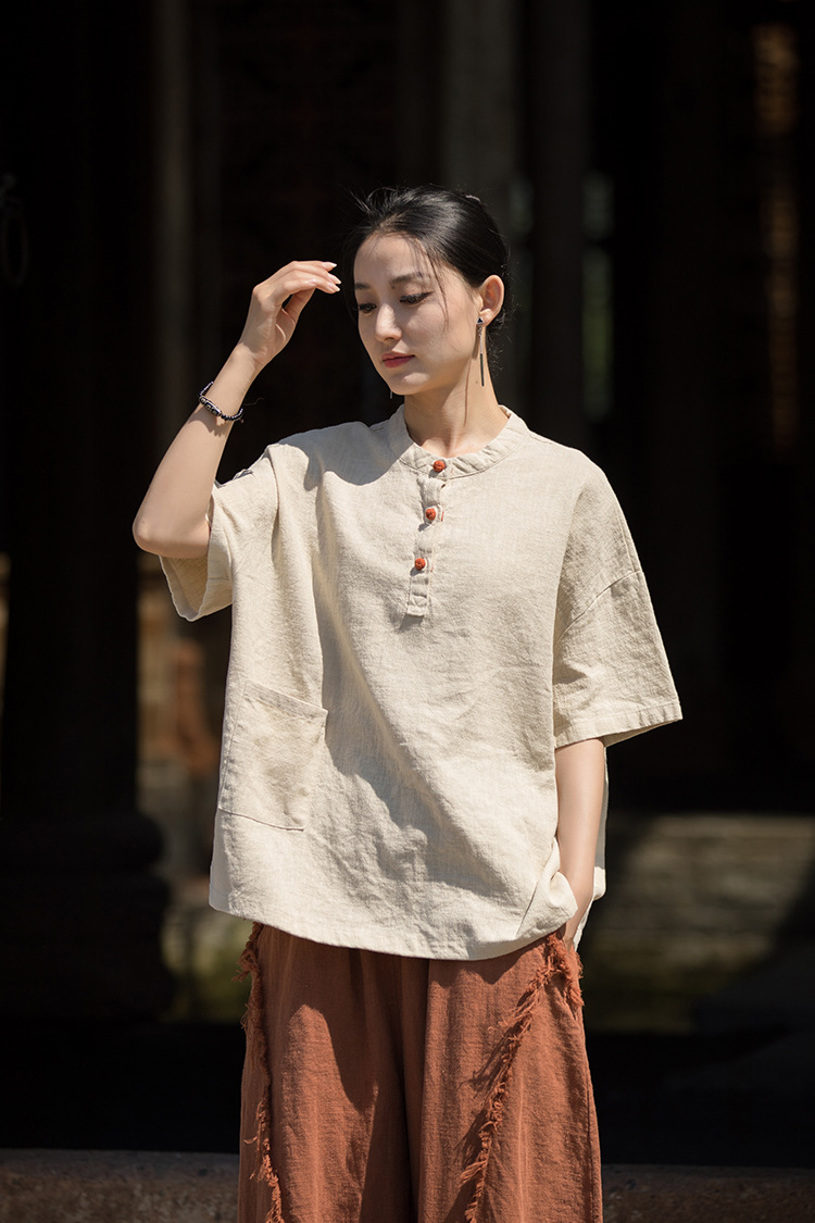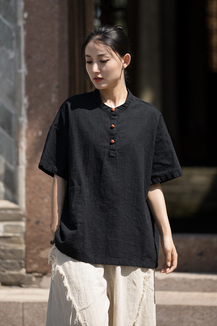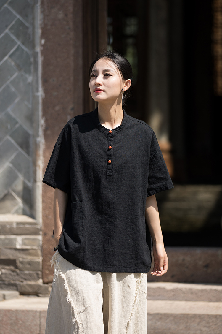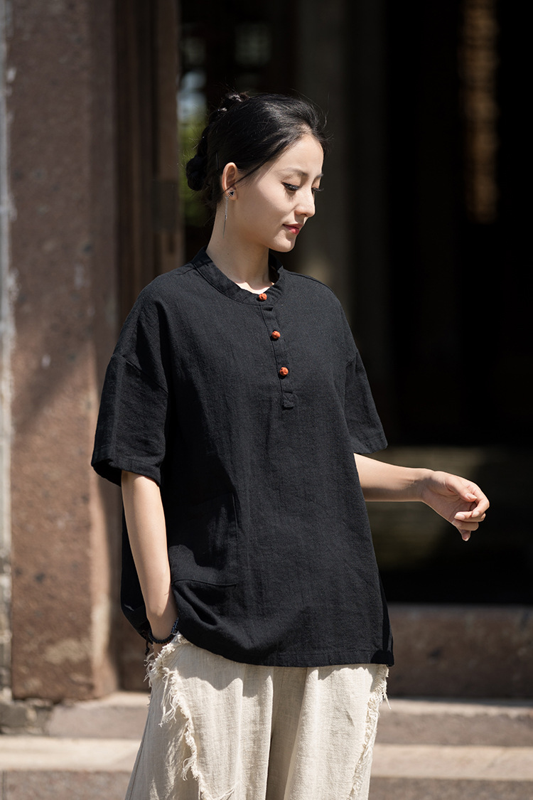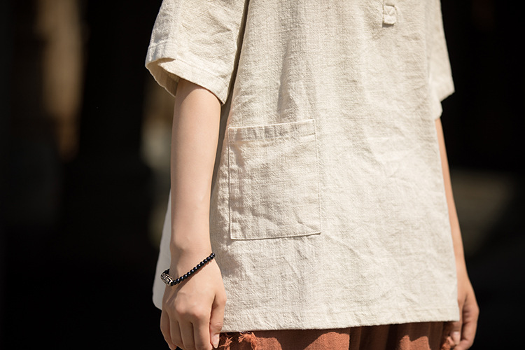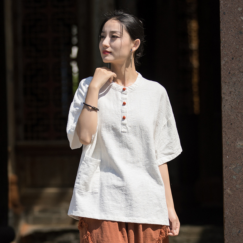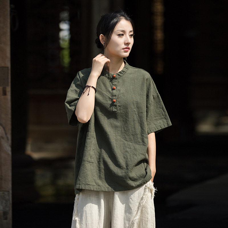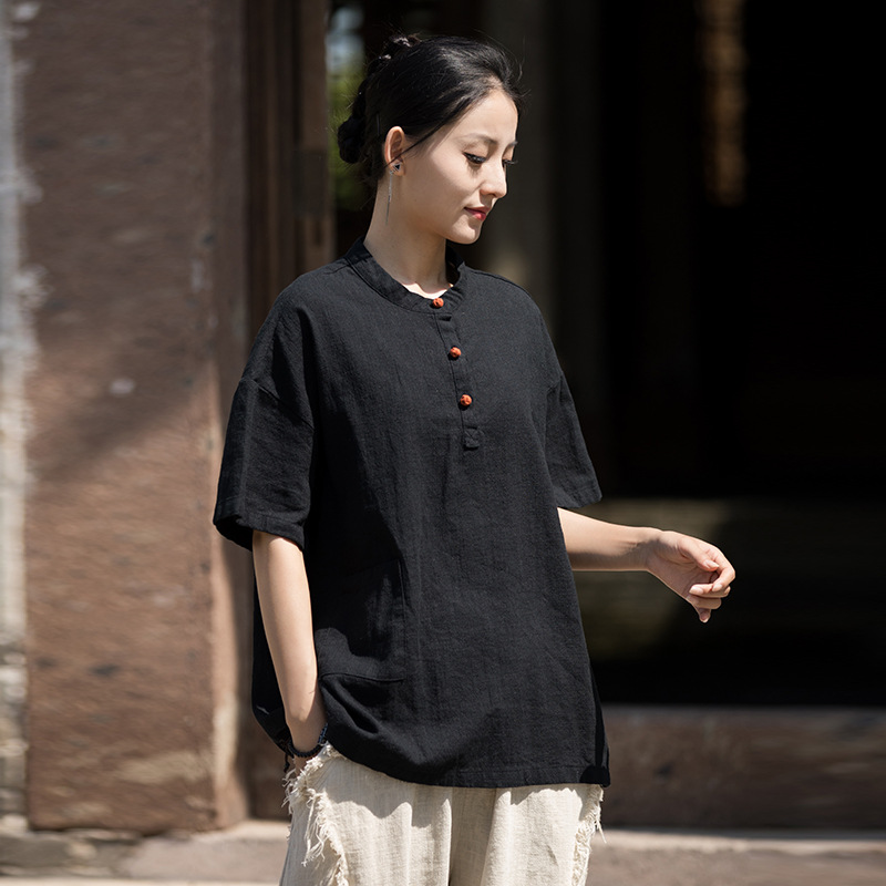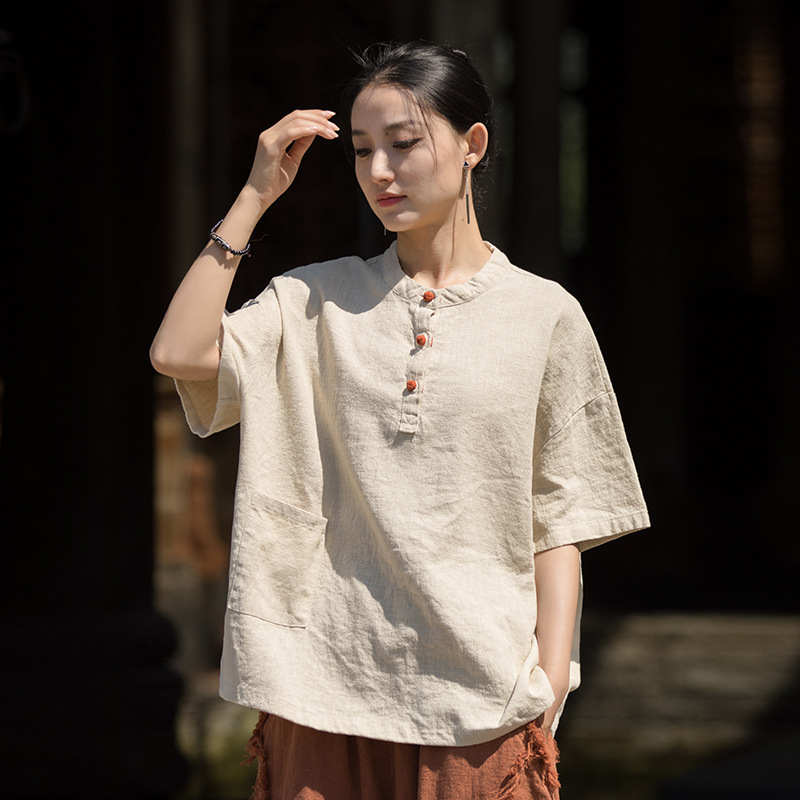 가을 면마 여성복 신상품, 라미 배색 단추 장식 상의, 중국풍 개량 오리지널 신상 중국풍 여성 반팔 티셔츠