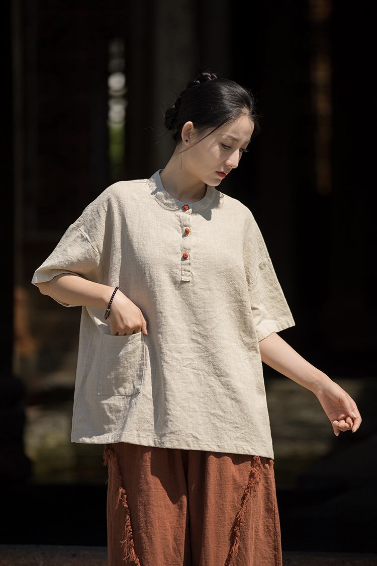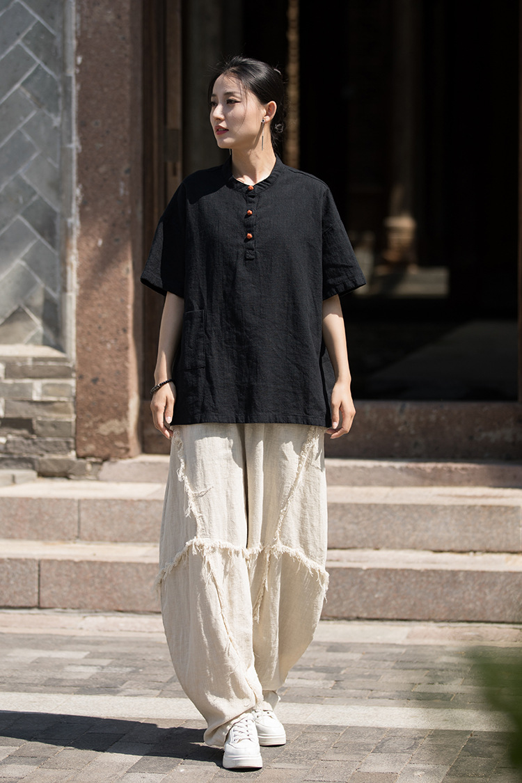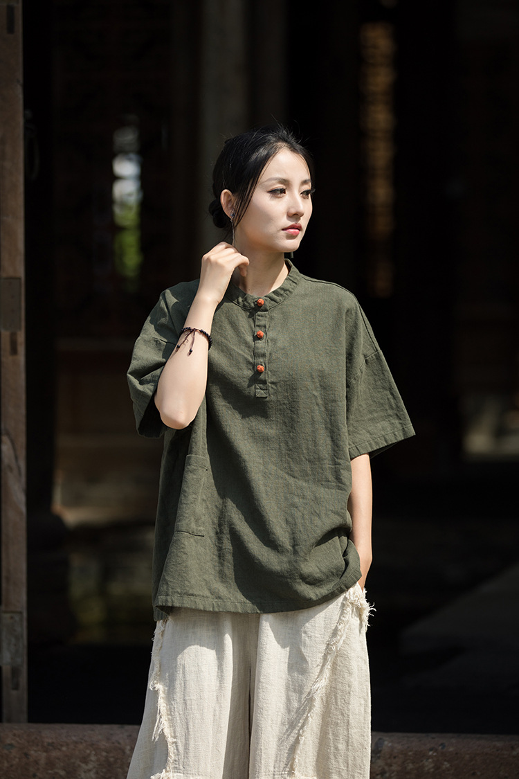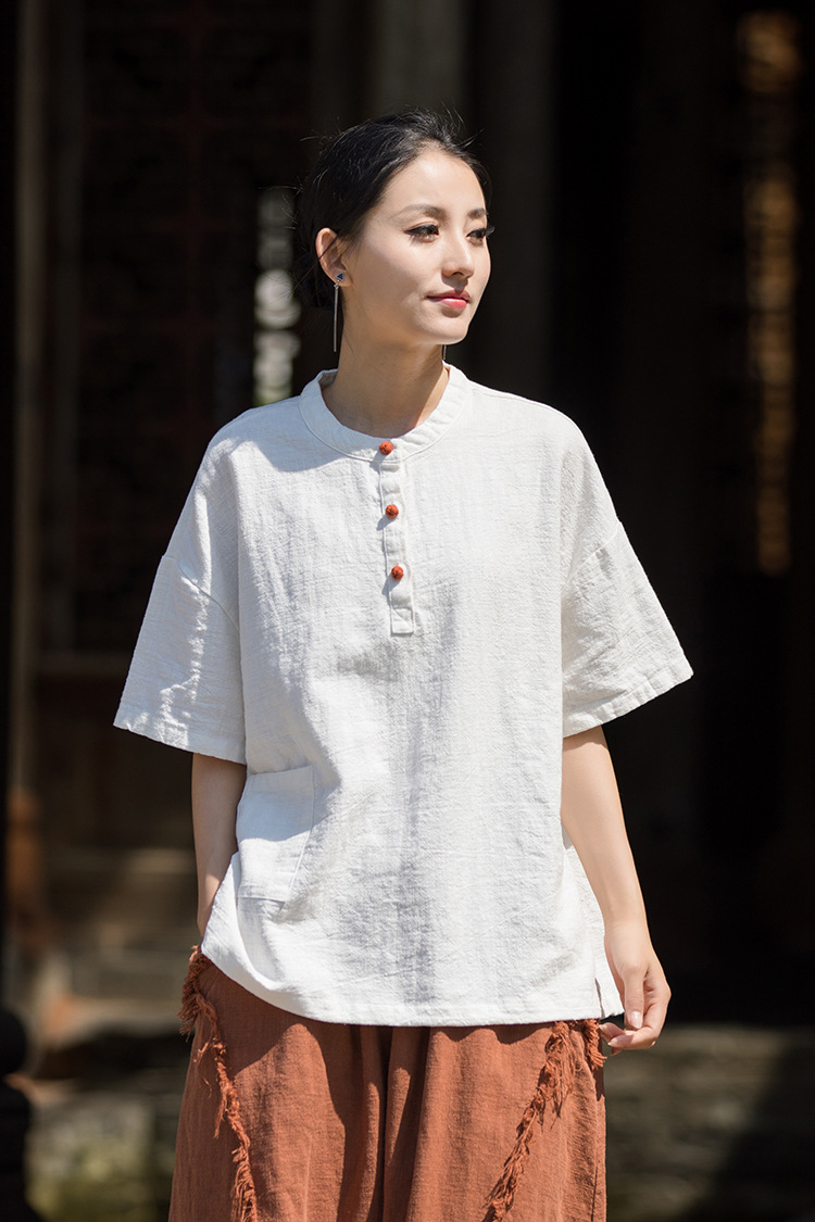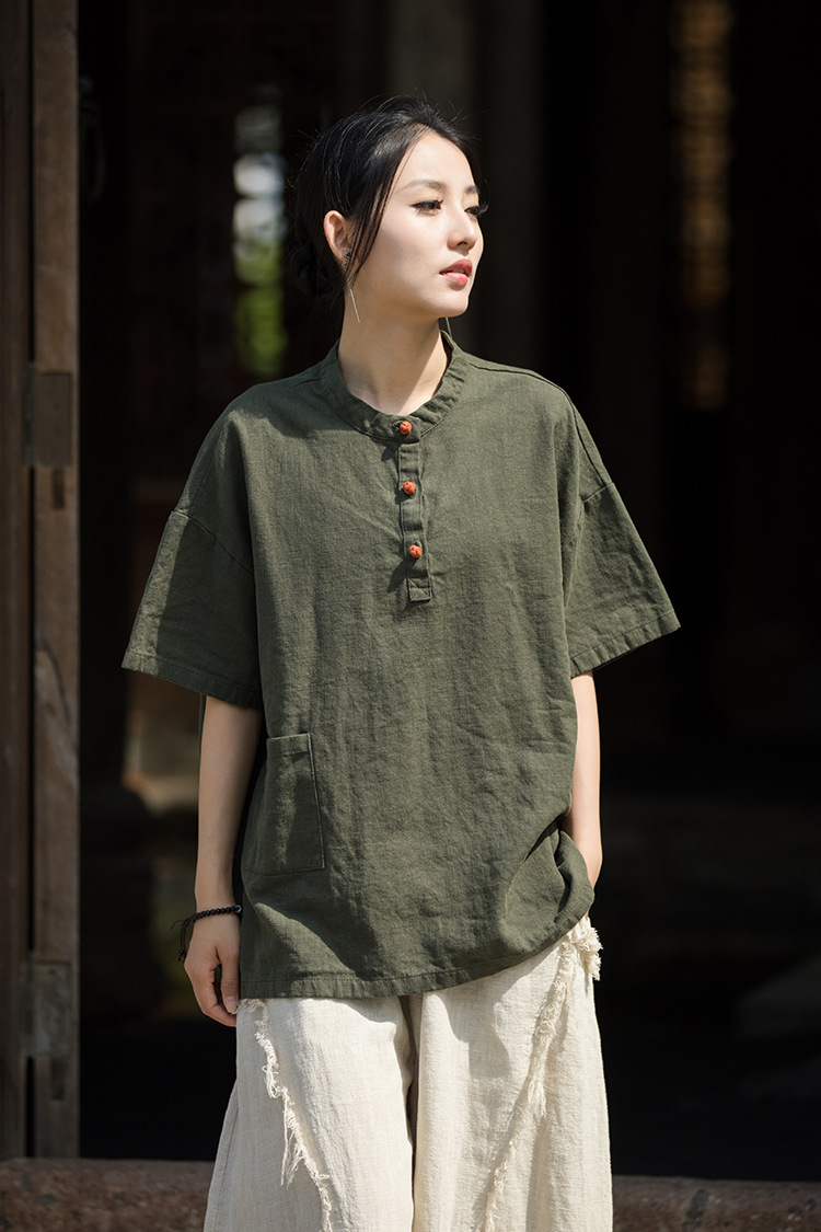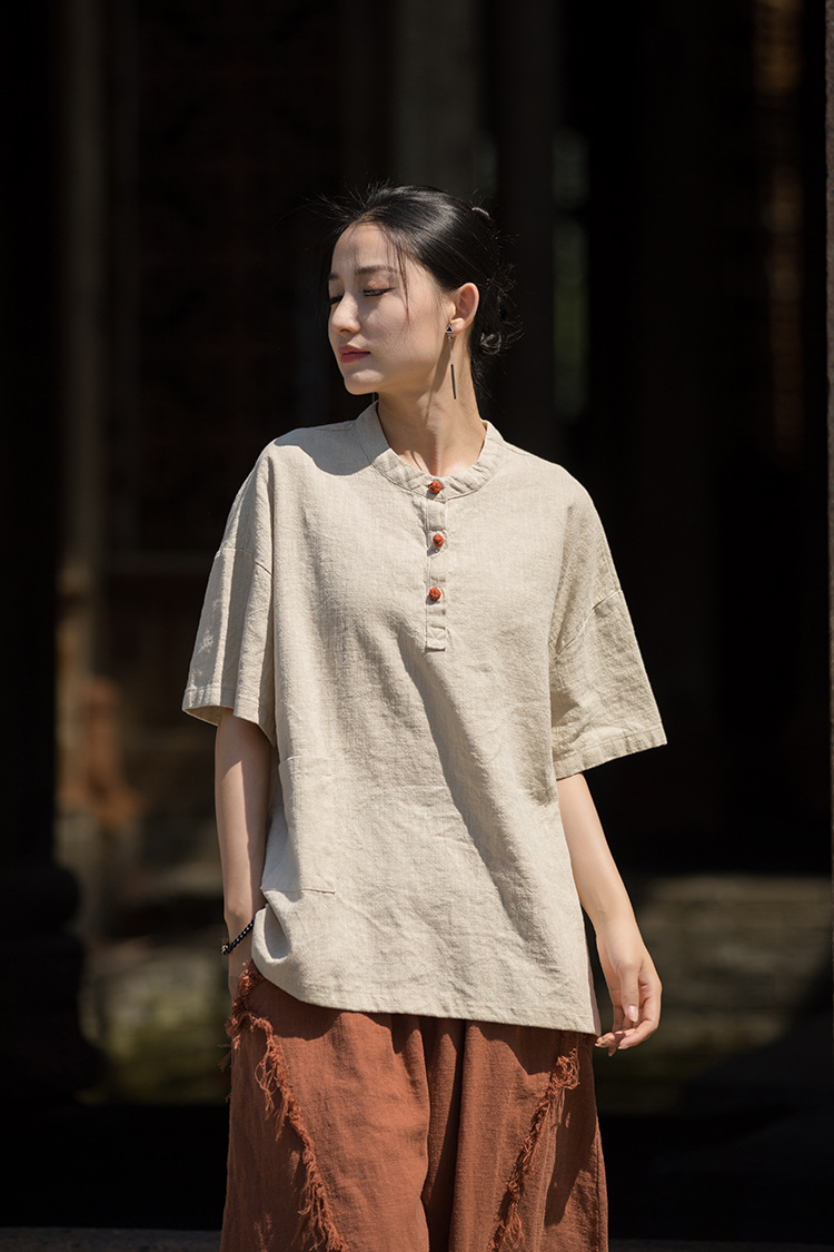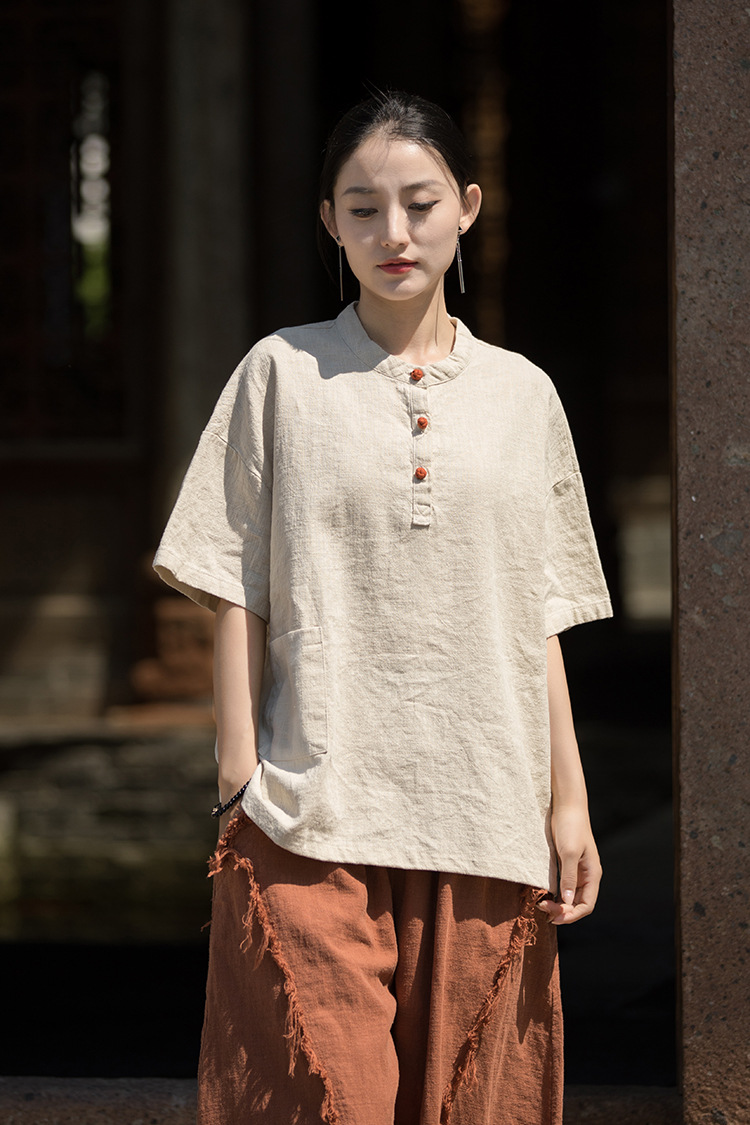 가을 면마 여성복 신상품, 라미 배색 단추 장식 상의, 중국풍 개량 오리지널 신상 중국풍 여성 반팔 티셔츠