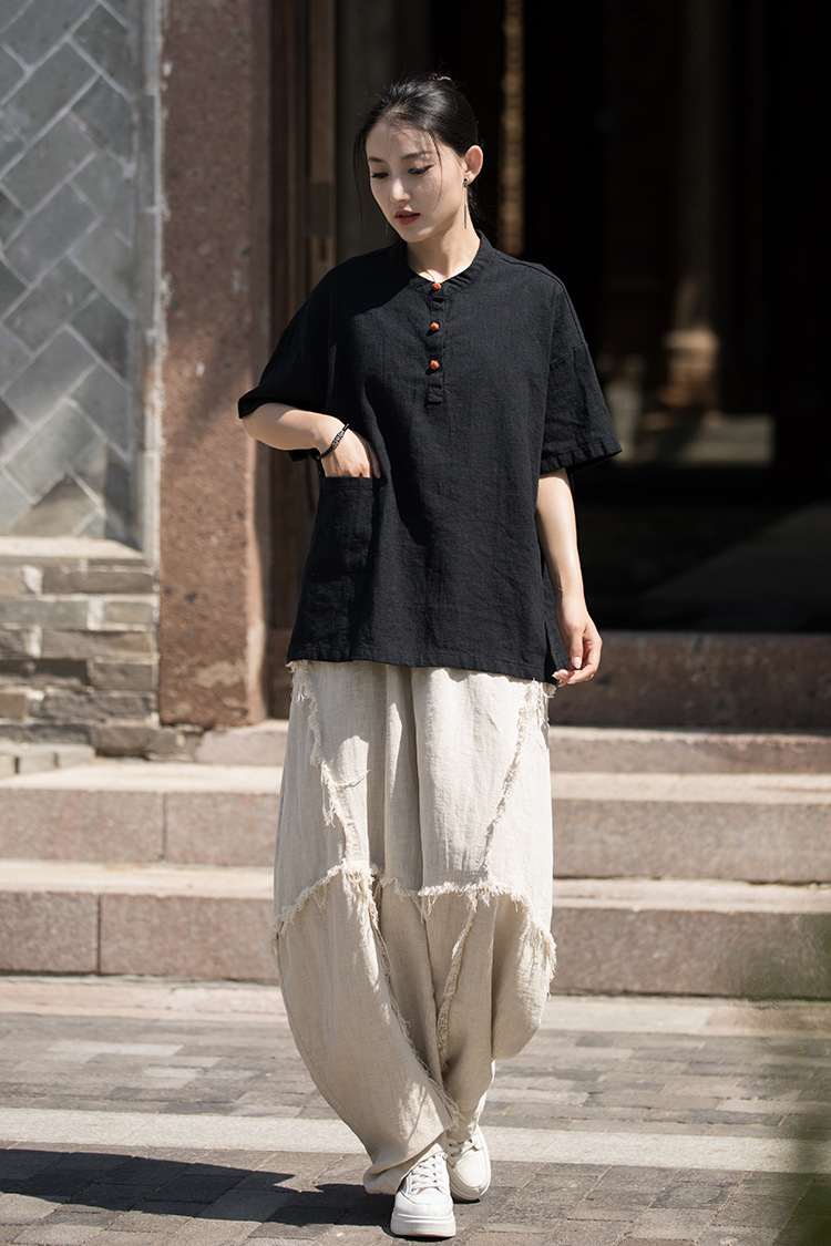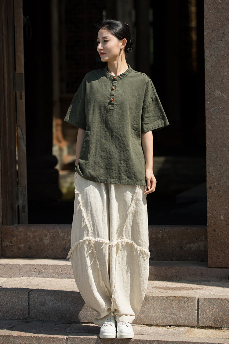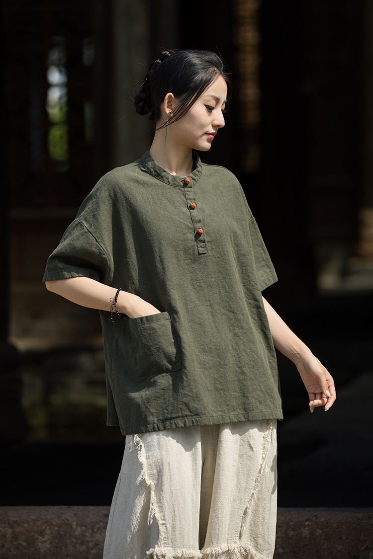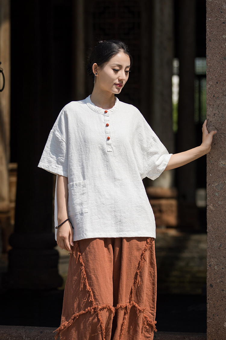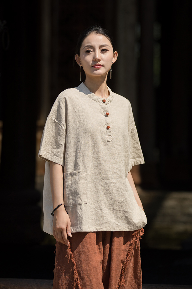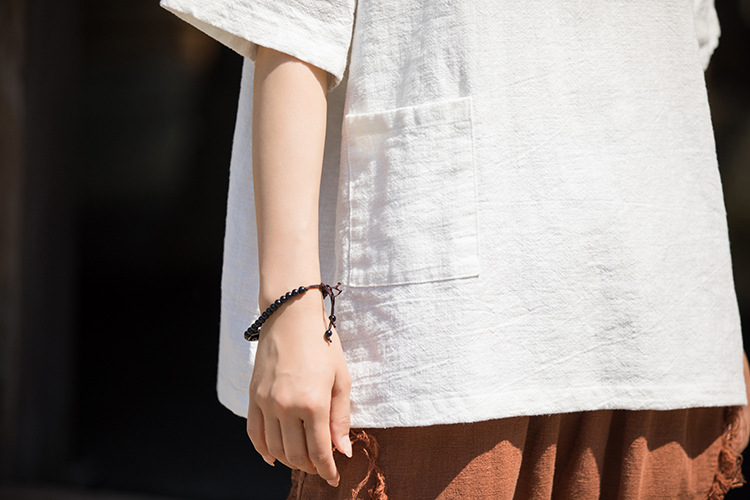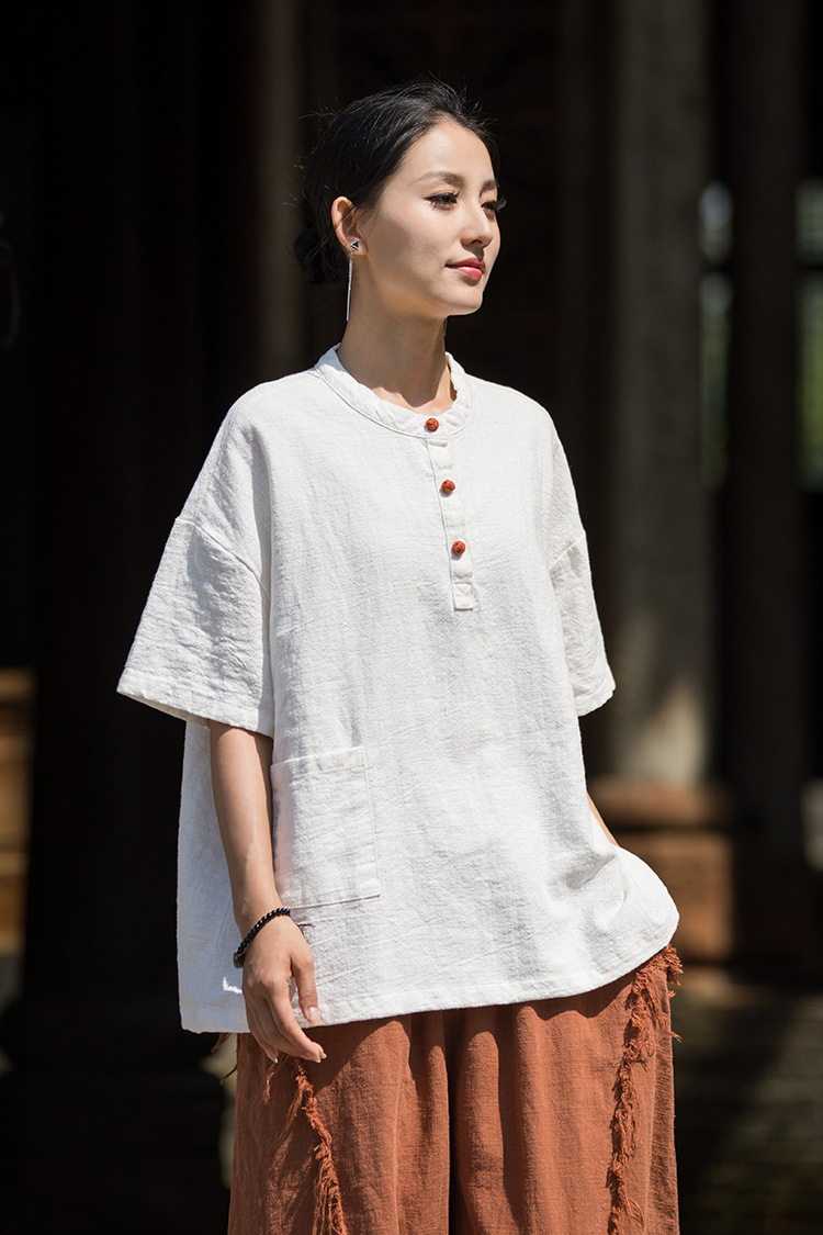 가을 면마 여성복 신상품, 라미 배색 단추 장식 상의, 중국풍 개량 오리지널 신상 중국풍 여성 반팔 티셔츠