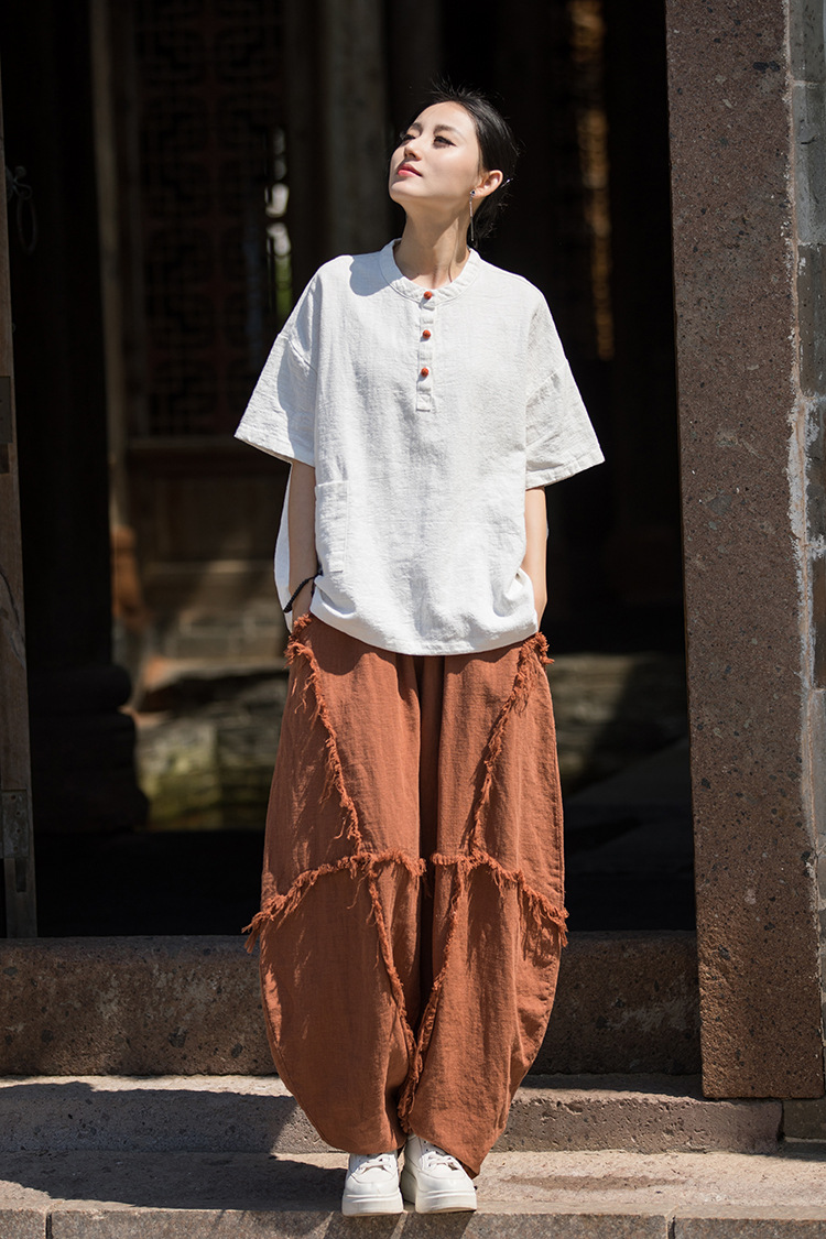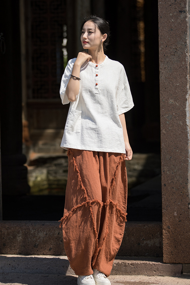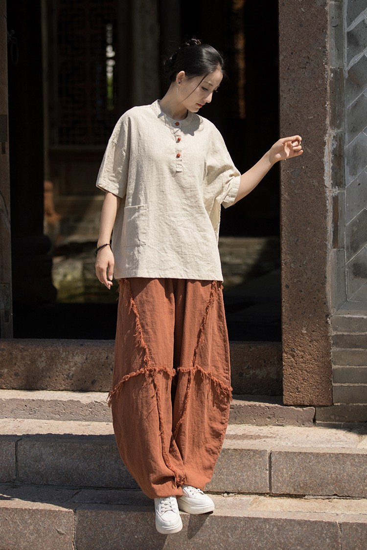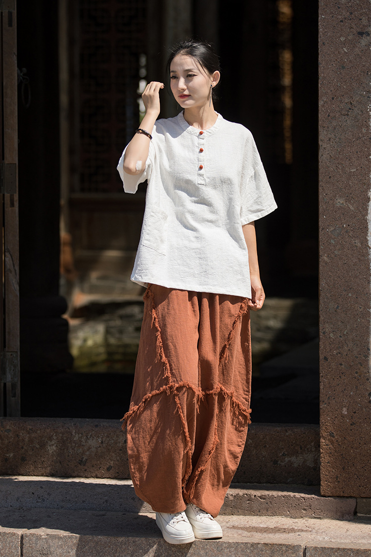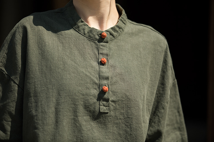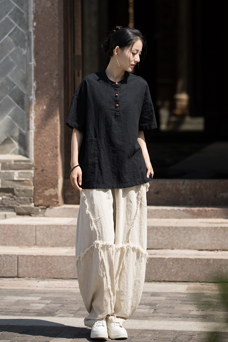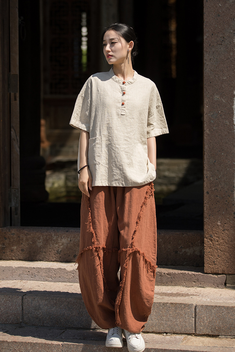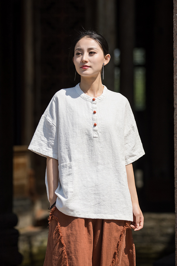 가을 면마 여성복 신상품, 라미 배색 단추 장식 상의, 중국풍 개량 오리지널 신상 중국풍 여성 반팔 티셔츠