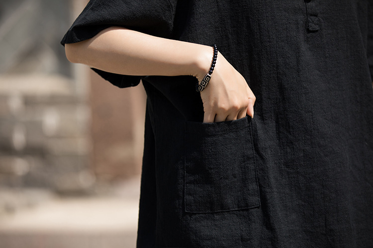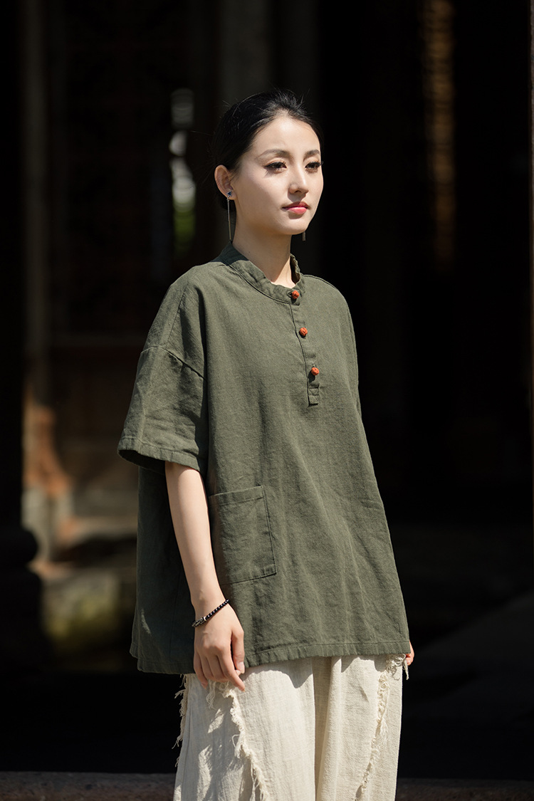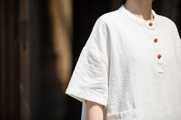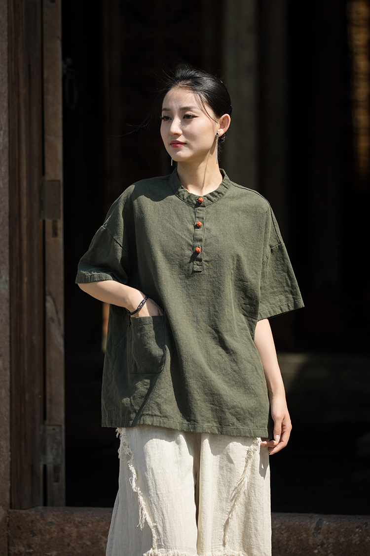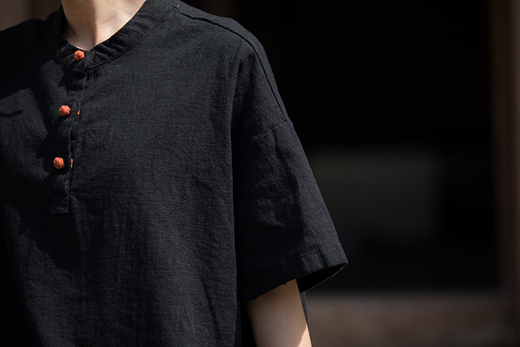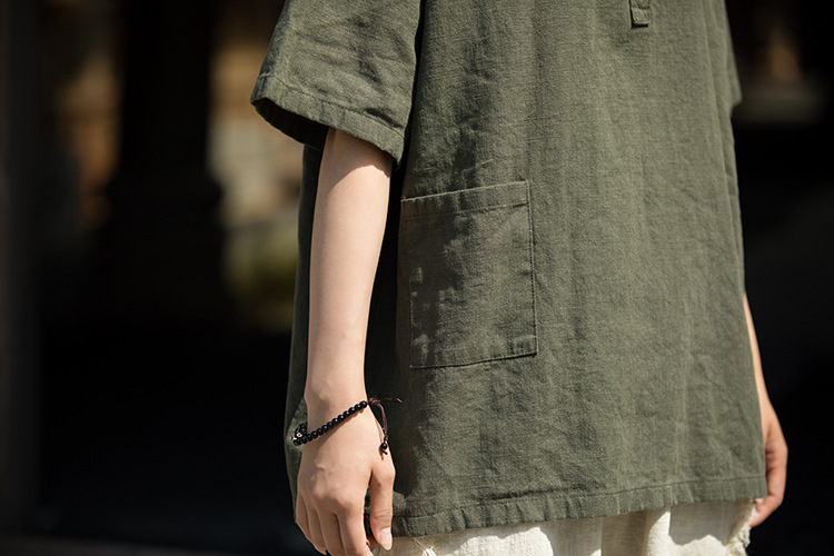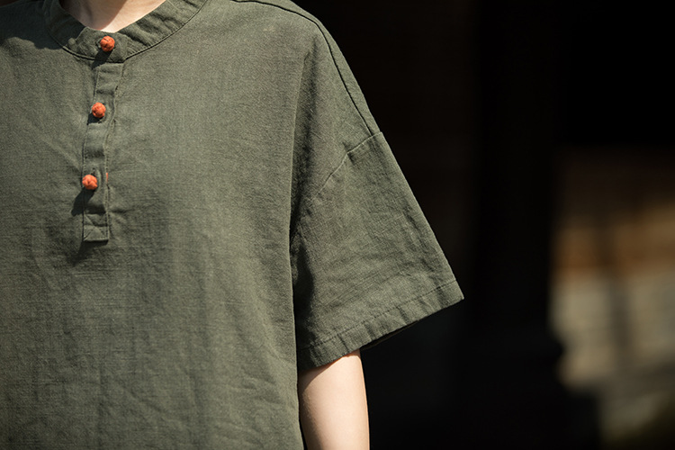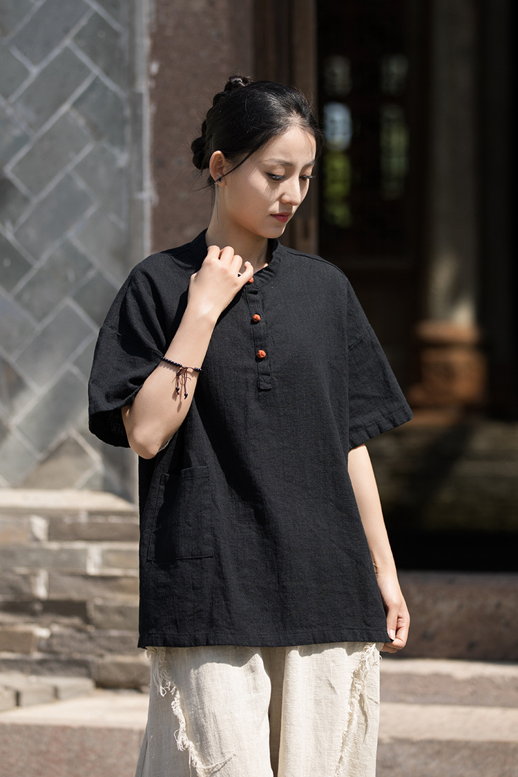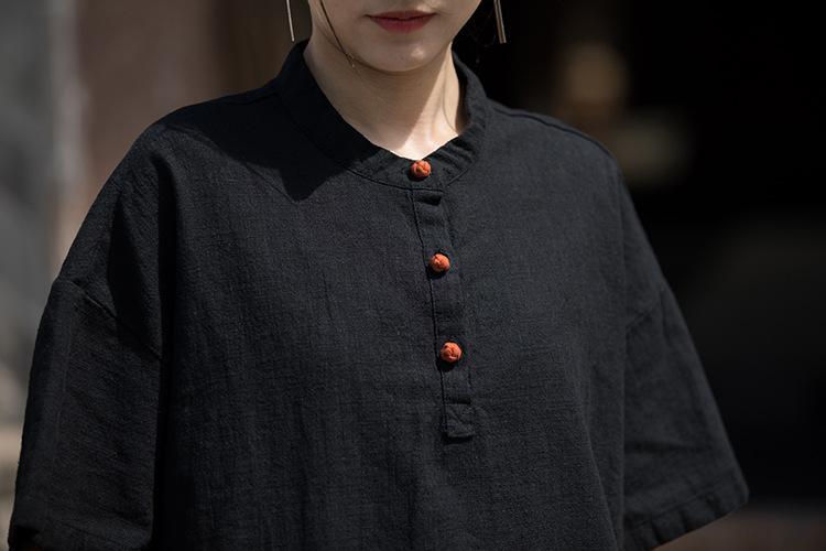 가을 면마 여성복 신상품, 라미 배색 단추 장식 상의, 중국풍 개량 오리지널 신상 중국풍 여성 반팔 티셔츠스토어 가기