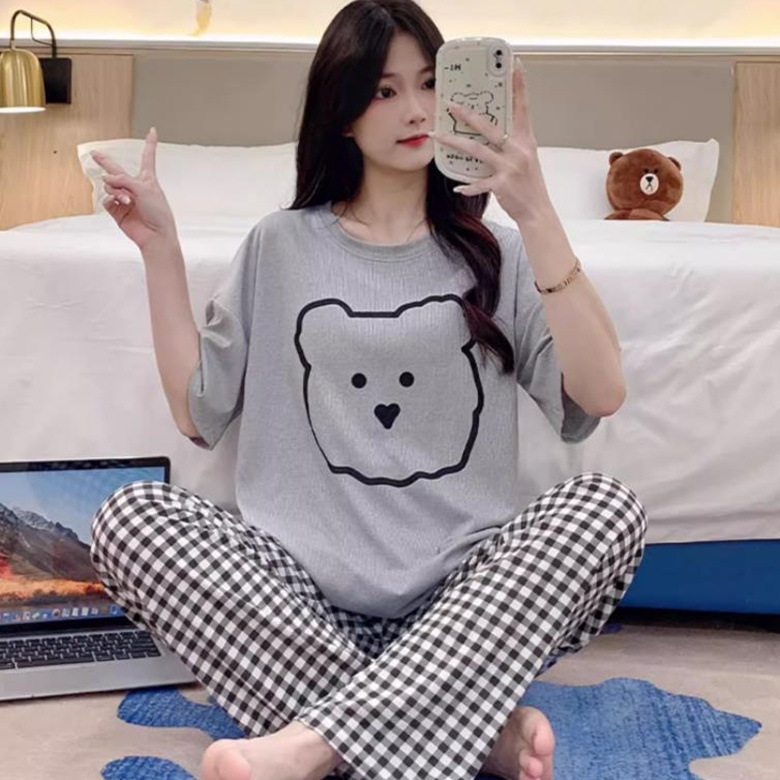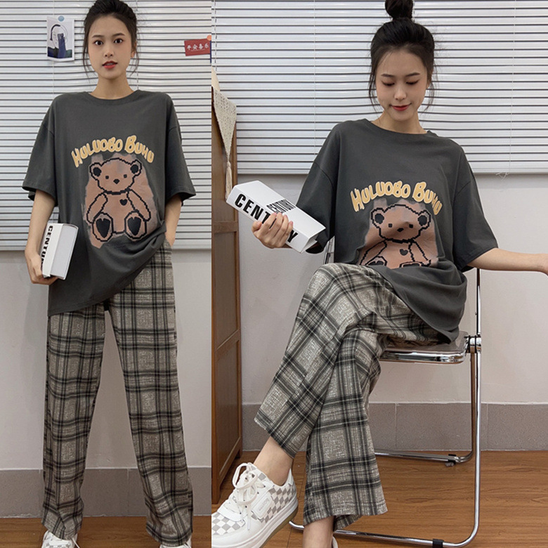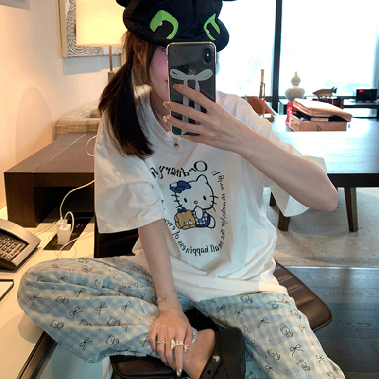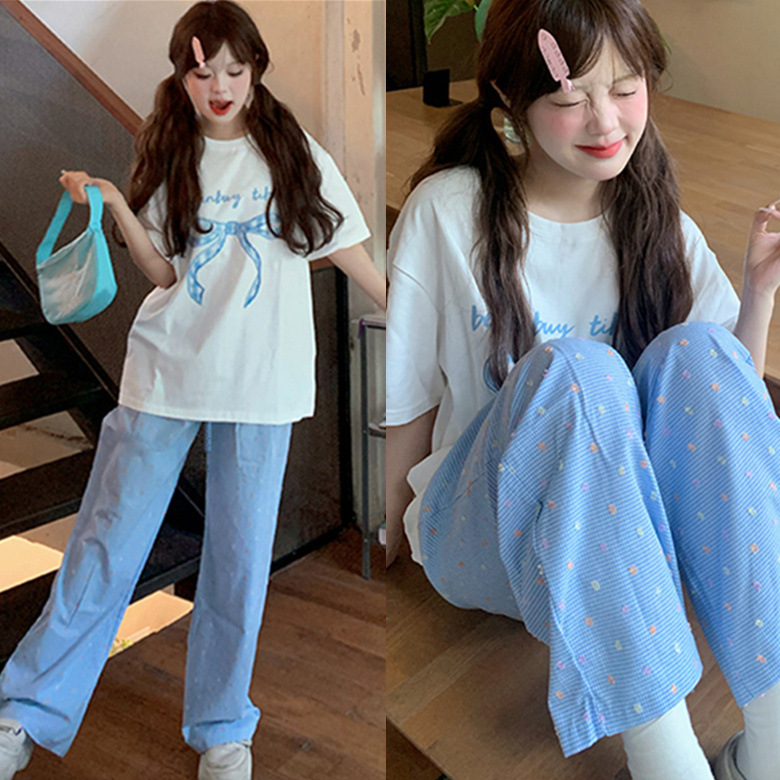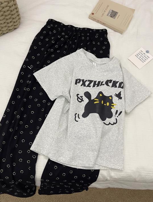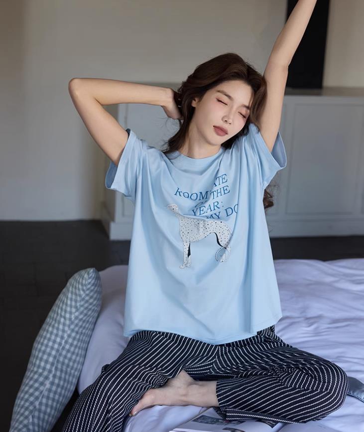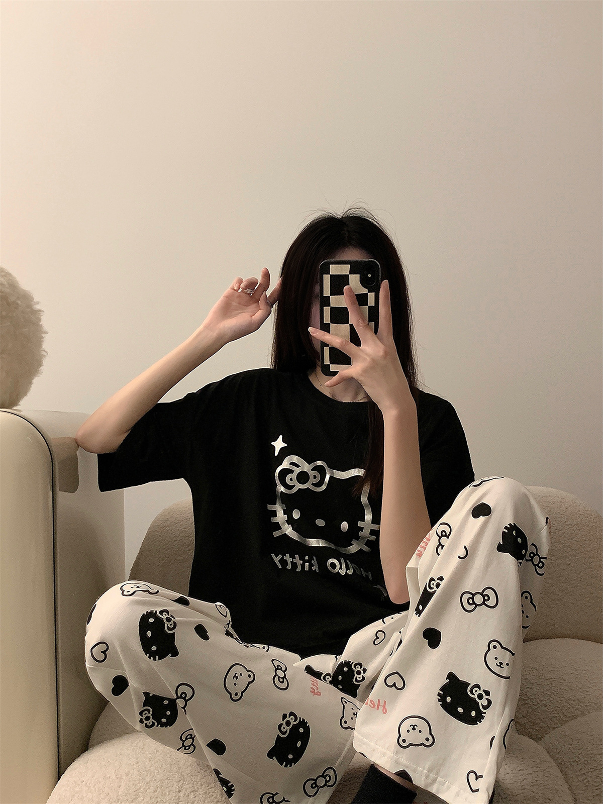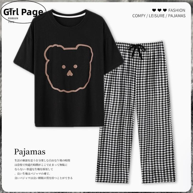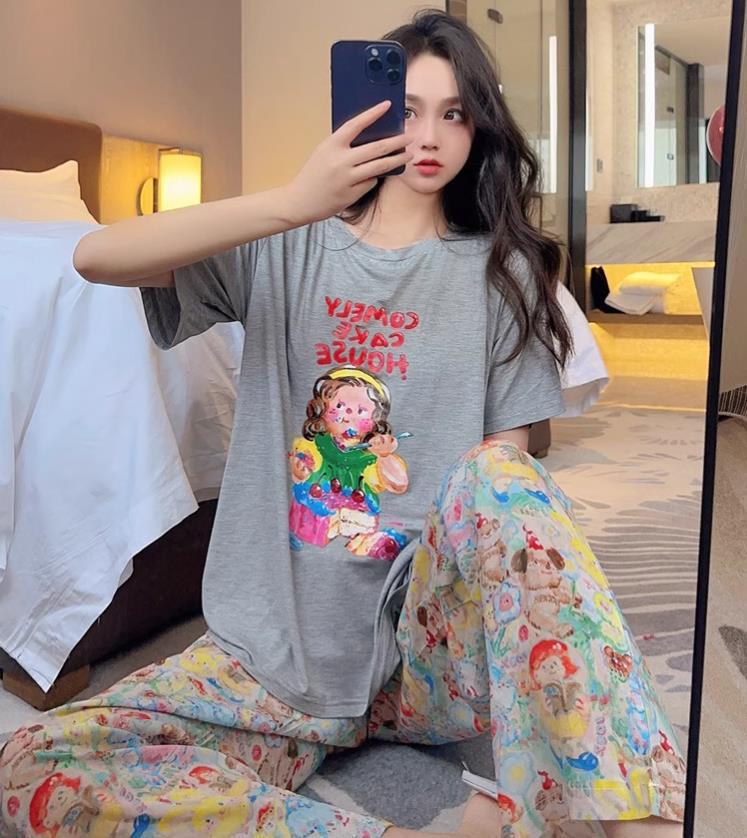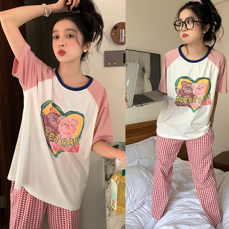새 한국판 파자마 여성 여름 반팔 바지 세트 달콤한 만화는 소녀의 집 옷을 입을 수 있습니다.스토어 가기