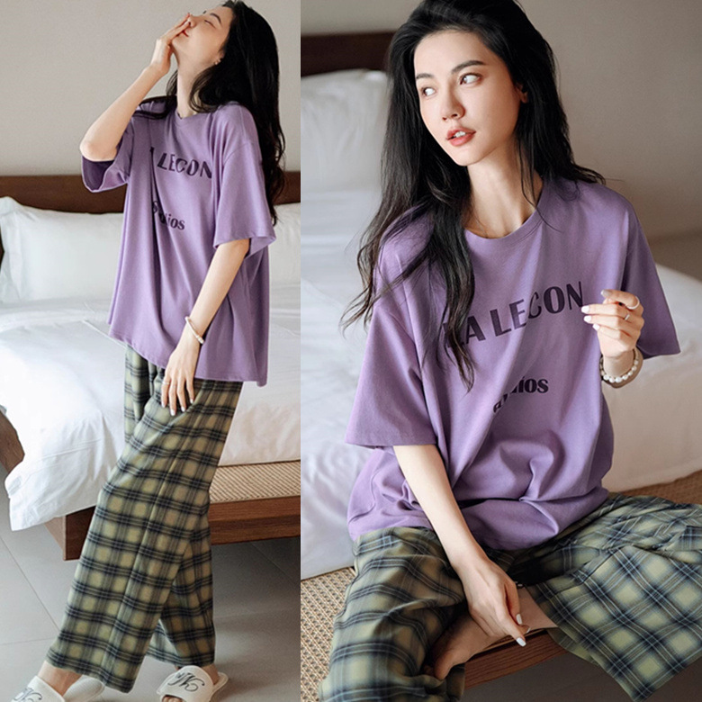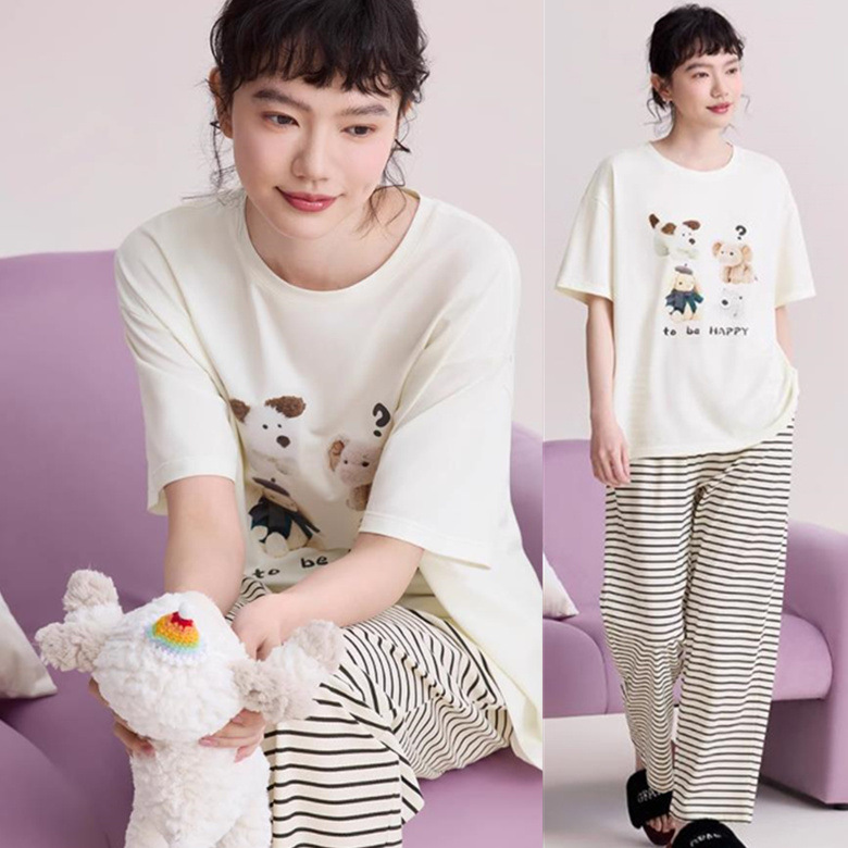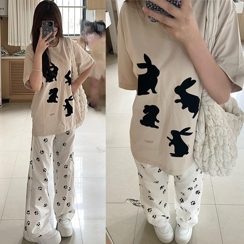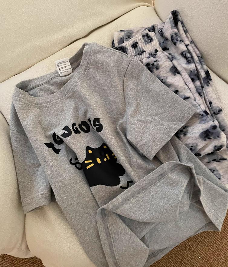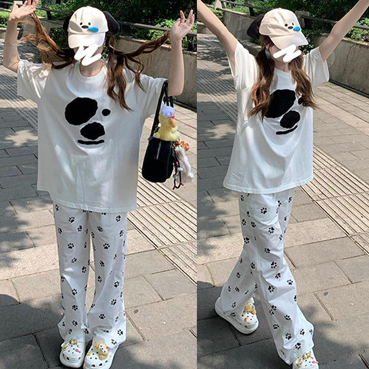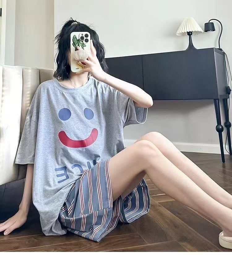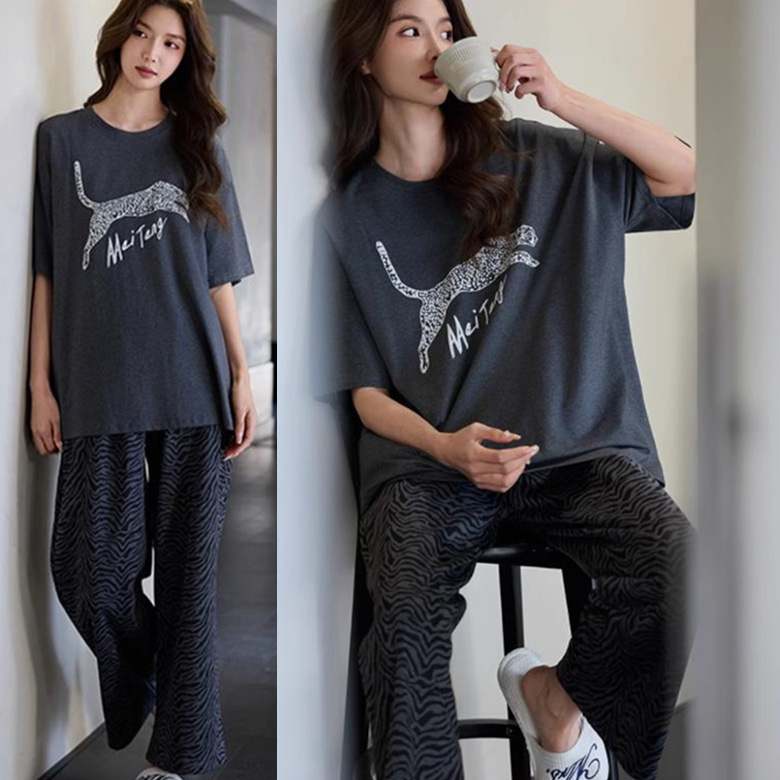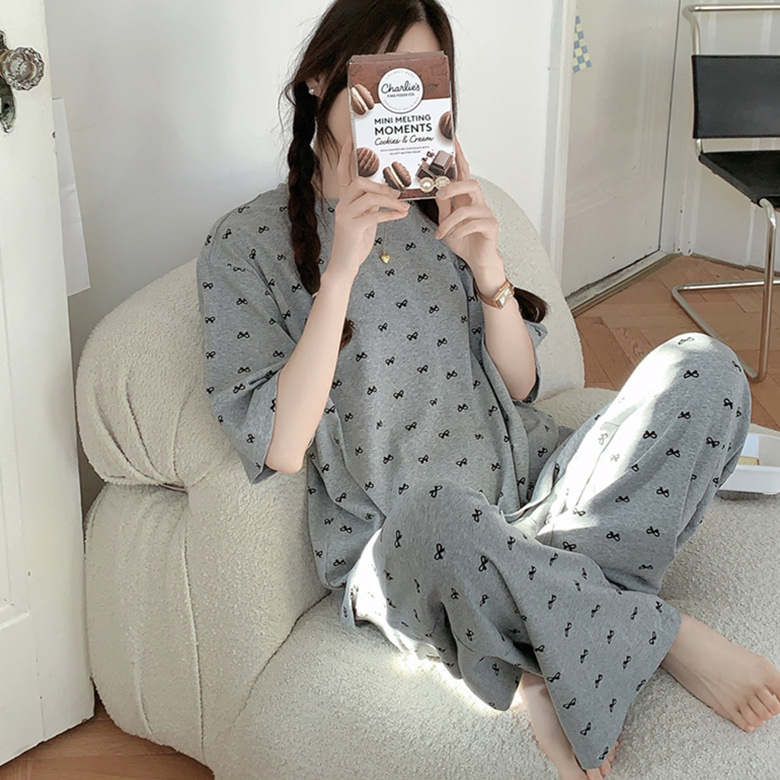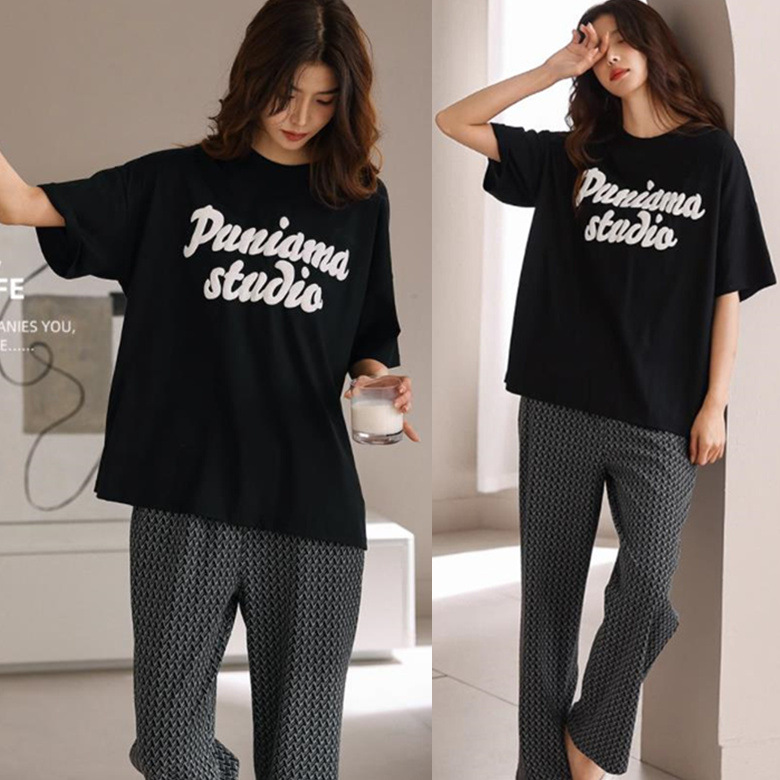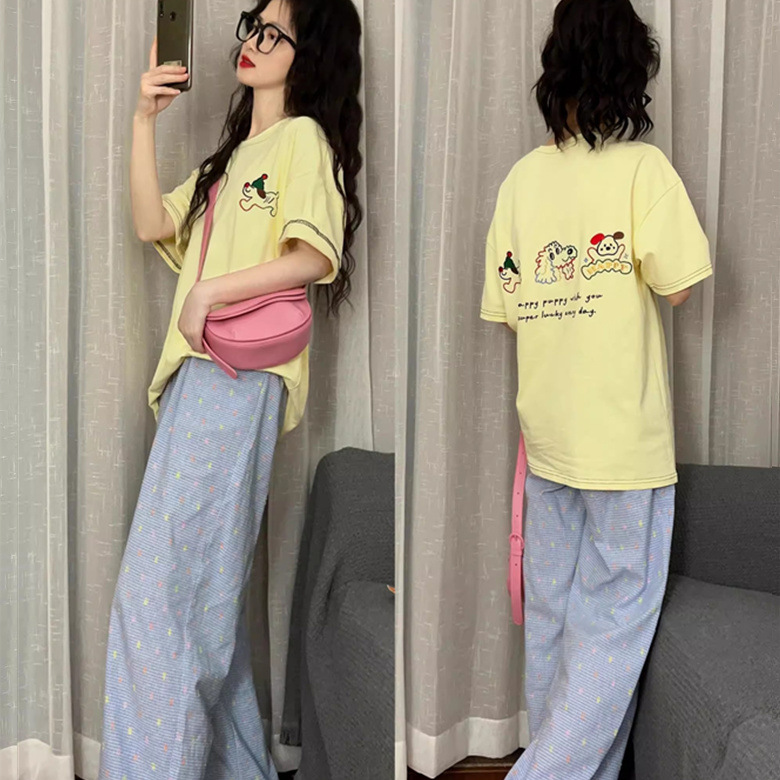 새 한국판 파자마 여성 여름 반팔 바지 세트 달콤한 만화는 소녀의 집 옷을 입을 수 있습니다.스토어 가기