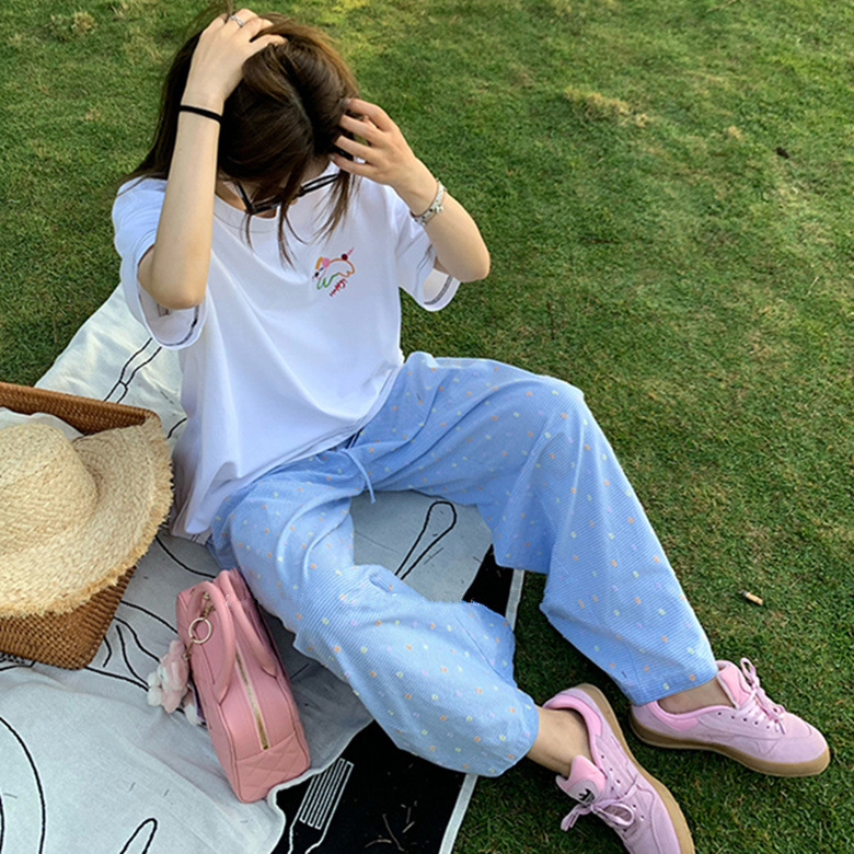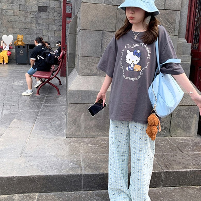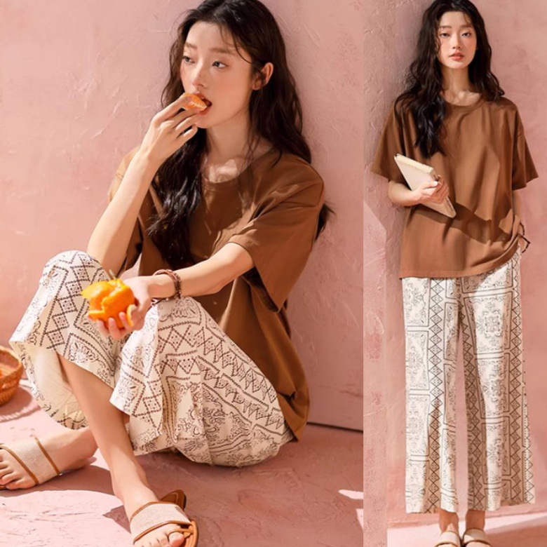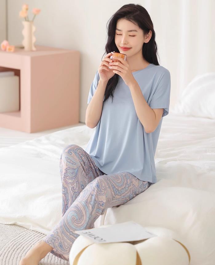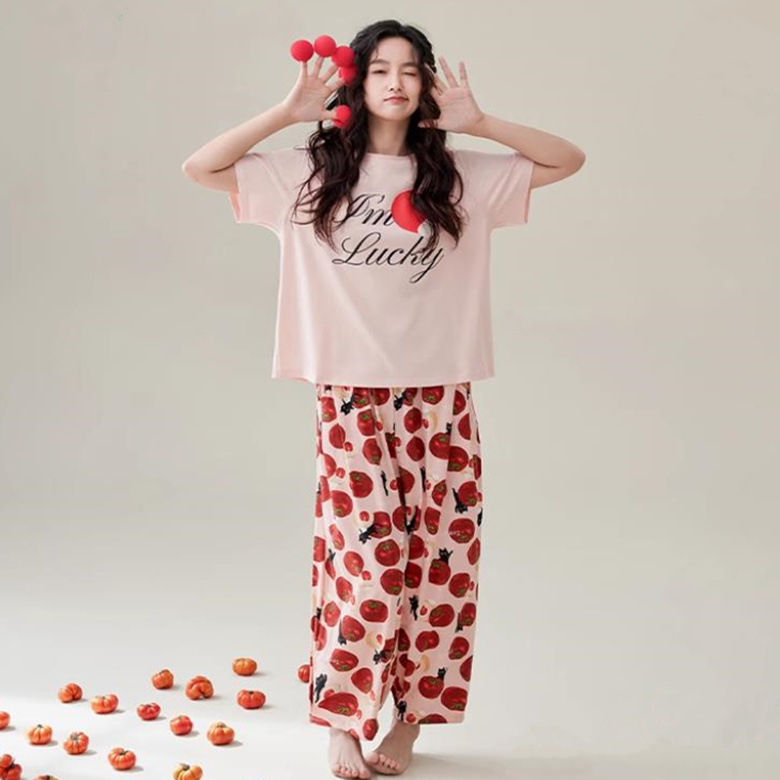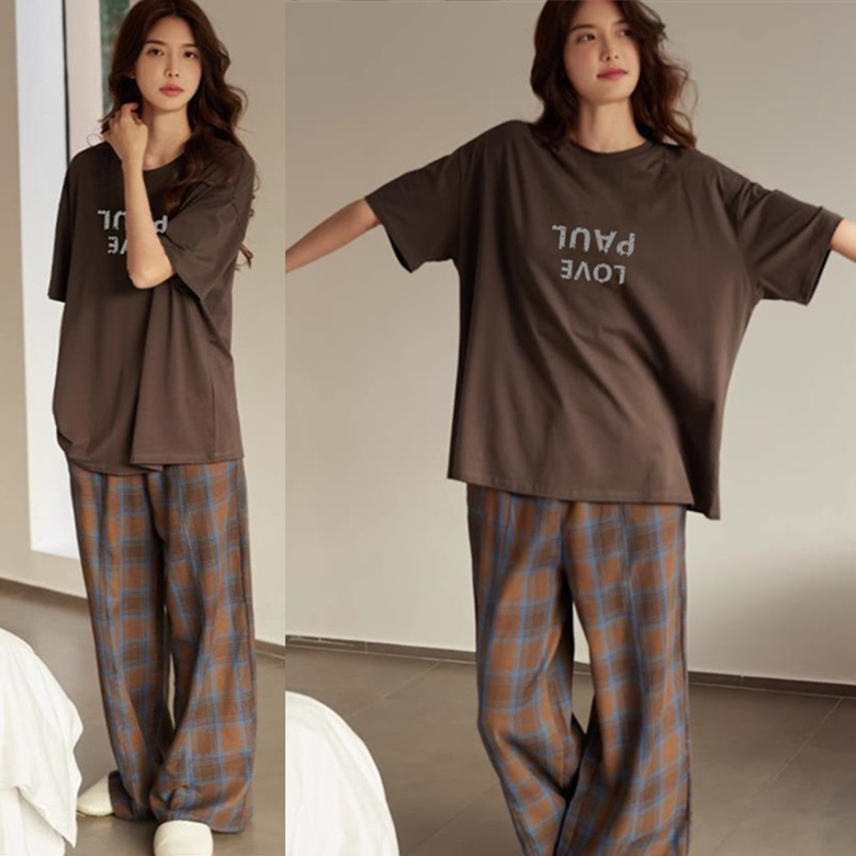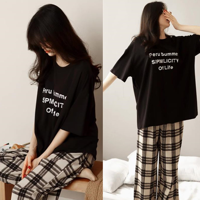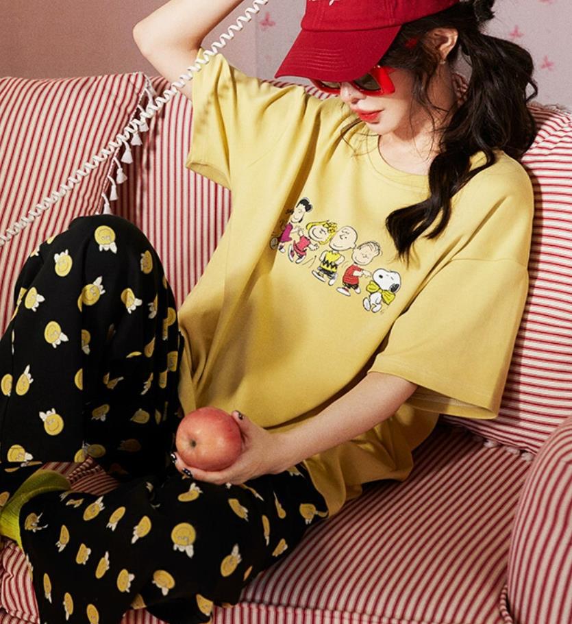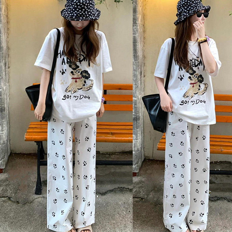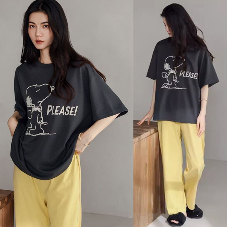 새 한국판 파자마 여성 여름 반팔 바지 세트 달콤한 만화는 소녀의 집 옷을 입을 수 있습니다.스토어 가기