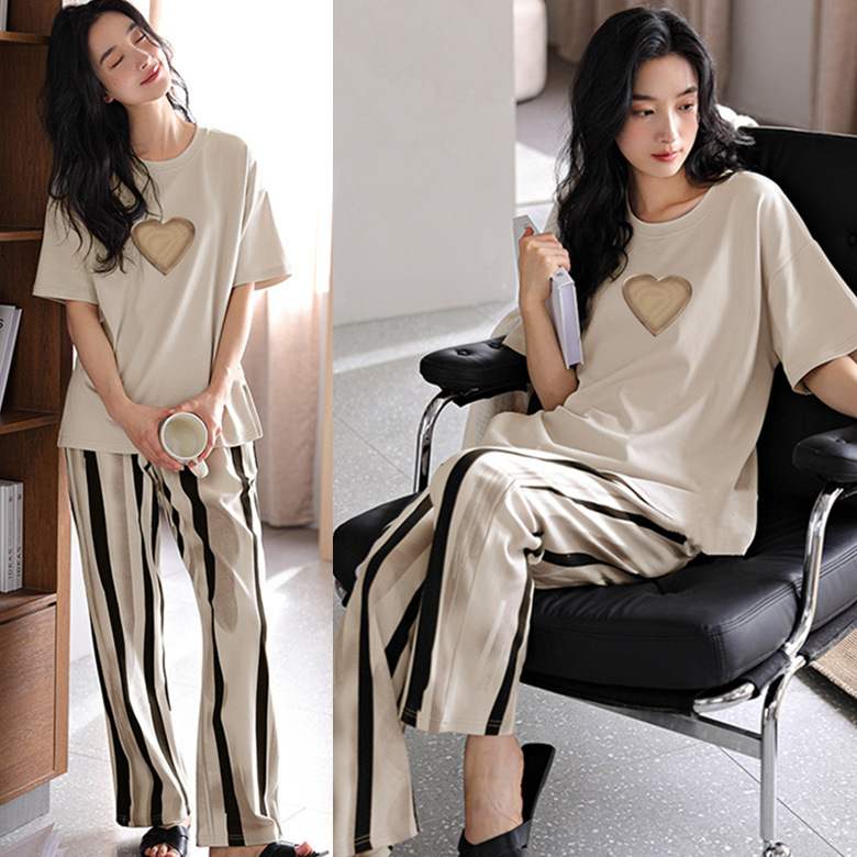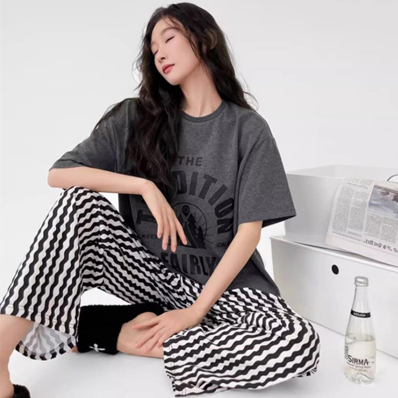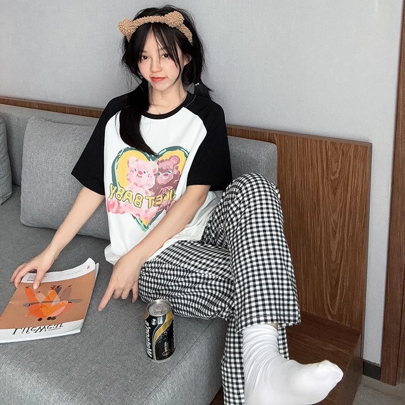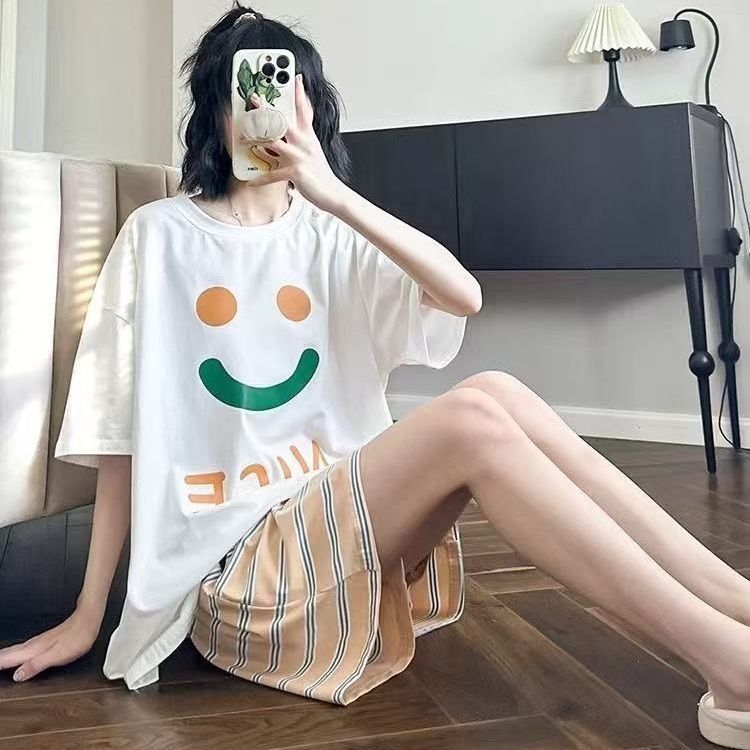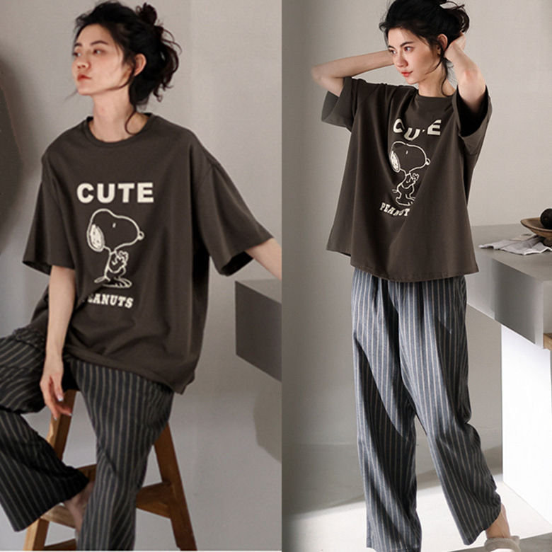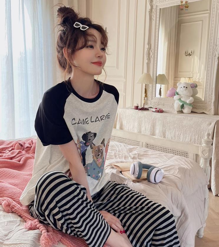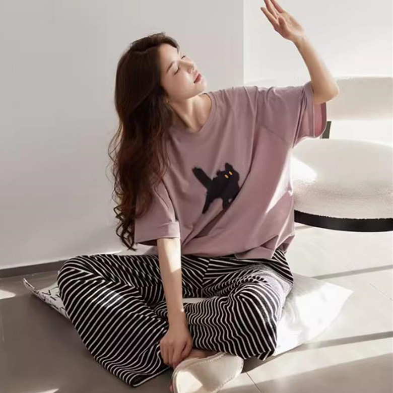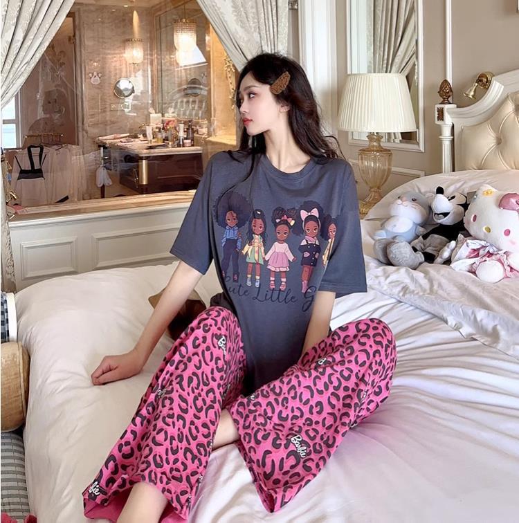 새 한국판 파자마 여성 여름 반팔 바지 세트 달콤한 만화는 소녀의 집 옷을 입을 수 있습니다.
