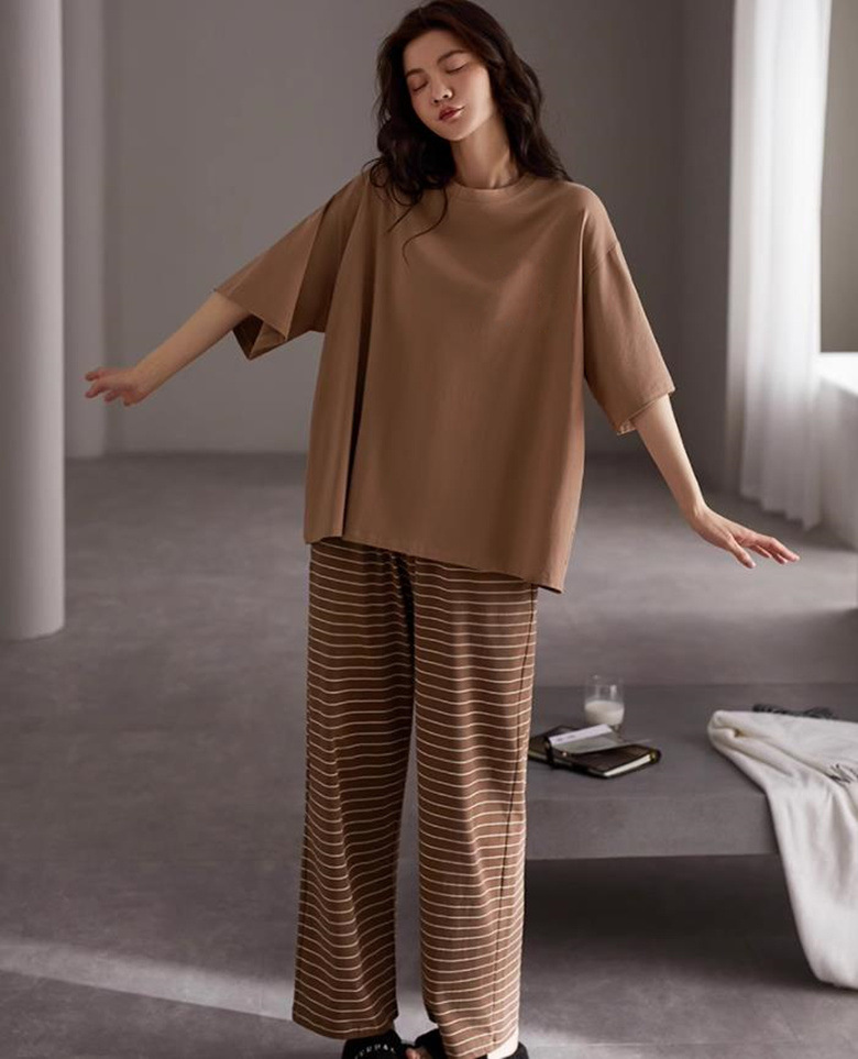 • 짧은 갈색 셔츠와 갈색 줄무늬 바지