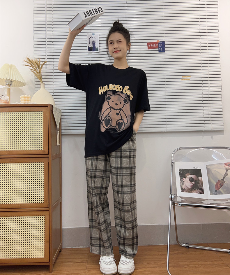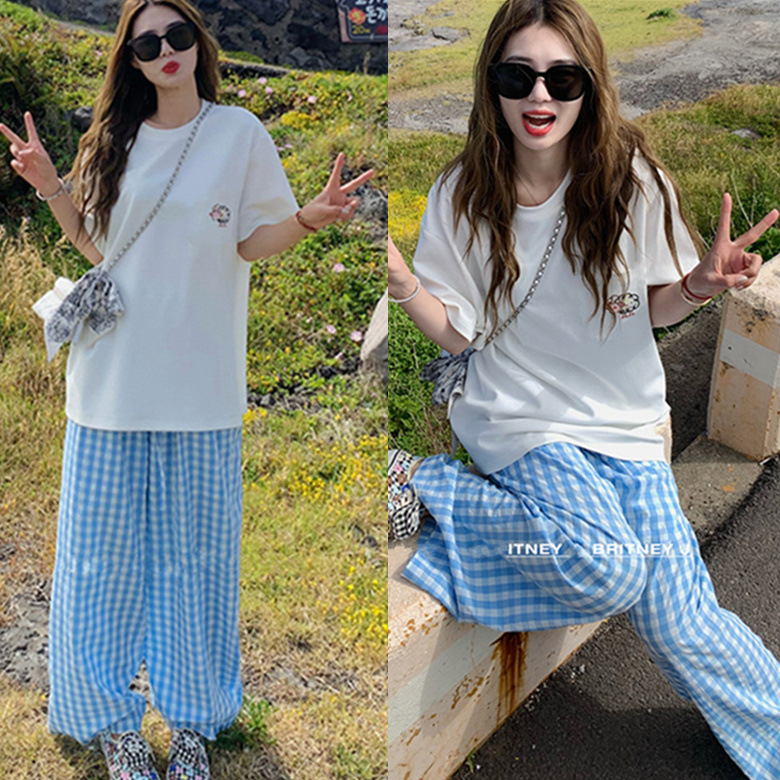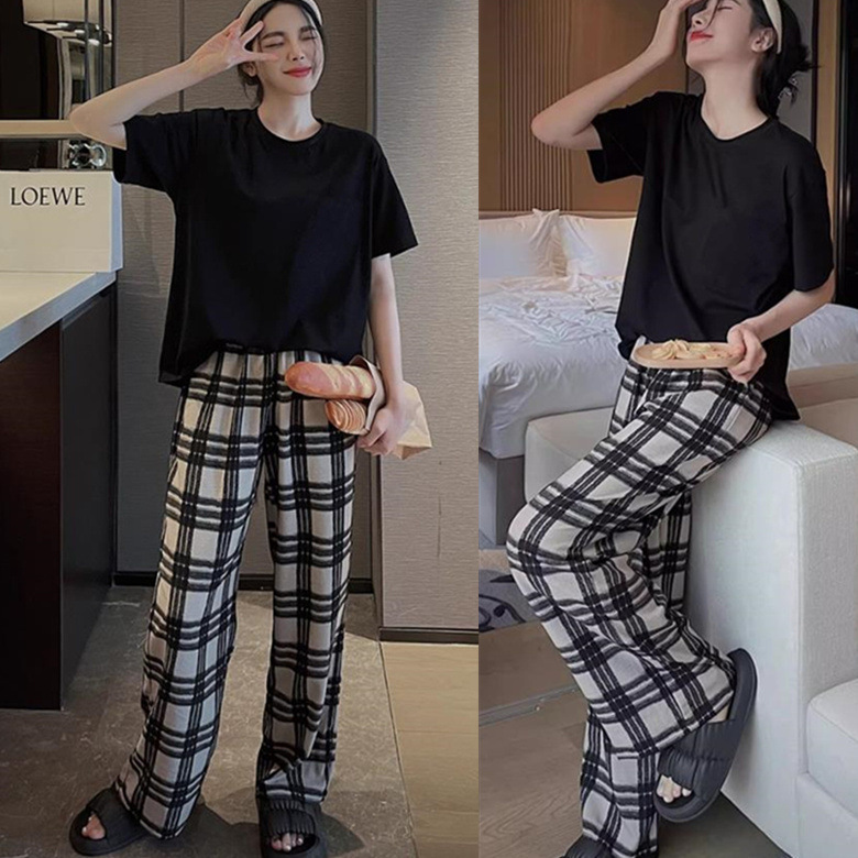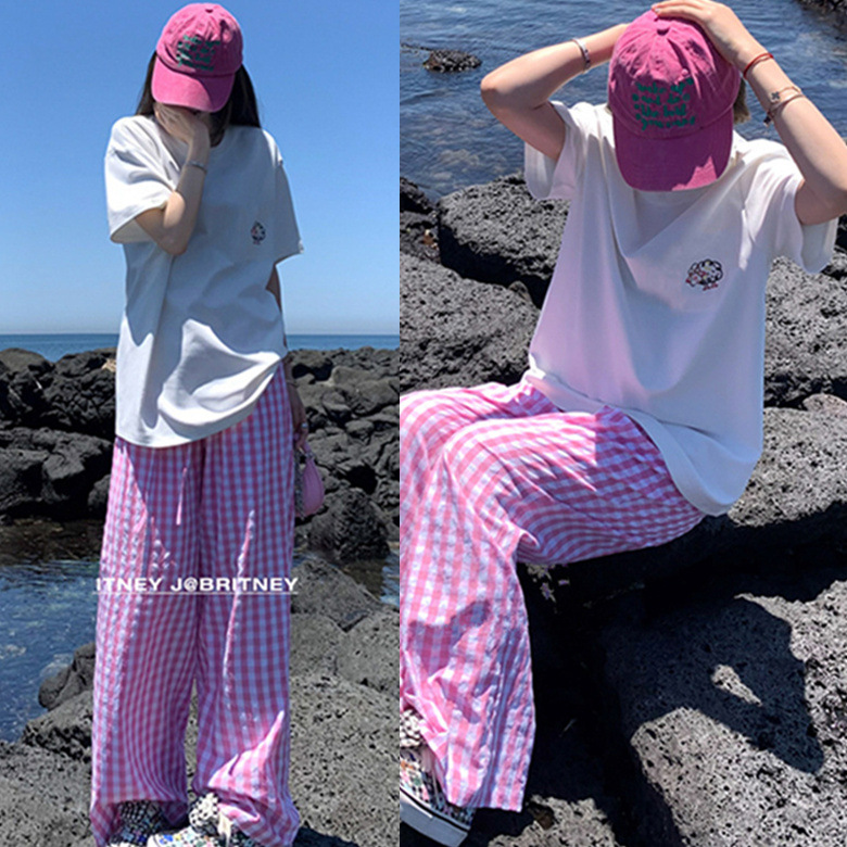 • 흑백 글자 두꺼운 살구 체크 팬츠 짧고 길다