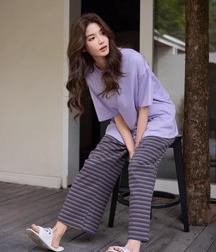 • 연한 보라색 셔츠와 보라색 줄무늬 바지, 짧고 길다