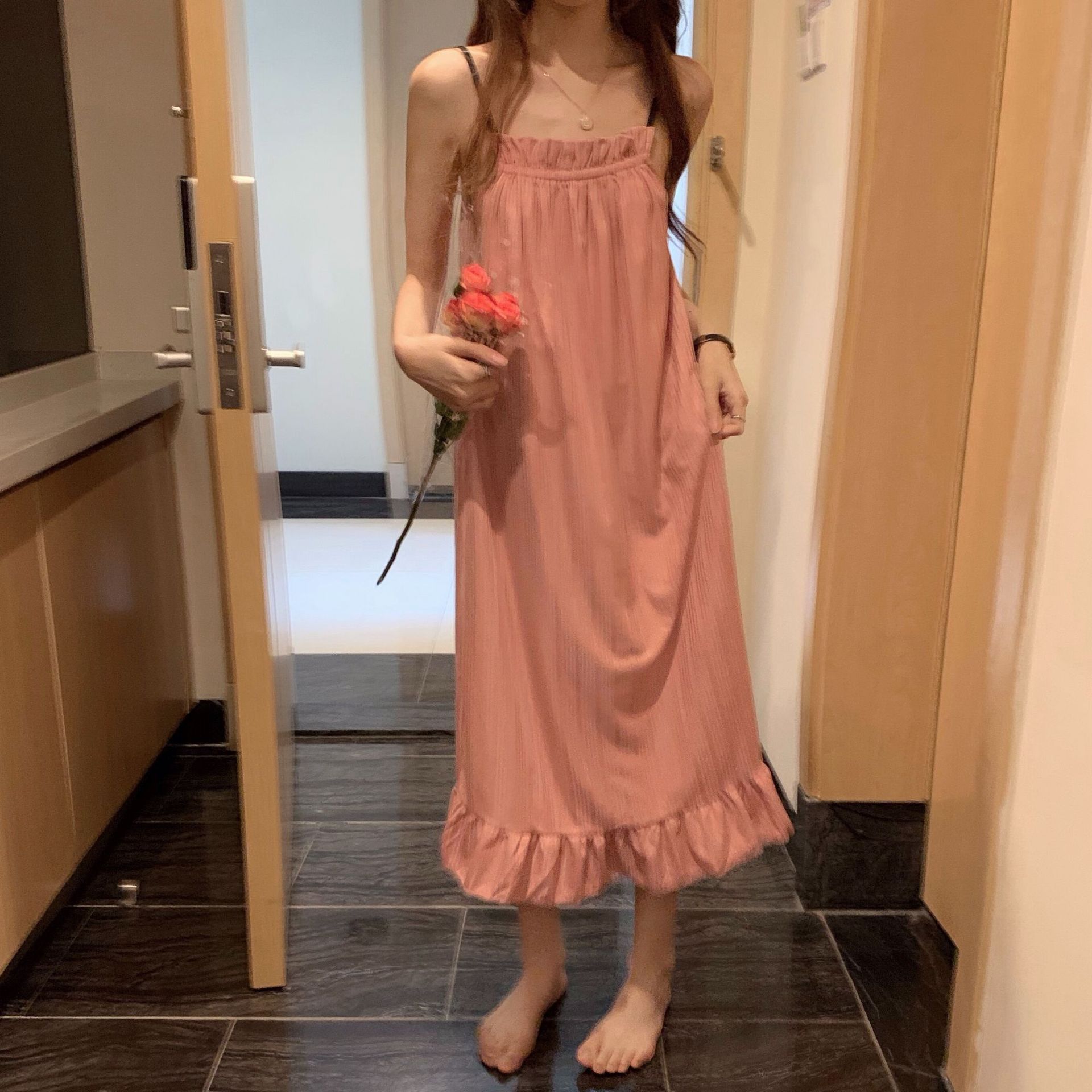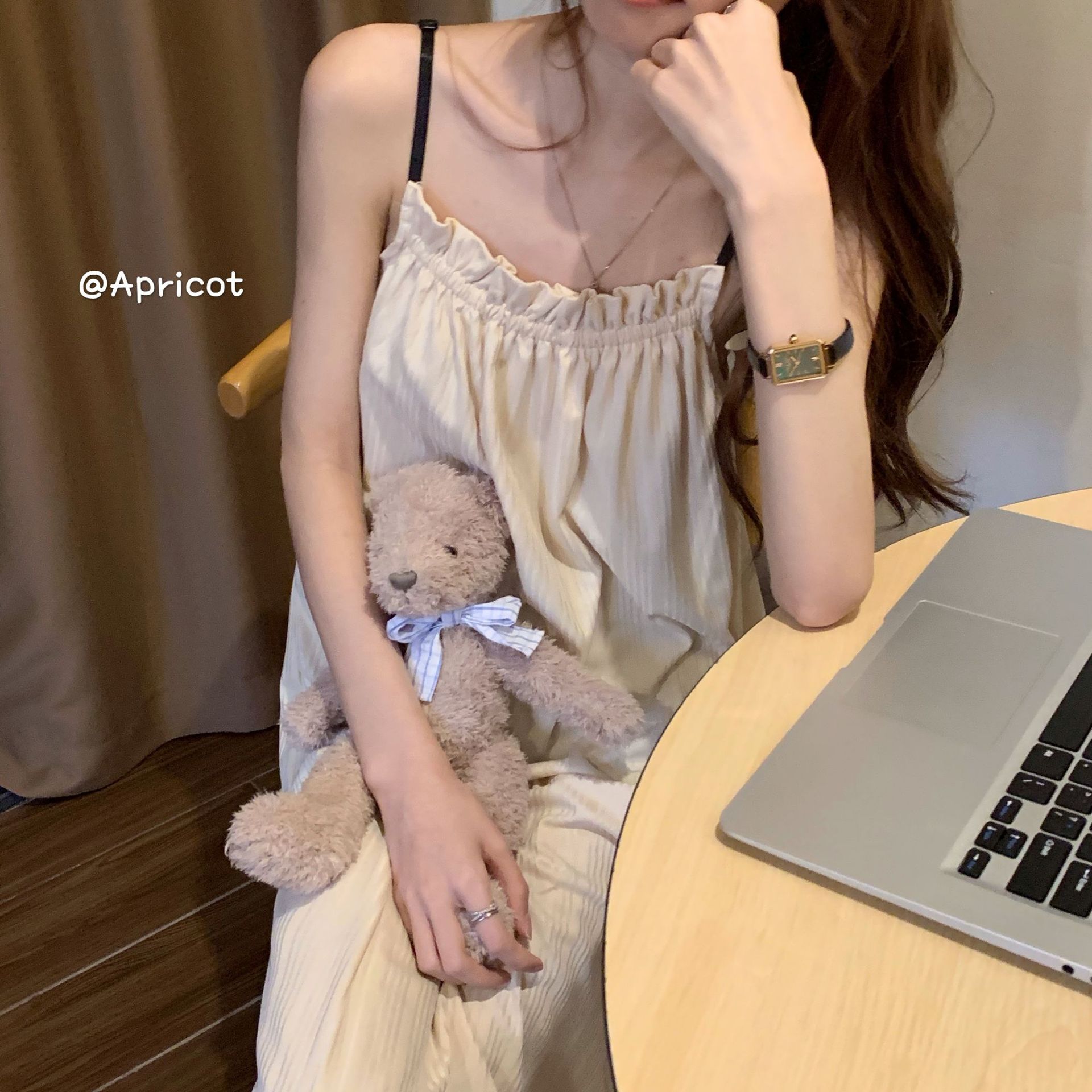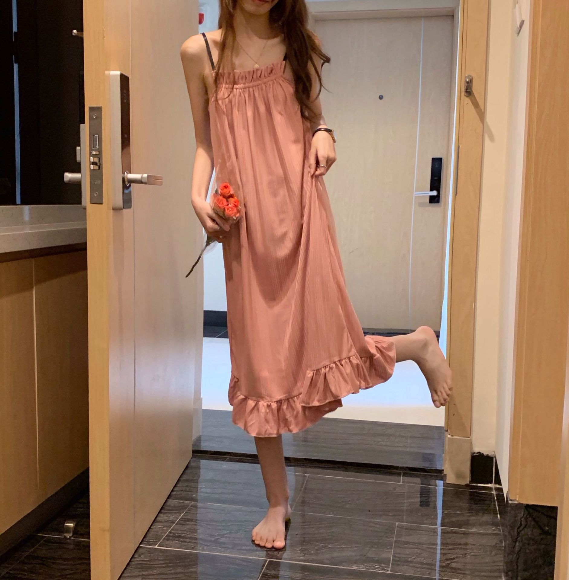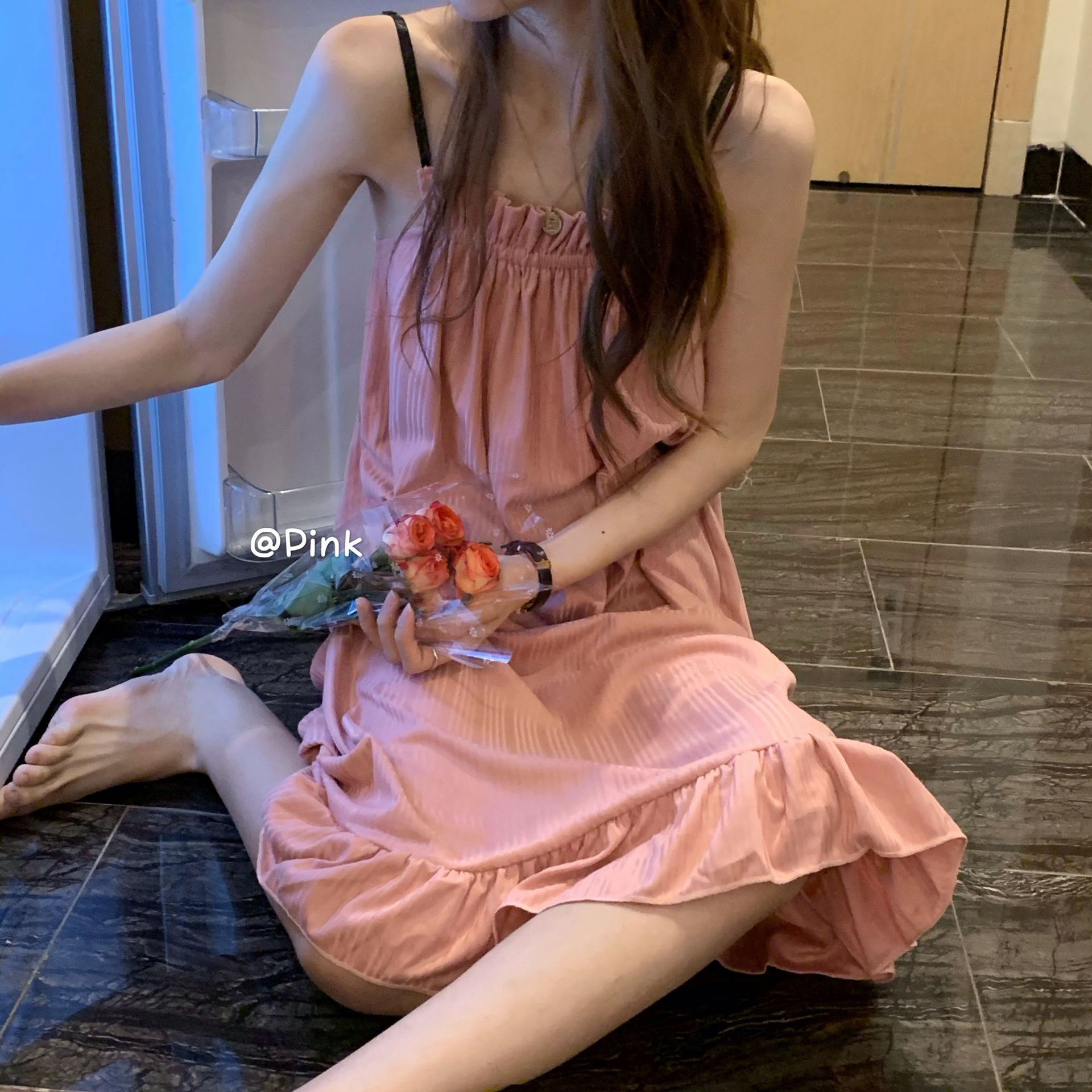 여성용 핑크 서스펜더 잠옷, 여름용 달콤한 한국 스타일 밀크 실크 핏 스트라이프 잠옷, 여성용 홈웨어, 드롭쉬핑스토어 가기