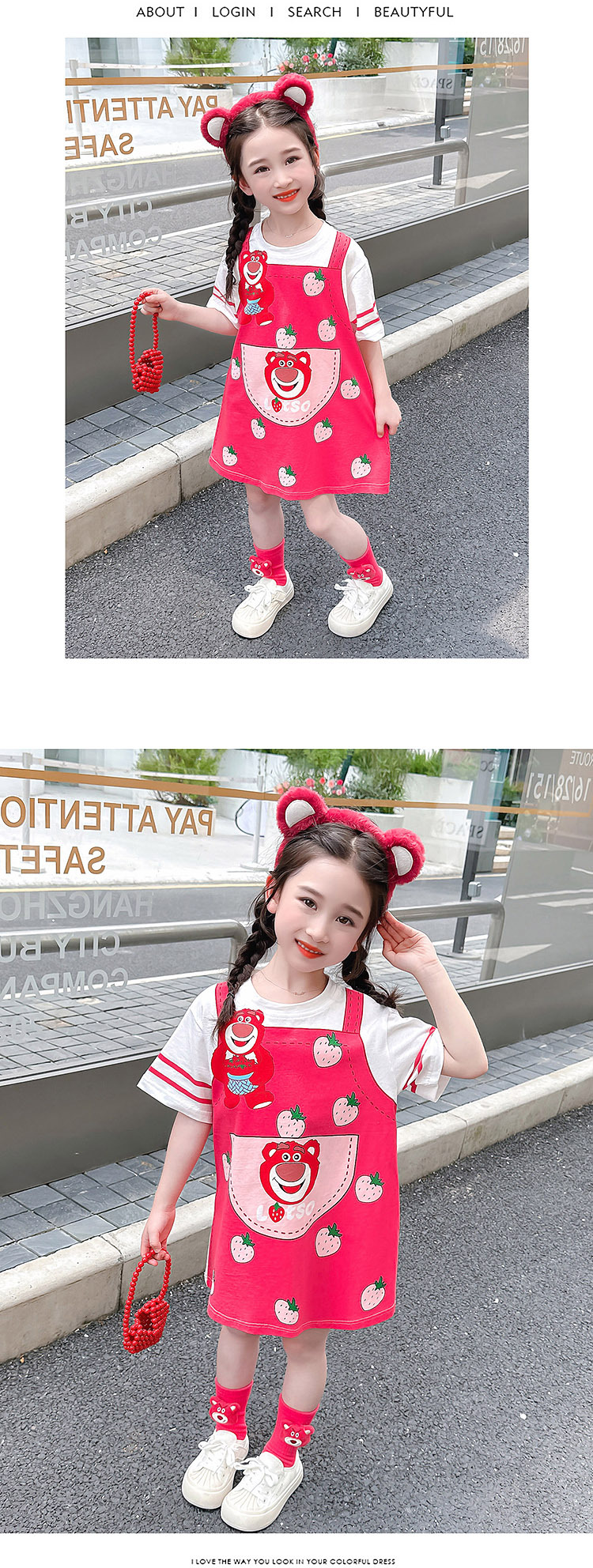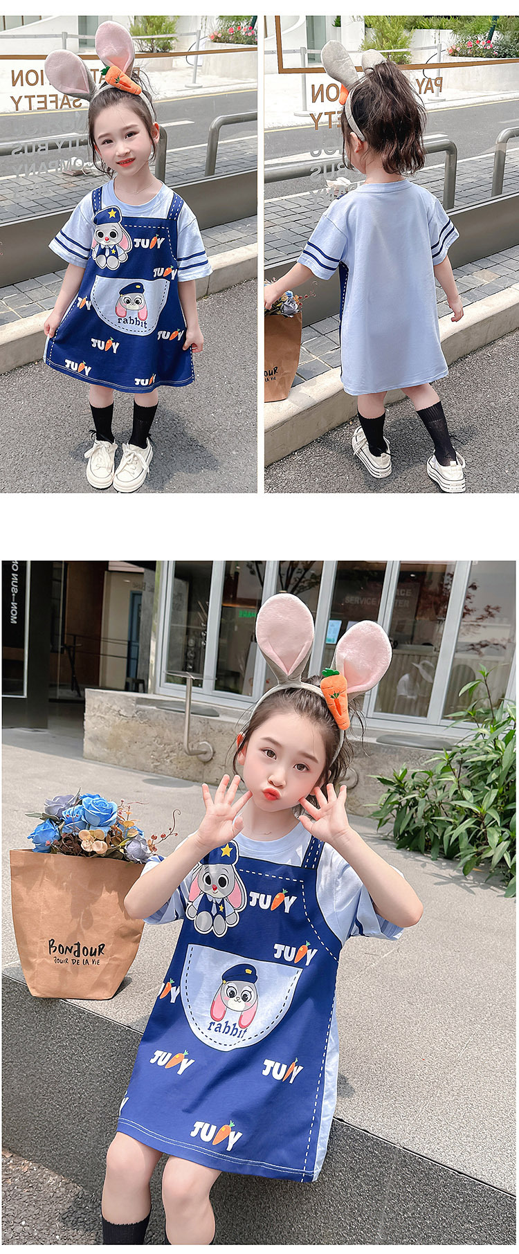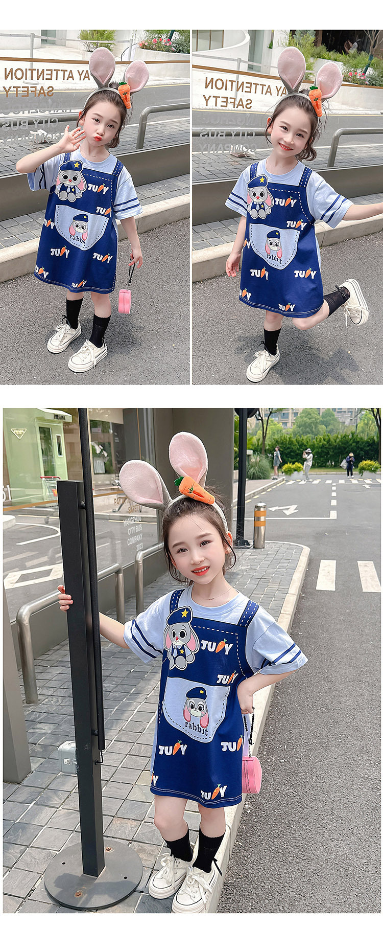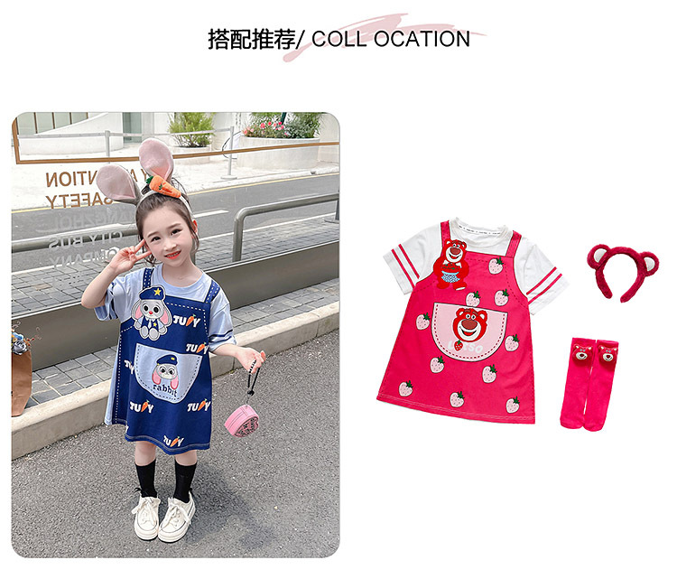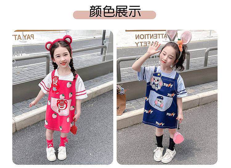 여름 반팔 소녀 딸기 곰 주디 토끼 귀여운 만화 원피스 가짜 투피스 티셔츠 스커트 새로운 올매치스토어 가기