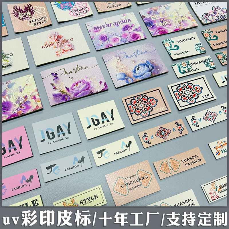 UV 컬러 인쇄 가죽 라벨 10 년 공장 pu 가죽 인쇄 오일 로고 가죽 배지 의류 장식 표준 가방 가죽 브랜드스토어 가기