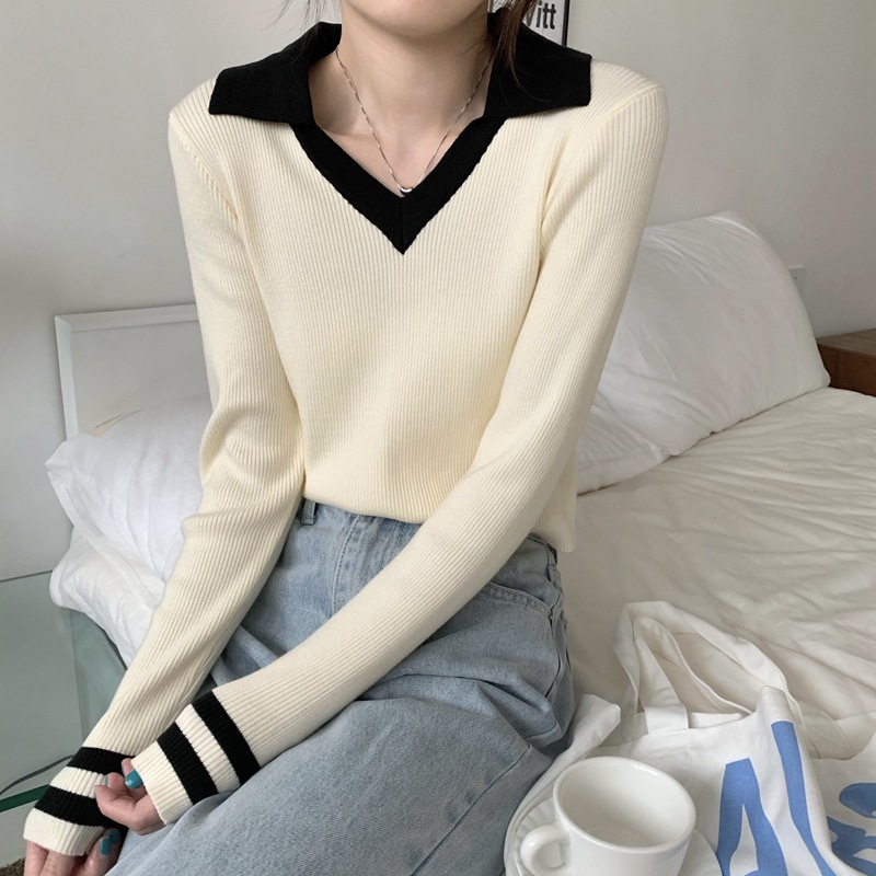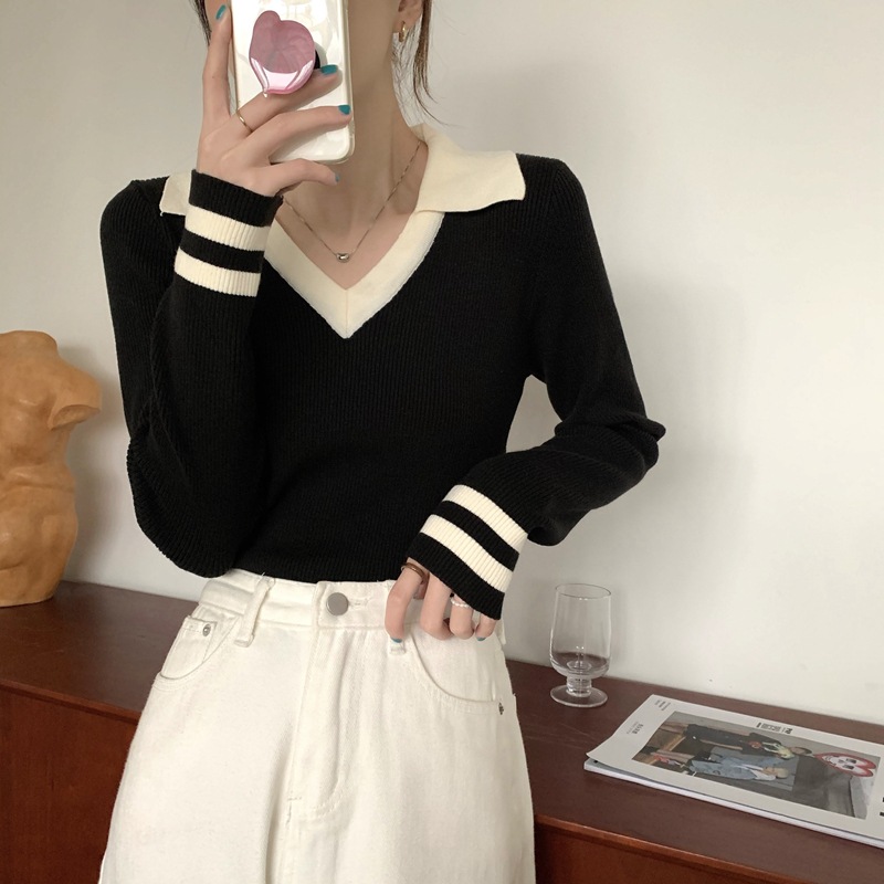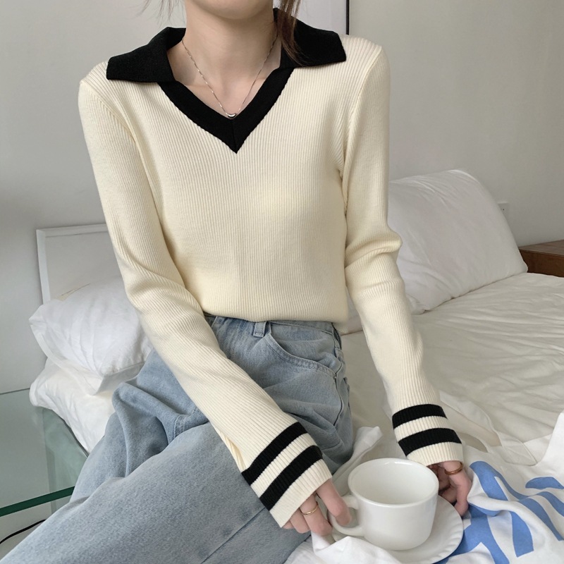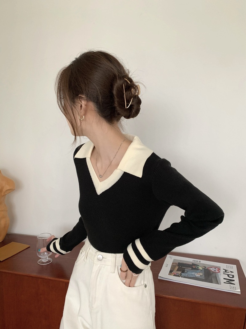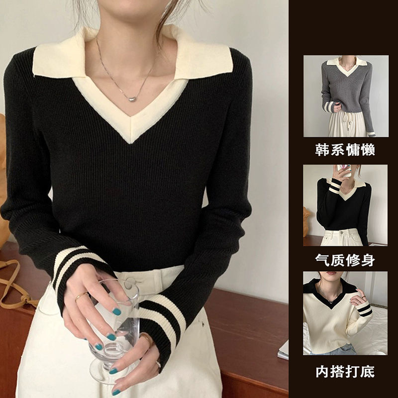 가을 겨울 인스 스타일 슬림핏 폴로 칼라 기품있는 출퇴근용 다용도 니트 스웨터 여성 상의 슬림핏 슬림 효과