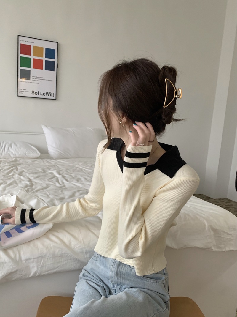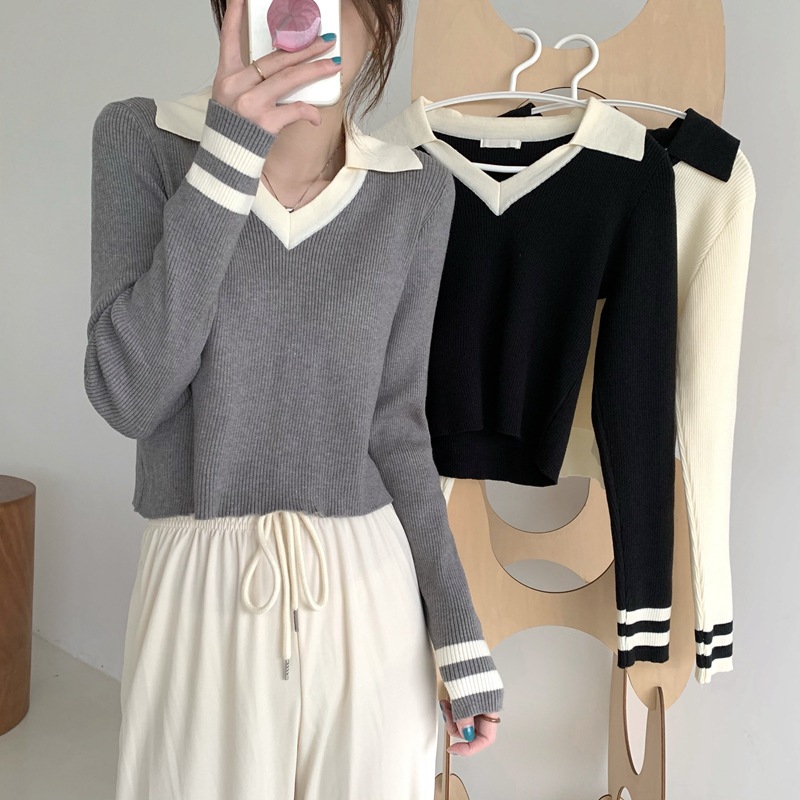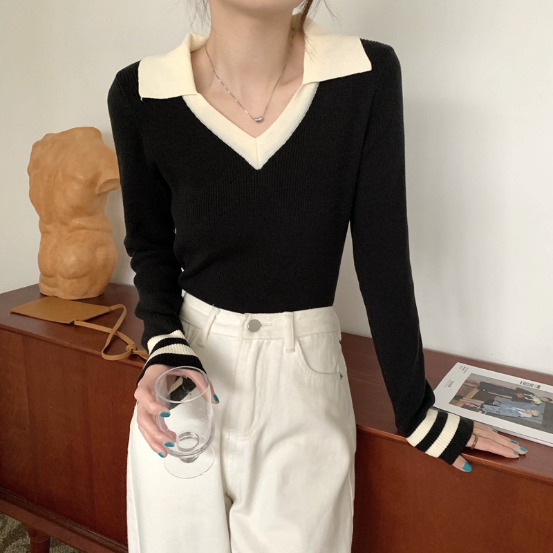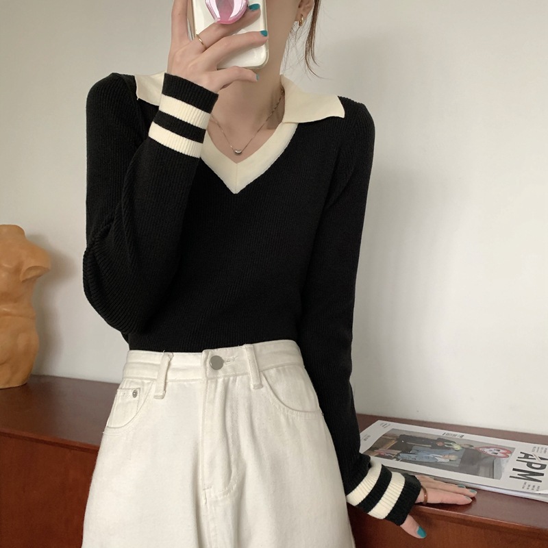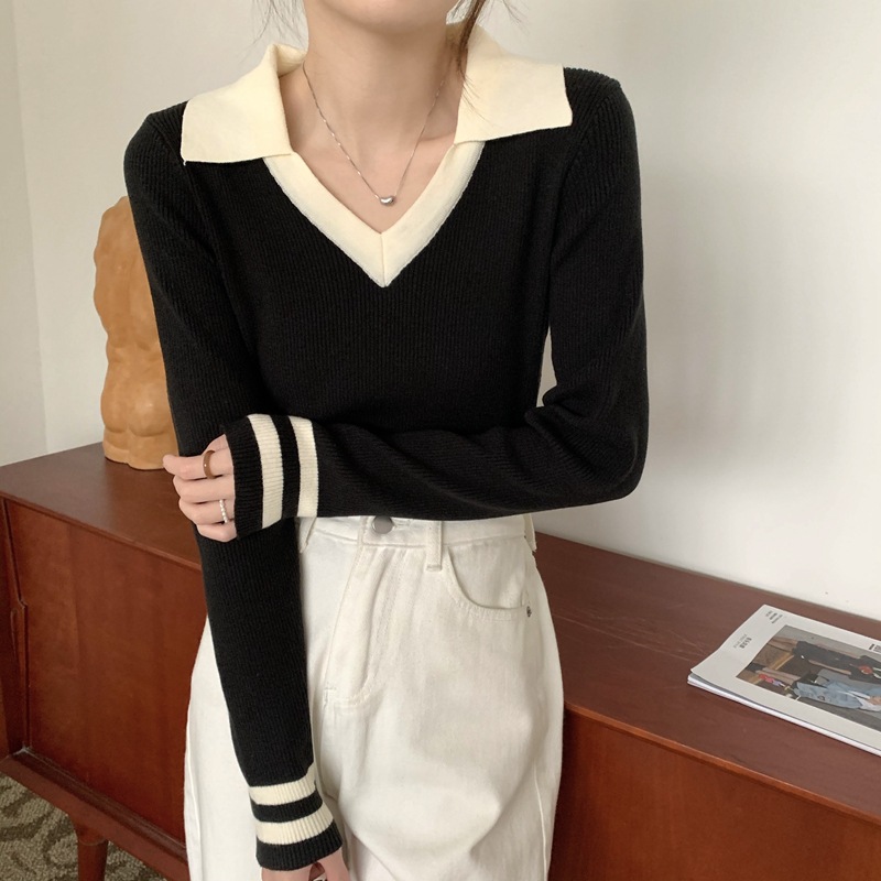 가을 겨울 인스 스타일 슬림핏 폴로 칼라 기품있는 출퇴근용 다용도 니트 스웨터 여성 상의 슬림핏 슬림 효과