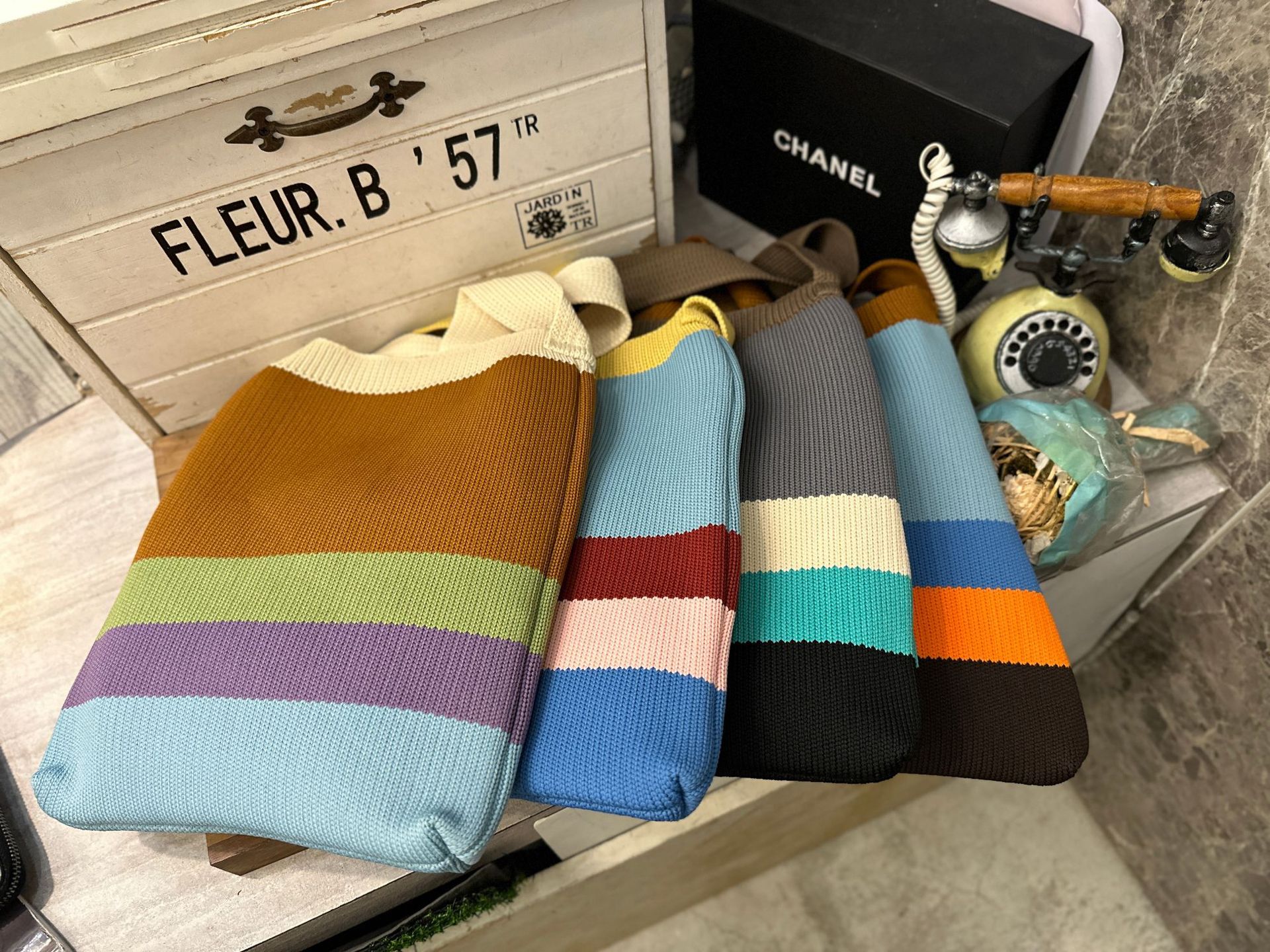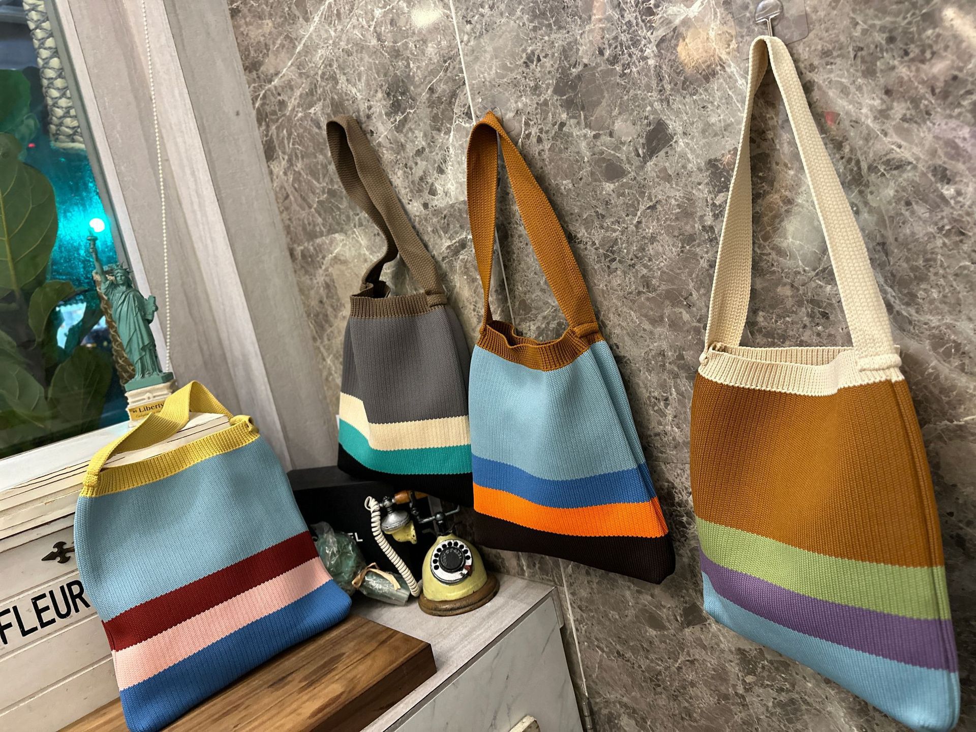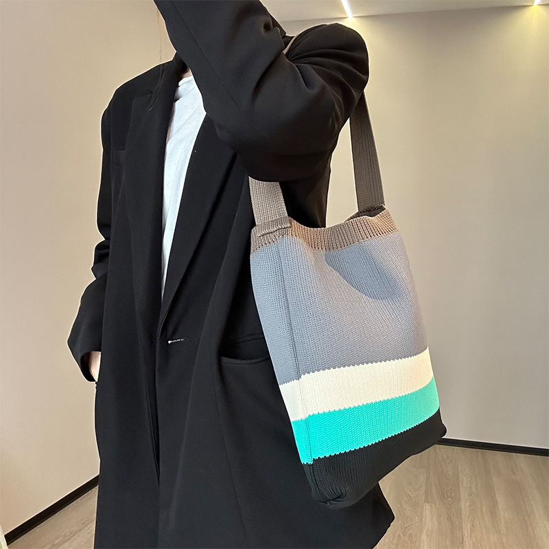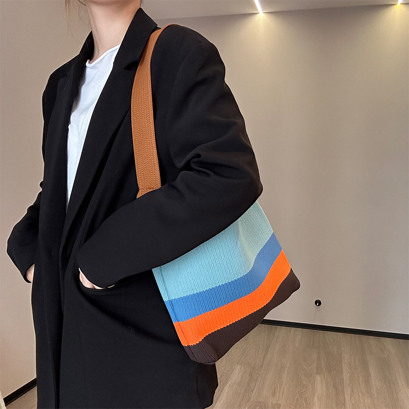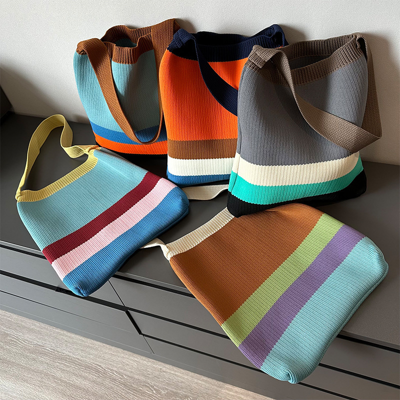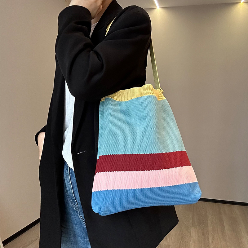 새로운 레인보우 컬러 니트 백 학생 한국 스타일 간단한 올 매치 스트라이프 숄더 백 토트 백 대용량 여성용 가방스토어 가기