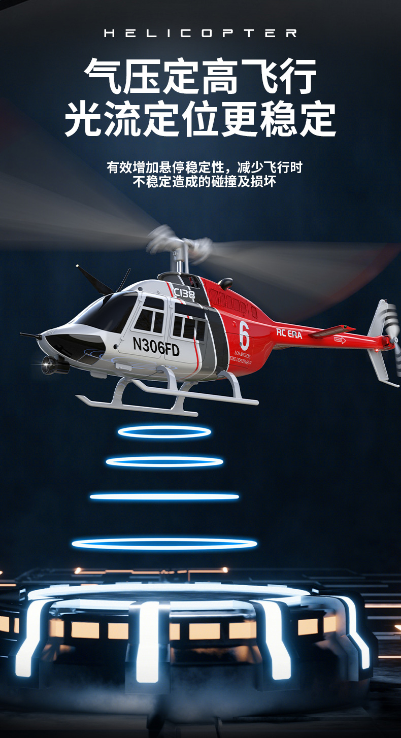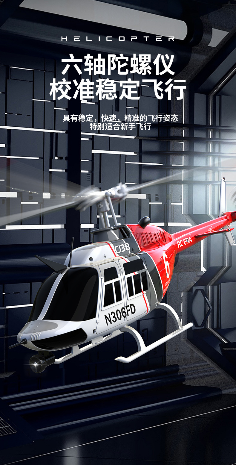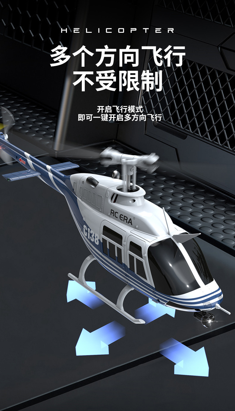 采用单桨无副翼设计,6轴电子陀螺仪增稳,并加入气压计定高,飞行更稳定,更容易操纵!超长续航时间!耐撞击!外形按真机等比例缩小,不但可以操控飞行也可以当摆件。C138续航时间可达到12分钟左右!(可选配光流定位,后续会新增配件,敬请期待!!!)