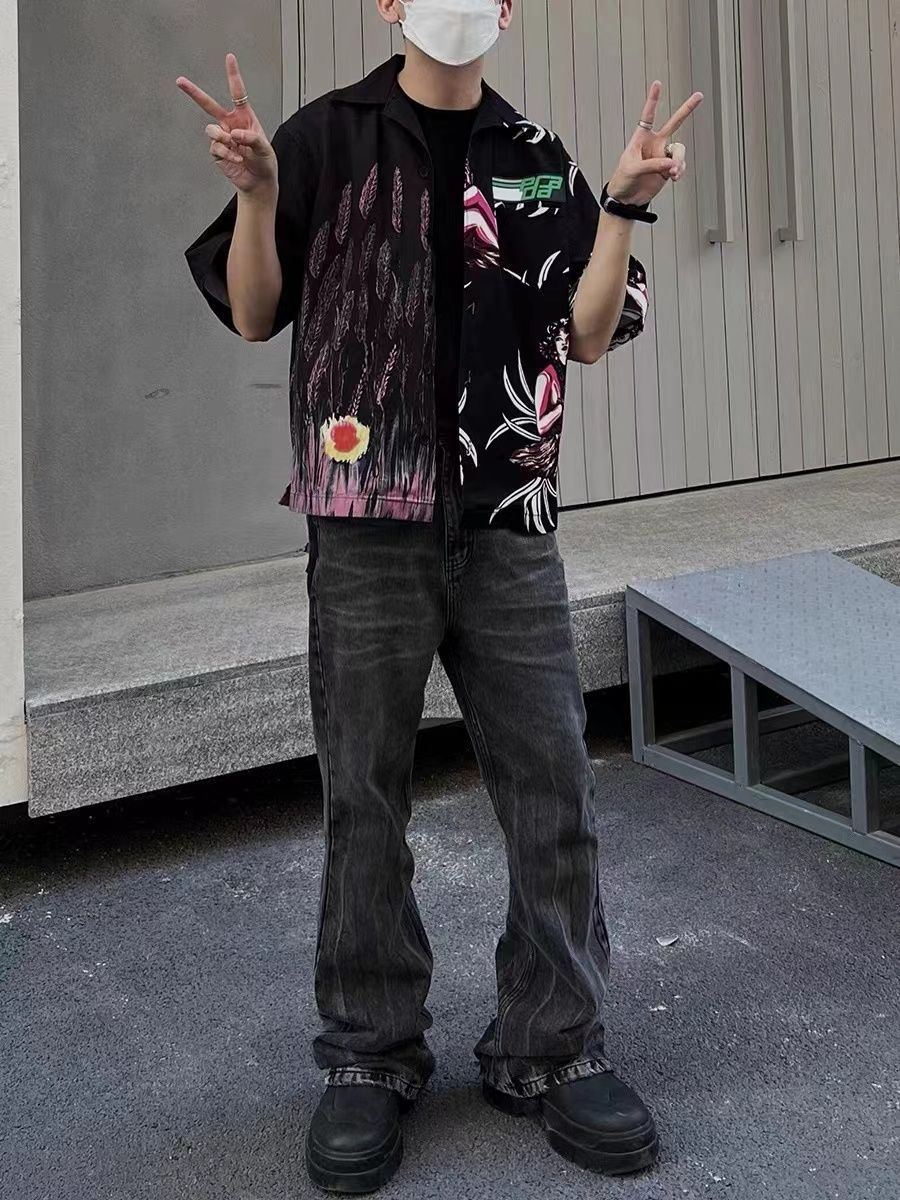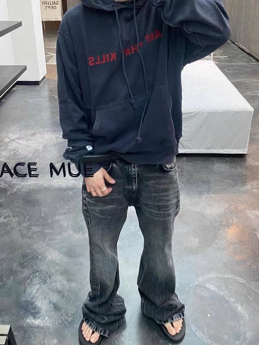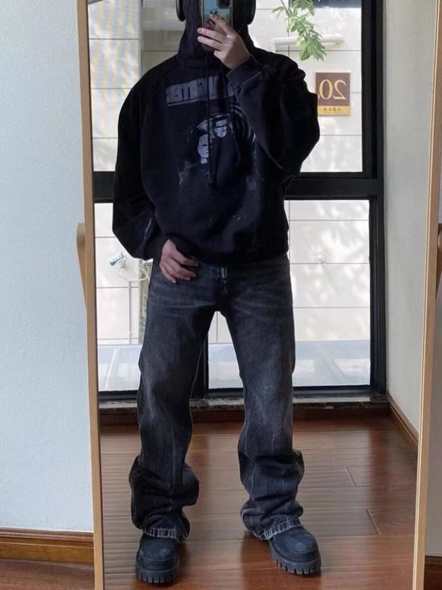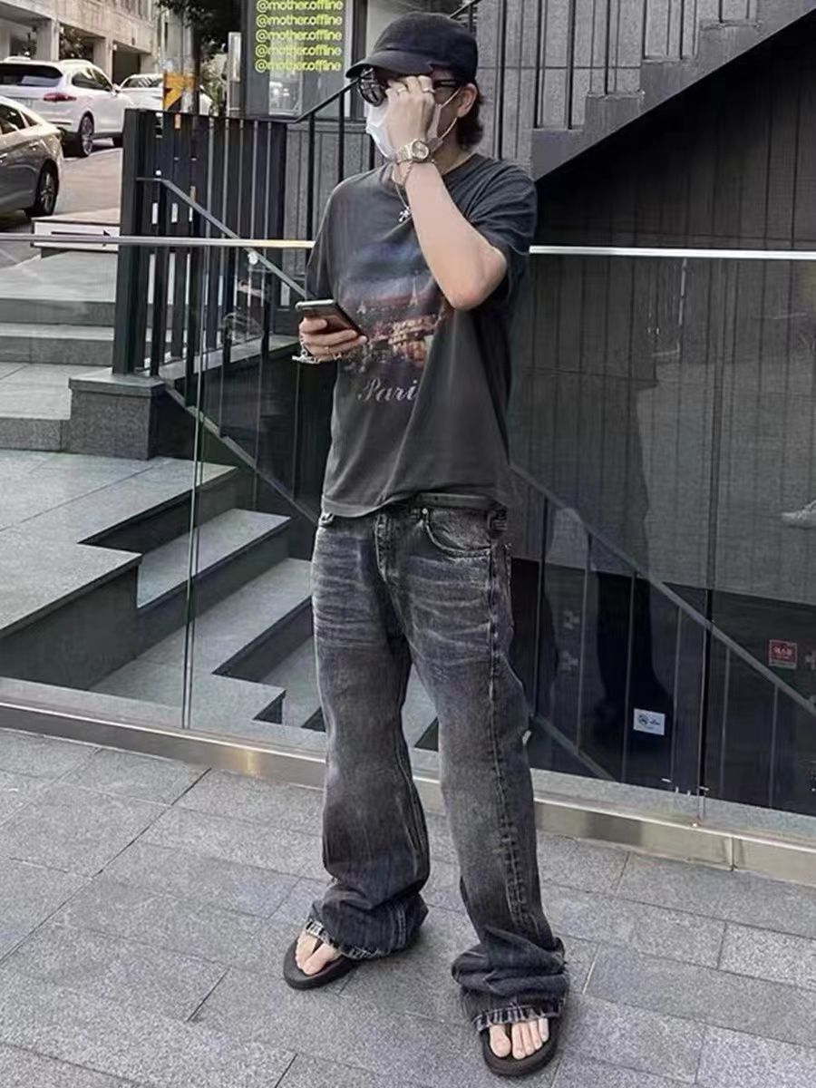 자체 만든 오래된 씻은 검은 색과 회색 걸레 마이크로 빈티지 느슨한 손상 주름 고양이 수염 바이브 청바지 남성스토어 가기