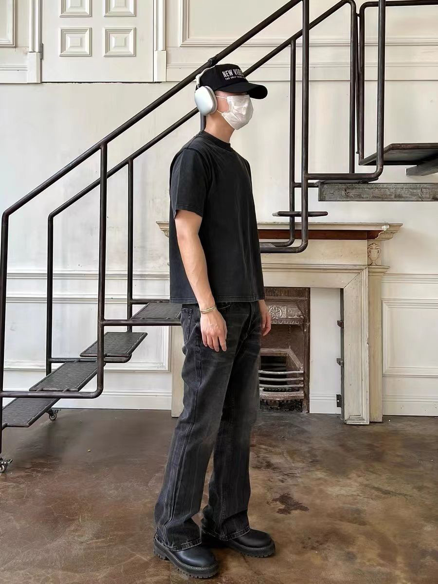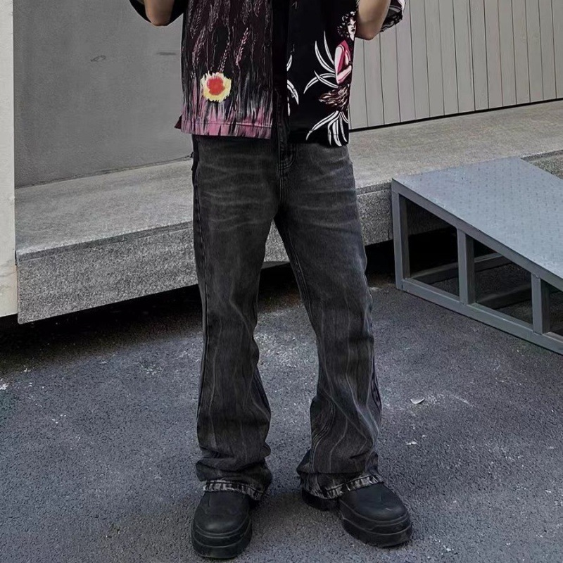 자체 만든 오래된 씻은 검은 색과 회색 걸레 마이크로 빈티지 느슨한 손상 주름 고양이 수염 바이브 청바지 남성