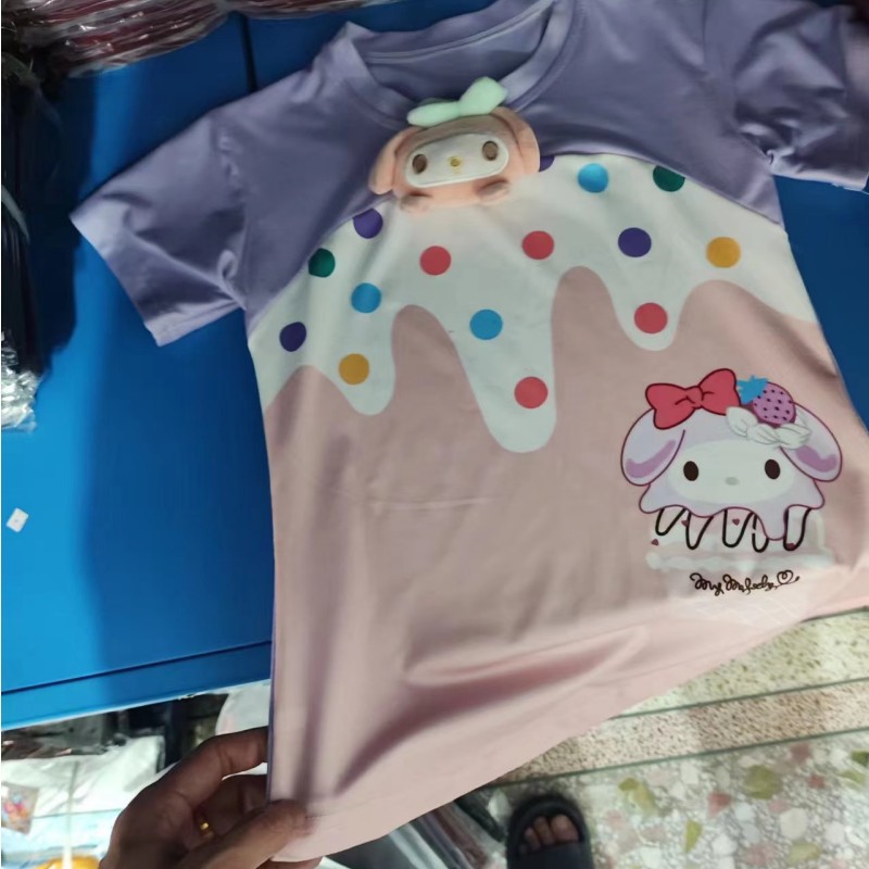 여름 새로운 여름 신선한 소녀의 원피스 컬러 웨이브 도트 아이스크림 입체 멀로티 인형 티셔츠 원피스