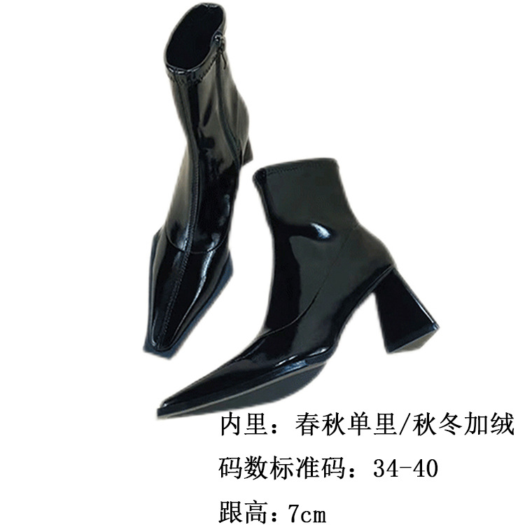 특허 가죽 하이힐 발목 부츠 여성 봄과 가을 2024 새로운 스퀘어 헤드 두꺼운 영국 스타일 얇은 부츠 중간 배럴 마틴 부츠 여성스토어 가기