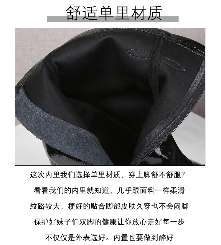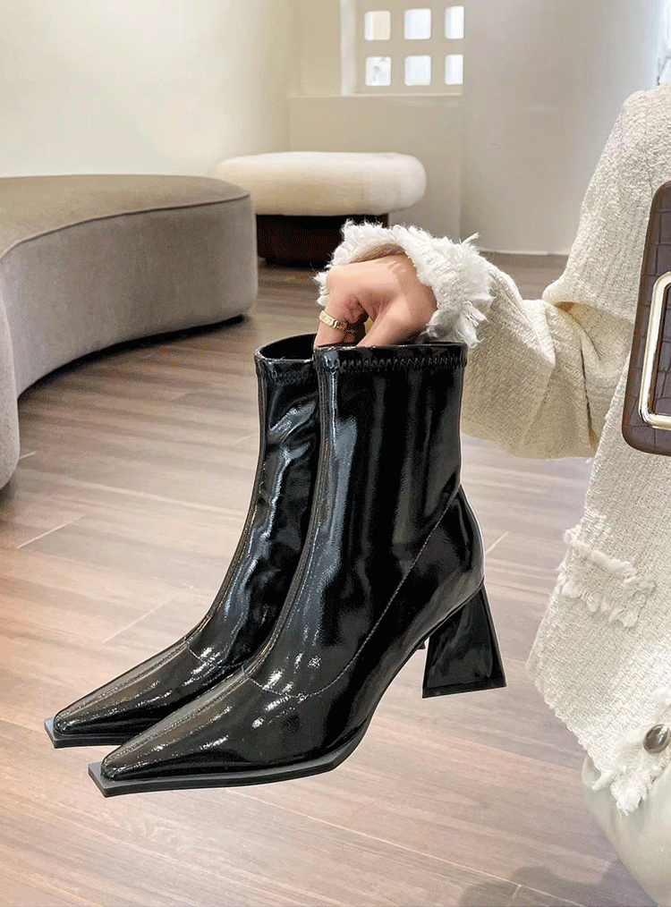 특허 가죽 하이힐 발목 부츠 여성 봄과 가을 2024 새로운 스퀘어 헤드 두꺼운 영국 스타일 얇은 부츠 중간 배럴 마틴 부츠 여성