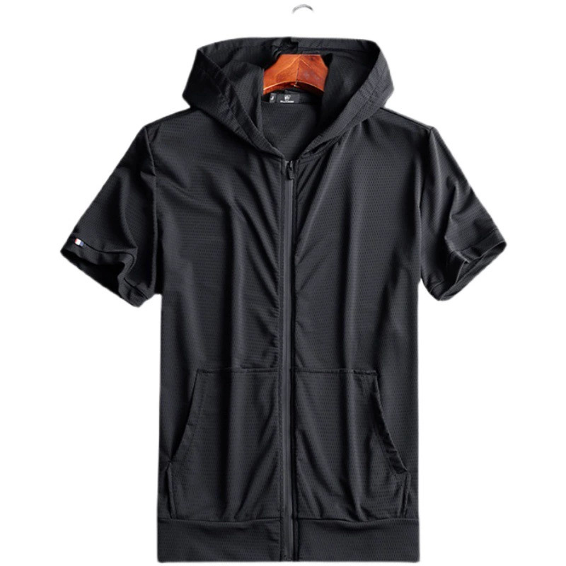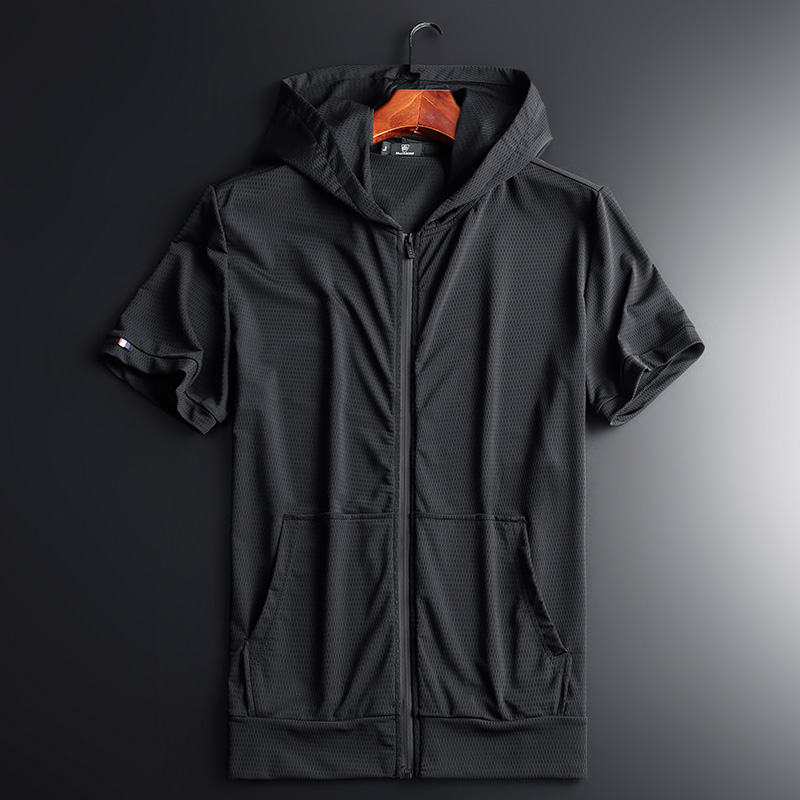 여름 얇은 아이스 실크 후드 티셔츠 남자 반 소매 지퍼 느슨한 카디건 짧은 소매 메쉬 스포츠 스웨터 재킷 트렌디스토어 가기