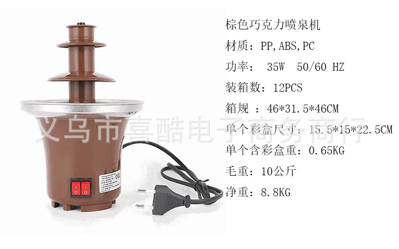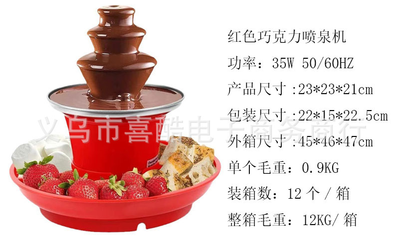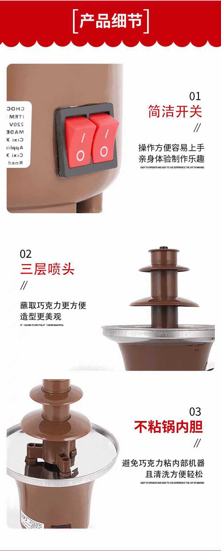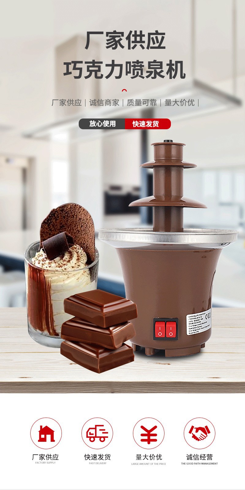 【温馨提示】:原装附带英文说明书;喷泉机长时间使用建议2小时内关掉喷泉键让电机散热15分钟以上;禁忌巧克力酱太稠或变硬的时候开启喷泉键,这样操作电机是带不动的,只会损坏电机;如有疑问可联系旺旺客服咨询。
