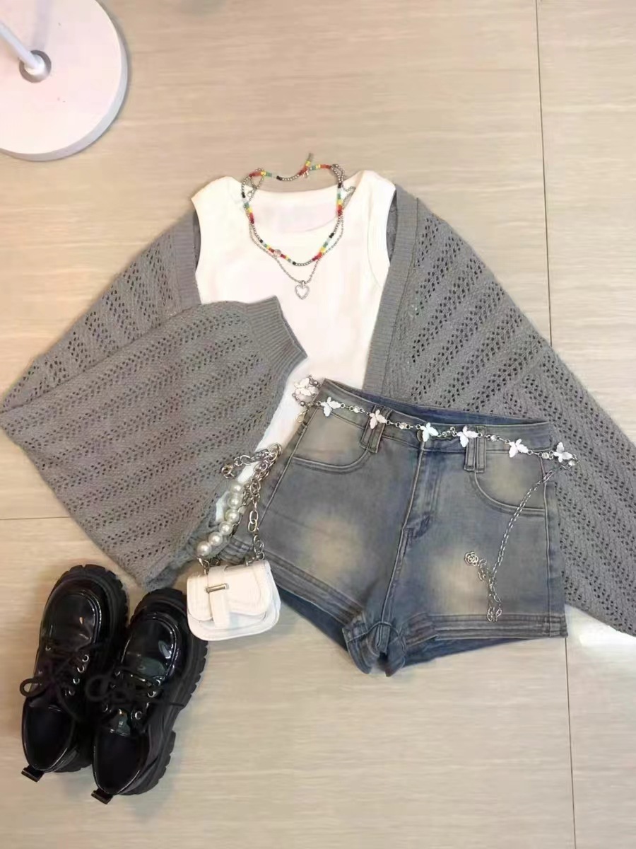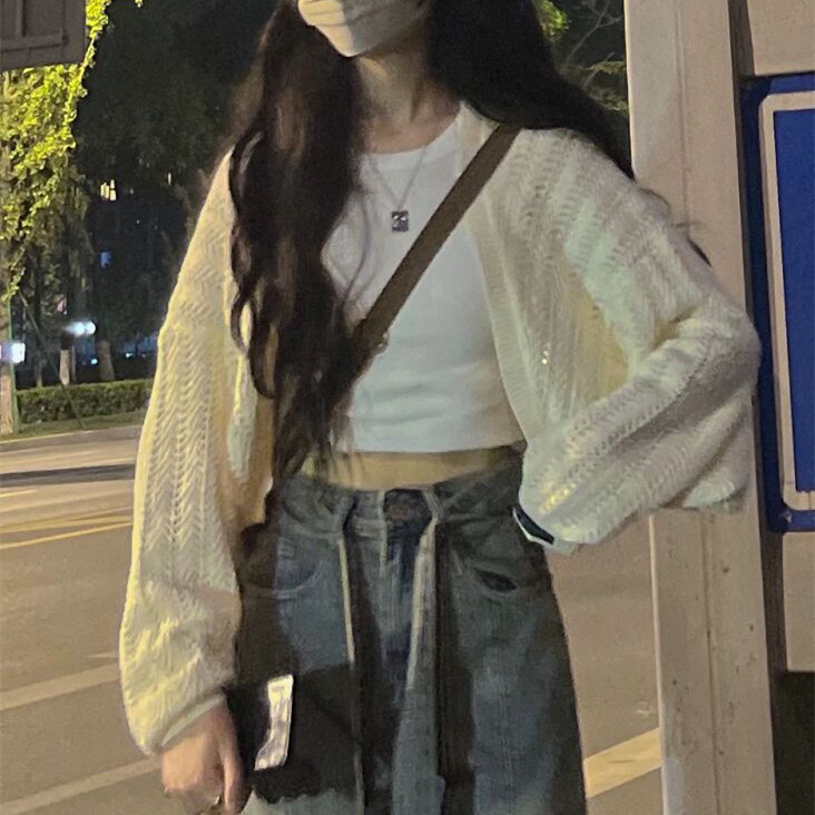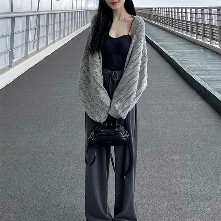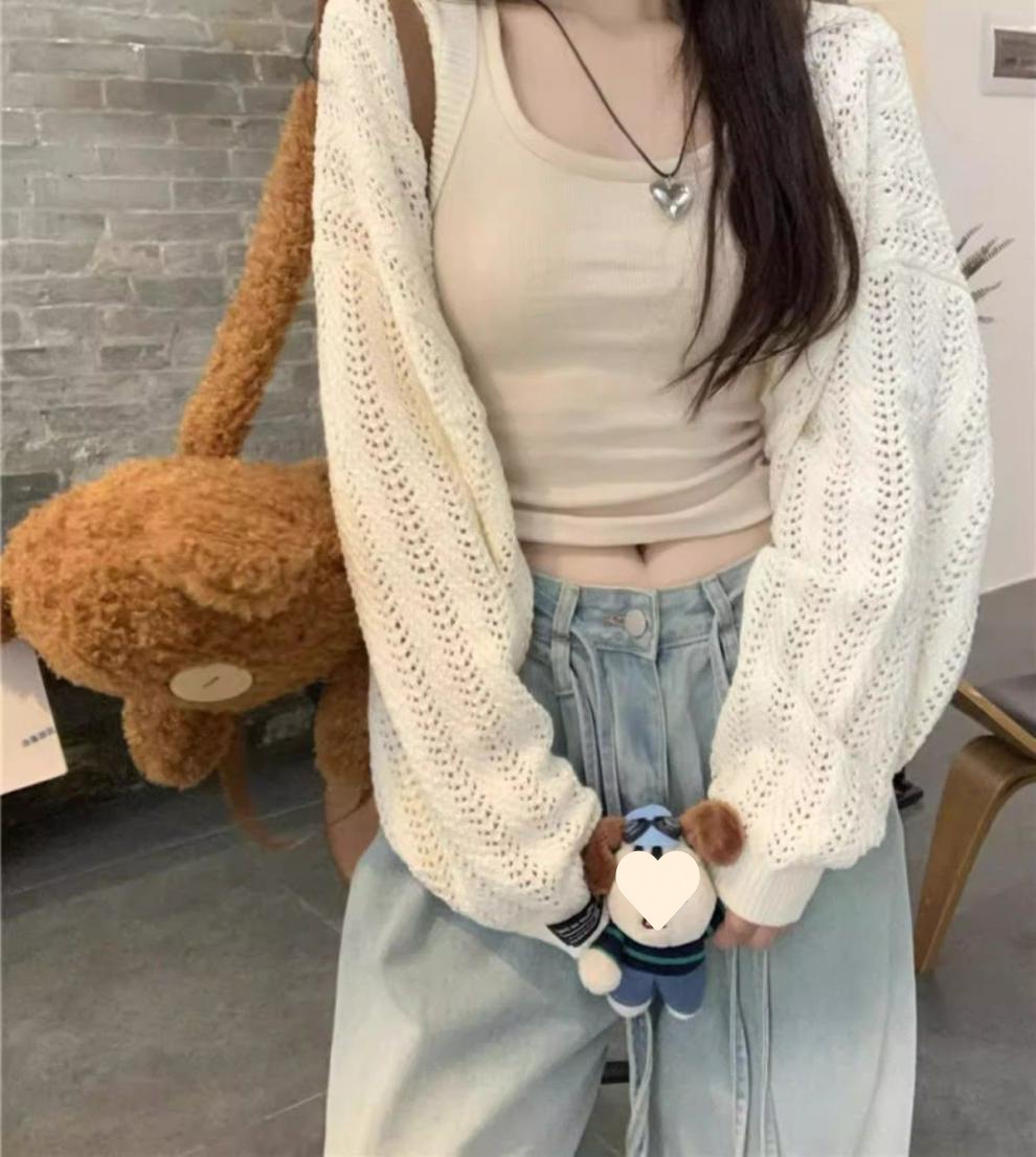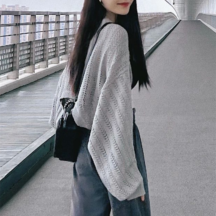 회색 얇은 할로우 아웃 선 스크린 니트 카디건 여성 여름 최고 고급 감각 외부 솔리드 컬러 블라우스 짧은 목도리
